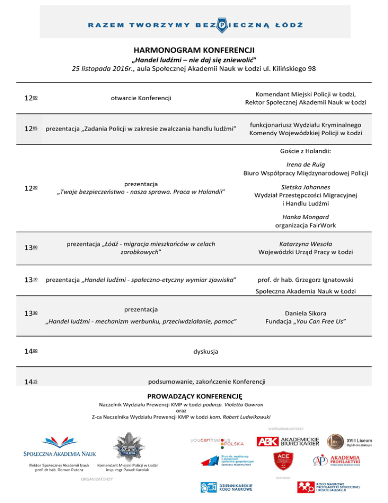 HARMONOGRAM KONFERENCJI „Handel ludźmi – nie daj się zniewolić” 25 listopada 2016r., aula Społecznej Akademii Nauk w Łodzi ul. Kilioskiego 98 1200 Komendant Miejski Policji w Łodzi, Rektor Społecznej Akademii Nauk w Łodzi otwarcie Konferencji 1205 prezentacja „Zadania Policji w zakresie zwalczania handlu ludźmi” funkcjonariusz Wydziału Kryminalnego Komendy Wojewódzkiej Policji w Łodzi Goście z Holandii: Irena de Ruig Biuro Współpracy Międzynarodowej Policji 1220 prezentacja „Twoje bezpieczeostwo - nasza sprawa. Praca w Holandii” Sietska Johannes Wydział Przestępczości Migracyjnej i Handlu Ludźmi Hanka Mongard organizacja FairWork 1300 prezentacja „Łódź - migracja mieszkaoców w celach zarobkowych” 1310 prezentacja „Handel ludźmi - społeczno-etyczny wymiar zjawiska” Katarzyna Wesoła Wojewódzki Urząd Pracy w Łodzi prof. dr hab. Grzegorz Ignatowski Społeczna Akademia Nauk w Łodzi 1330 prezentacja „Handel ludźmi - mechanizm werbunku, przeciwdziałanie, pomoc” Daniela Sikora Fundacja „You Can Free Us” 1400 dyskusja 1415 podsumowanie, zakooczenie Konferencji PROWADZĄCY KONFERENCJĘ Naczelnik Wydziału Prewencji KMP w Łodzi podinsp. Violetta Gawron oraz Z-ca Naczelnika Wydziału Prewencji KMP w Łodzi kom. Robert Ludwikowski