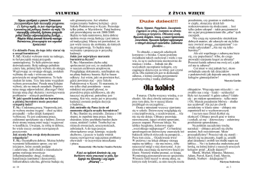 SYLWETKI Nasze spotkanie z panem Tomaszem Szczepaniakiem było niezwykle przyjemne. Ci, którzy myś myślą, że jest nieprzystę nieprzystępny i poważ poważny jak politycy, bardzo się się mylą mylą. To niezwykły niezwykły człowiek, któremu przyszło pełnić pełnić bardzo odpowiedzialną odpowiedzialną funkcję funkcję… Abyś Abyście bliż bliżej poznali historię historię naszego Burmistrza, przeczytajcie ten wywiad koniecznie! Co skłoniło Pana, do tego żeby starać się o urząd burmistrza? T. SZ.: Kiedyś wybrano mnie na radnego, to był początek mojej przygody samorządowej. To było pierwsze moje doświadczenie. Rolę radnego pełniłem cztery lata, później były wybory do okręgu. Wygrywając ze swojego okręgu, zostałem wybrany do rady i wówczas rada powierzyła mi urząd burmistrza. To było siedem lat temu. Trzy lata temu wygrałem wybory powszechne. Przede mną kolejne wybory, ale na innych zasadach. Dopiero teraz mogę odpowiedzieć, dlaczego? Otóż kieruje mną chęć służenia i rozwiązywania problemów – różnych problemów. W jaki sposób kandydat na burmistrza, a później burmistrz może pozyskać sympatię ludzi? T. Sz.: Codzienną pracą. Nieprawdą jest, że wybory można wygrać – choć są takie przypadki – tylko dzięki kampanii wyborczej. To jest codzienna praca, codzienne spotykanie się z ludźmi. Zawsze dwie strony muszą mieć rację i wygrywać w konflikcie. Uważam, że robię to dobrze, bo wiele rzeczy zostało rozwiązanych pozytywnie. Jak ocenia Pan swoje dotychczasowe osiągnięcia? T. Sz.: Oceniałbym dobrze. Można byłoby wymienić kilkanaście spraw, czy też inicjatyw, które zostały podjęte i załatwione. Jeśli chodzi o mieszkańców gminy realizuję inwestycje inflastrukturalne: drogi, wodociągi, kanalizacja (sanitarna i deszczowa). Infrastruktura szkolna, głównie buduje się str. 10 sale gimnastyczne. Już wkrótce rozpoczynamy budowę kolejnej – przy Szkole Podstawowej w Kcyni. Pozostaje tylko jedna, w Mycielewie. Tutaj budowę sali przewidujemy na rok 2008/2009. Będzie to hala namiotowa, która dobrze spełnia swoje swoją funkcję i jest tańsza od tradycyjnej. Muszę też powiedzieć, że jest wiele rzeczy do zrobienia, do których się przygotowuję. To będzie moje wezwanie i propozycja w przyszłej kadencji. Jakie jest największe marzenie burmistrza Kcyni? T. Sz.: Marzeniem chyba całej społeczności jest coś, co znalazłem w naszym archiwum urzędowym. Przeglądając dokumenty, natchnąłem się na plany budowy basenu. Był to basen odkryty. Już wiem, jaki on powinien być, gdzie powinien stać – przy Szkole Podstawowej w Kcyni. To marzenie, to nie tylko chęć posiadania – nasza młodzież nie potrafi pływać, to prawdziwa pięta achillesowa, ale aby nauczyć się pływać, potrzebny jest trening. Kto wie, może już w przyszłej kadencji zostanie podjęta decyzja o budowie... Jak zmieniło się Pana życie od momentu objęcia urzędu burmistrza? T. Sz.: Bardzo się zmieniło. Zmiana o 180 stopni, to zupełnie inna praca. Inny charakter, który pochłania bardzo dużo czasu, niedziel i sobót. Trzeba być na różnych otwarciach, uroczystościach, zebraniach. A do tego jeszcze obowiązkowo sesje, komisje, wyjazdy służbowe, i jeszcze w każdy wtorek muszę rozwiązywać najczęstsze problemy obywateli – to oczywiście mieszkania i praca. Rozmawiały: Ola Socha i Sandra Partyka A już już za tydzień tydzień dowiecie się się, czy burmistrz moż może pracować pracować w polu, kto kupuje mu krawaty i czy czyta „Przerwę „Przerwę”… Z ŻYCIA WZIĘTE Duże dzieci!!! Plucie. Kopanie. Popychanie. Zaczepianie. Ciąągnię Ci gnięcie za włosy. Szarpanie za ubranie. Gonitwy Gonitwy po korytarzu. Oblewanie wodą wodą. Rzucanie śniegiem, trawą trawą, a nawet kamieniami. kamieniami. Szturchanie. Szturchanie. Rzucanie kulkami wykonanymi z róż różnych dziwnych materiałów. materiałów. Zabieranie plecaków… plecaków… To obrazki, z naszych szkolnych korytarzy i z boiska. Często jesteśmy świadkami takich zachowań i wielu z nas wie, że są to zachowania niestosowne do miejsca i wieku… Jednak nie dla wszystkich zaczepianie kolegów, czy ciągnięcie dziewczyn za włosy jest czymś złym. Dla niektórych jest to doskonała zabawa, z której czerpią przyjemność porównywalną z nauką ulubionego 8 marca. Chyba wszyscy wiedzą, o co chodzi. Ale chcę chwilę zatrzymać się przy tym dniu, bo w naszej klasie przebiegał on szczególnie… Ósma z minutami wszyscy zjawiamy się w szkole. Dziewczyny rozglądają się z niecierpliwością, z oczekiwaniem… Ale nic się nie dzieje. Chłopcy pozostają niewzruszeni, zajęci swoimi sprawami, jeszcze zaspani. Pierwsza lekcja. Na tablicy bezgłośny, kolorowy napis „wszystkiego najlepszego!”. Co bardziej spostrzegawcze dziewczyny zauważyły też bukiecik żółtych różyczek na parapecie… Poza tym cisza… Oczekiwanie trwa! W przerwę i na lekcji chłopcy strzegą napisu na tablicy – nie ma mowy, żeby nauczyciel mógł z niej skorzystać. A po dzwonku zaczynają się nerwowo kręcić po klasie. Niestety trudno poznać, co knują. Wymieniają porozumiewawcze spojrzenia. Wreszcie Emil ruszył w stronę okna, na którym stały kwiatki, za nim ruszyła reszta przedmiotu, czy graniem w siatkówkę w ciepły, słoneczny dzień lub rozkoszowaniem się słodyczami… Jest tylko jeden szkopuł – takie przyjemności nie są już przyjemnościami dla „ofiar” tych zaczepek. Nie czuję się wprawdzie strażnikiem dobrych manier, ale zdarzyło mi się kilka razy zwrócić uwagę „zaczepnisiom” i co wtedy usłyszałam? „Ale my się tylko bawimy!”. Ale cóż wspólnego z zabawą ma bicie się, czy popychanie? Albo, do czego prowadzi szarpanie kogoś za ubrania? Przecież każda zabawa ma swój cel, a jaki cel ma ta zabawa? Coś musi w niej jednak być, skoro owładnęła umysły tak dzieciaków z podstawów