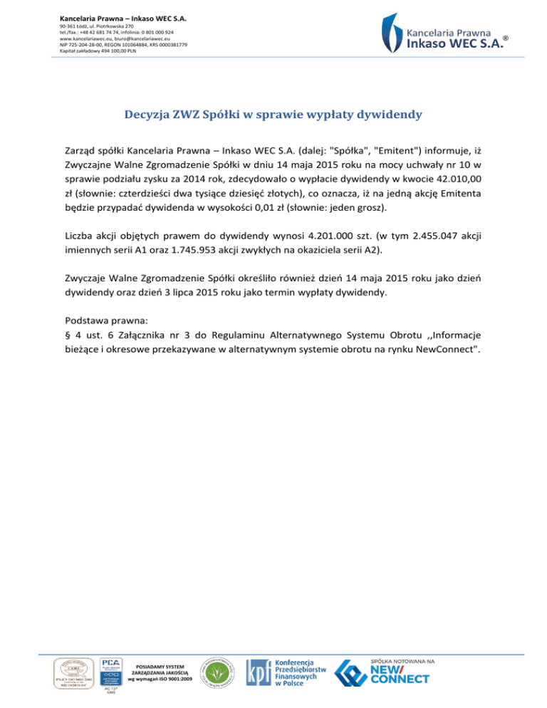 Kancelaria Prawna – Inkaso WEC S.A. 90-361 Łódź, ul. Piotrkowska 270 tel./fax.: +48 42 681 74 74, infolinia: 0 801 000 924 www.kancelariawec.eu, [email protected] NIP 725-204-28-00, REGON 101064884, KRS 0000381779 Kapitał zakładowy 494 100,00 PLN Decyzja ZWZ Spółki w sprawie wypłaty dywidendy Zarząd spółki Kancelaria Prawna – Inkaso WEC S.A. (dalej: "Spółka", "Emitent") informuje, iż Zwyczajne Walne Zgromadzenie Spółki w dniu 14 maja 2015 roku na mocy uchwały nr 10 w sprawie podziału zysku za 2014 rok, zdecydowało o wypłacie dywidendy w kwocie 42.010,00 zł (słownie: czterdzieści dwa tysiące dziesięć złotych), co oznacza, iż na jedną akcję Emitenta będzie przypadać dywidenda w wysokości 0,01 zł (słownie: jeden grosz). Liczba akcji objętych prawem do dywidendy wynosi 4.201.000 szt. (w tym 2.455.047 akcji imiennych serii A1 oraz 1.745.953 akcji zwykłych na okaziciela serii A2). Zwyczaje Walne Zgromadzenie Spółki określiło również dzień 14 maja 2015 roku jako dzień dywidendy oraz dzień 3 lipca 2015 roku jako termin wypłaty dywidendy. Podstawa prawna: § 4 ust. 6 Załącznika nr 3 do Regulaminu Alternatywnego Systemu Obrotu ,,Informacje bieżące i okresowe przekazywane w alternatywnym systemie obrotu na rynku NewConnect". POSIADAMY SYSTEM ZARZĄDZANIA JAKOŚCIĄ wg wymagań ISO 9001:2009