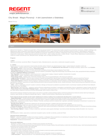 061 851-31-18 [email protected] City Break - Magia Florencji - 4 dni (samolotem z Gdańska) Włochy Florencja Program Michał Anioł twierdził, iż "Toskania to ogród Italii, a Florencja jest jej kwiatem"! To malownicze miasto przepełnione jest duchem renesansu, śladami wielkiego rodu Medyceuszy, gdzie w powietrzu wyczuwalny jest zapach pobliskich winnic i gajów oliwnych. Za dnia zachwyca zielonymi parkami, zadziwiającymi zabytkami, efektownymi fontannami, a wieczorem pięknie oświetlona oczarowuje malowniczymi zaułkami i eleganckimi ulicami oraz kusi niezliczonymi barami, knajpkami i eleganckimi restauracjami. Warto swój czas poświecić również Pizie – gdzie znajduje się jeden z cudów Świata – Krzywa Wieża. Zapraszamy w piękną podróż w czasie do miasta Leonarda da Vinci, Michała Anioła i Dantego, które na długo pozostanie w sercu. Program: 1 dzień: Odprawa na lotnisku i przelot do Włoch. Przejazd do hotelu. Zakwaterowanie, czas wolny w zależności od godzin przylotu. 2 - 3 dzień: Kolejne dwa dni to czas na poznanie niesamowitej atmosfery stolicy Toskanii, jej najważniejszych miejsc i najsłynniejszych zabytków, takich jak - Plac Duomo – religijne centrum miasta z najsłynniejszymi zabytkami takimi jak Baptysterium San Giovanni, do którego prowadzą „rajskie drzwi” oraz Katedra Santa Maria del Fiore z imponującą kopułą i Dzwonnicą Giotta - Pałac Medyceuszy pochodzący z XV wieku pierwowzór architektury florenckiej ze słynną Kaplicą Trzech Króli - Bazylika San Lorenzo zaprojektowana przez słynnych włoskich architektów: Filippo Brunelleschiego oraz Michała Anioła, który zaprojektował także przepiękny przedsionek Biblioteki Medicea Laurenziana - Plac Republiki z Kolumną Obfitości, usiany kawiarniami i restauracjami, będący miejscem spotkań mieszkańców i turystów - Pałac Strozzi – ostatni i największy pałac renesansowy w mieście - Piazza Santa Trinita – trójkątny plac z Kościołem Świętej Trójcy, kolumną sprawiedliwości i XIV-wiecznymi pałacami - Loggia del Mercato Nuovo – florencki targ, na którym znajduje się posąg dzika, legenda głosi że potarcie jego pyska zapewnia powrót do Florencji - Orsanmichele – przepiękny piętrowy kościół San Michele, na zewnątrz ozdobiony posągami wykonanymi między innymi przez samego Donatello - Piazza della Signoria z Pałacem Vecchio będącym największą budowlą na całym placu, fontanną Neptuna przedstawiającą władcę mórz ciągniętego przez zaprzęg koni morskich, kopią słynnej rzeźby Dawida pierwotnie stworzoną przez Michała Anioła, rzeźbą Herkulesa i Kasus wykonaną przez przyjaciela Leonardo da Vinci - Bandinelliego - Uffizi – jedno z najbardziej znanych muzeów na świecie, którego pomieszczenia ozdobione są dziełami takich znamienitych artystów jak Michał Anioł, Botticelli, Leonardo da Vinci, czy Rafael - Most Vecchio - Most Złotników – najstarszy most we Florencji zabudowany kramikami i warsztatami rzemieślników, łączy w najwęższym miejscu brzegi rzeki Arno - Piazza Santa Croce z Kościołem Świętego Krzyża – miejsce gdzie zostali pochowani m.in. Michał Anioł, Dante Alighieri, Galileusz czy Machiavelli, znajduje się tam także tablica nagrobna ukochanej Juliusza Słowackiego, która zmarła w wieku 22 lat W przerwach podczas zwiedzania proponujemy czas wolny na posiłek, podczas którego będzie możliwość spróbowania lokalnych potraw takich jak tradycyjna focaccia, zupa ribollita, czy klasyczny specjał tego regionu - frittata di carciofi (płatne indywidualnie wg zamówienia). Perła Toskanii oferuje ponadto szeroki wybór dodatkowych atrakcji, możliwych do zrealizowania fakultatywnie w czasie wolnym: - Szpital Niewiniątek - renesansowa budowla, zaprojektowana przez znamienitego florenckiego architekta, który zaprojektował również kopułę w kościele Santa Maria del Fiore, dawniej był przytułkiem dla porzuconych dzieci, a obecnie znajduje się tam galeria sztuki renesansowej (ok. 9 euro/os.) - Pałac Pitti – przepełniony sztuką Tycjana, Rafaela, Tintoretta, zachwyca zarówno wnętrzem jak i ogrodami, jest także największym kompleksem muzealnym we Florencji (ok. 8-10 euro/os.) - Bazylika Santo Spirito z 38 ołtarzami zdobionymi XV-wiecznymi obrazami i rzeźbami słynnych florenckich artystów - Ogród Botaniczny przepełniony ogromem różnorodnych gatunków roślin zarówno tych toskańskich, jak i egzotycznych (ok. 5 euro/os.) - Palazzo del Bargello – dawne miejsce prefektury i więzienie, które obecnie jest Muzeum Narodowym, w którym goszczą dzieła m.in. Michała Anioła Bonarottiego, Donatella, czy Filippo Brunelleschiego (ok. 5 euro/os.) - Dom Dantego Alighieri - miejsce, w którym urodził się i wychował „ojciec języka włoskiego” oraz twórca dzieła literackiego „Boska Komedia” (ok. 5 euro/os.) 4 dzień: Wymeldowanie z hotelu, czas wolny w zależności od godzin wylotu, transfer na lotnisko, przelot do Polski. Zakwaterowanie podstawowe: Hotele 3* - położone w pobliżu środków komunikacji miejskiej, w odległości kilku przystanków od największych atrakcji Florencji. Wszystkie hotele oferują wygodnie urządzone pokoje 2 osobowe (z możliwością 1 dostawki) z łazienkami, TV i telefonem. Wyżywienie - śniadania kontynentalne Informacje dodatkowe: - Spotkanie z pilotem nastąpi na lotnisku w Polsce lub po przylocie we Florencji. - Transfery z/na lotnisko są realizowane busem/autokarem lub komunikacją miejską i/lub podmiejską w zależności od wielkości grupy, natomiast przejazdy podczas zwiedzania komunikacją miejską i/lub podmiejską. - Kolejność dni zwiedzania może ulec zmianie. - Pilot nie oprowadza wewnątrz obiektów. - W przypadku wylotu w godzinach porannych zamiast śniadania może być wydany pakiet śniadaniowy. - Linia lotnicza i godziny przelotów mogą ulec zmianie. - „Single” - bez dopłaty, przy dokwaterowaniu do pokoju 2 lub 3 os