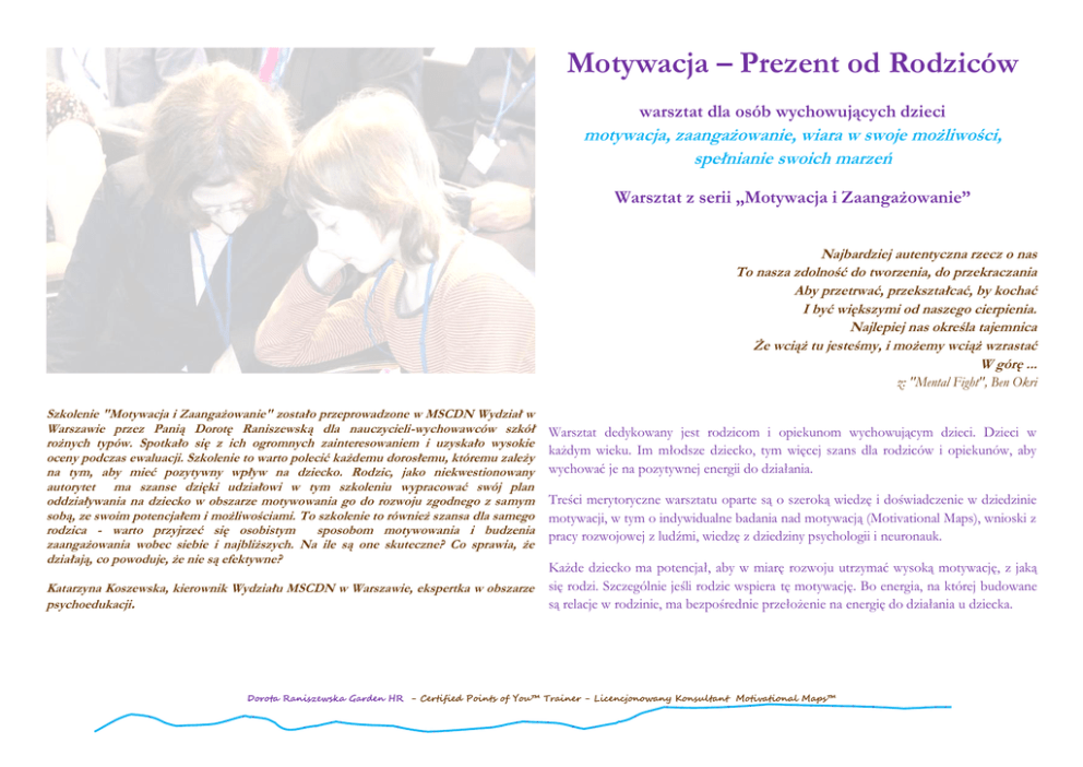 Motywacja – Prezent od Rodziców warsztat dla osób wychowujących dzieci motywacja, zaangażowanie, wiara w swoje możliwości, spełnianie swoich marzeń Warsztat z serii „Motywacja i Zaangażowanie” Najbardziej autentyczna rzecz o nas To nasza zdolność do tworzenia, do przekraczania Aby przetrwać, przekształcać, by kochać I być większymi od naszego cierpienia. Najlepiej nas określa tajemnica Że wciąż tu jesteśmy, i możemy wciąż wzrastać W górę ... z: "Mental Fight", Ben Okri Szkolenie "Motywacja i Zaangażowanie" zostało przeprowadzone w MSCDN Wydział w Warszawie przez Panią Dorotę Raniszewską dla nauczycieli-wychowawców szkół rożnych typów. Spotkało się z ich ogromnych zainteresowaniem i uzyskało wysokie oceny podczas ewaluacji. Szkolenie to warto polecić każdemu dorosłemu, któremu zależy na tym, aby mieć pozytywny wpływ na dziecko. Rodzic, jako niekwestionowany autorytet ma szanse dzięki udziałowi w tym szkoleniu wypracować swój plan oddziaływania na dziecko w obszarze motywowania go do rozwoju zgodnego z samym sobą, ze swoim potencjałem i możliwościami. To szkolenie to również szansa dla samego rodzica - warto przyjrzeć się osobistym sposobom motywowania i budzenia zaangażowania wobec siebie i najbliższych. Na ile są one skuteczne? Co sprawia, że działają, co powoduje, że nie są efektywne? Katarzyna Koszewska, kierownik Wydziału MSCDN w Warszawie, ekspertka w obszarze psychoedukacji. Warsztat dedykowany jest rodzicom i opiekunom wychowującym dzieci. Dzieci w każdym wieku. Im młodsze dziecko, tym więcej szans dla rodziców i opiekunów, aby wychować je na pozytywnej energii do działania. Treści merytoryczne warsztatu oparte są o szeroką wiedzę i doświadczenie w dziedzinie motywacji, w tym o indywidualne badania nad motywacją (Motivational Maps), wnioski z pracy rozwojowej z ludźmi, wiedzę z dziedziny psychologii i neuronauk. Każde dziecko ma potencjał, aby w miarę rozwoju utrzymać wysoką motywację, z jaką się rodzi. Szczególnie jeśli rodzic wspiera tę motywację. Bo energia, na której budowane są relacje w rodzinie, ma bezpośrednie przełożenie na energię do działania u dziecka. Dorota Raniszewska Garden HR - Certified Points of You™ Trainer - Licencjonowany Konsultant Motivational Maps™ „Motywacja – Prezent od Rodziców” warsztat dla osób wychowujących dzieci motywacja, zaangażowanie, wiara w swoje możliwości, spełnianie swoich marzeń Główne korzyści z udziału: 1. Wiedza o tym, co naprawdę wpływa na motywację i zaangażowanie 2. Pogłębiona refleksja nad własnym wpływem na dziecko 3. Własny plan działania, pierwszy krok ku świadomemu pozytywnemu wpływaniu na dziecko 4. Regeneracja, nowe spojrzenie na codzienność, zainspirowanie się do nowego Termin: 17 lipca 2014. Godziny: 16.00-21.00 Miejsce: Warszawa, Ul. Boya-Żeleńskiego 4a/4. Tuż przy Pl. Unii Lubelskiej. Zapisy i dodatkowe informacje: Tel.: 608-793-352. Email: [email protected] Cena: 250 zł. Wpłaty prosimy dokonywać na konto nr: 87 1140 2017 0000 4702 1020 5567 tytułem: Warsztat w dn. 17.07.14 Program warsztatu: 5 godzin zegarowych i 3 bloki tematyczne: 1. Od „do niczego nie nadaję się” do „nie pomagaj mi, lecz patrz, co potrafię” Sesja doświadczalna i refleksja na podstawie specjalnie dobranego filmu: warunki, które muszą być spełnione, aby mieć energię do działania i być zmotywowanym. Rozbudzanie wewnętrznej motywacji, wiary w swoje możliwości, poczucia, że mogę, że potrafię, że uda mi się. Wewnętrzne i zewnętrzne źródła motywacji. Prowadząca: Dorota Raniszewska - od 1997 r. w Polsce i w Europie ŚrodkowoWpływ osób z otoczenia dziecka na jego przekonania na swój temat i motywację. Wschodniej jako międzynarodowy doradca, coach, trener i menedżer. Ekspert w dziedzinie Motywacji i Rozwoju. Jedyny w Polsce i wyłączny licencjonowany konsultant 2. Motywacja i zaangażowanie Sesja wykładowa o tym, co to jest motywacja i zaangażowanie, jakie są źródła Motivational Maps™. Coach specjalizujący się w obszarze motywacji, wiary w swoje motywacji człowieka, co warunkuje zaangażowanie, jakie są podstawy możliwości, realizacji własnych marzeń. Od dwóch lat prowadzi szkolenia, warsztaty i neurobiologiczne, jak można wpływać na to, aby dziecko wyrastało na osobę wykłady dotyczące motywacji i zaangażowania, m.in. na międzynarodowej konferencji Talent Leaders 2013r. w Wiedniu, na międzynarodowym Kongresie Kadry 2014r. w zmotywowaną, z wiarą w swoje możliwości, z chęcią do działania. Warszawie, w ramach szkoleń wewnętrznych dla firm, dla nauczycieli we współpracy z 3. Marzenie Rodzica Mazowieckim Samorządowym Centrum Doskonalenia Nauczycieli. Działa pod marką Sesja o charakterze coachingowym i refleksyjnym w konkretnej strukturze Garden HR „Motywacja, Relacje, Firma z Pasją” oraz Off Words. Współtwórczyni i coachingowej. Praca nad indywidualnym planem działania w zakresie nowej energii współprowadząca Off Words, oparte o Points of You™ i System Analizy Ruchu i nowych pomysłów w wychowaniu dziecka tak, aby uwalniać jego motywację. Sesja (Laban Movement Analysis. Blogerka, autorka licznych artykułów, prowadzi własny z wykorzystaniem gry coachingowej Points of You™. blog w obszarze motywacji i zarządzania. Prywatnie wychowuje 11-letniego Michała, fotografuje, regularnie biega, pływa i pisze. Dorota Raniszewska Garden HR - Certified Points of You™ Trainer - Licencjonowany Konsultant Motivational Maps™
