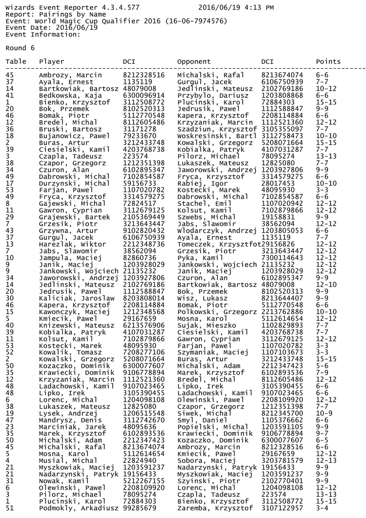 Wizards Event Reporter 4.3.4.577 2016/06/19 4:13 PM Report: Pairings by Name Event: World Magic Cup Qualifier 2016 (16-06-7974576) Event Date: 2016/06/19 Event Information: Round 6 Table Player DCI Opponent DCI Points -------------------------------------------------------------------------------------45 Ambrozy, Marcin 8212328516 Michalski, Rafal 8213674074 6-6 37 Ayala, Ernest 1135119 Gurgul, Jacek 6106750939 7-7 14 Bartkowiak, Bartosz 48079008 Jedlinski, Mateusz 2102769186 10-12 41 Bedkowska, Kaja 6300096914 Przybylo, Dariusz 1203808868 6-6 1 Bienko, Krzysztof 3112508772 Plucinski, Karol 72884303 15-15 20 Bok, Przemek 8102520313 Jedrusik, Pawel 1112588847 9-9 46 Bomak, Piotr 5112770548 Kapera, Krzysztof 2208114884 6-6 12 Bredel, Michal 8112605486 Krzyzaniak, Marcin 1112521360 12-12 36 Bruski, Bartosz 31171278 Szadziun, Krzysztof 3105355097 7-7 18 Bujanowicz, Pawel 79233670 Woskresinski, Bartl 3112758473 10-10 2 Buras, Artur 3212433748 Kowalski, Grzegorz 5208071664 15-15 39 Ciesielski, Kamil 4203768738 Kobialka, Patryk 4107031287 7-7 3 Czapla, Tadeusz 223574 Pilorz, Michael 78095274 13-13 38 Czapor, Grzegorz 1212351398 Lukaszek, Mateusz 12825080 7-7 34 Czuron, Alan 6102895347 Jaworowski, Andrzej 1203927806 9-9 49 Dabrowski, Michal 7102854587 Fryca, Krzysztof 3314579275 6-6 17 Durzynski, Michal 59156733 Rabiej, Igor 28017453 10-10 53 Farjan, Pawel 1107020782 Kostecki, Marek 48095930 3-3 49 Fryca, Krzysztof 3314579275 Dabrowski, Michal 7102854587 6-6 8 Gajewski, Michal 72824517 Stachel, Emil 1107020942 12-12 11 Gawron, Cyprian 3112679125 Kolsut, Kamil 7102879866 12-12 29 Grajewski, Bartek 2105369449 Szwebs, Michal 19158831 9-9 7 Grzesik, Piotr 3213643447 Jabs, Slawomir 38562094 12-12 43 Grzywna, Artur 9102820432 Wlodarczyk, Andrzej 1203805053 6-6 37 Gurgul, Jacek 6106750939 Ayala, Ernest 1135119 7-7 13 Harezlak, Wiktor 2212348736 Tomeczek, Krzysztfot29156826 12-12 7 Jabs, Slawomir 38562094 Grzesik, Piotr 3213643447 12-12 10 Jampula, Maciej 82860736 Pyka, Kamil 7300114643 12-12 9 Janik, Maciej 1203928029 Jankowski, Wojciech 21135232 12-12 9 Jankowski, Wojciech 21135232 Janik, Maciej 1203928029 12-12 34 Jaworowski, Andrzej 1203927806 Czuron, Alan 6102895347 9-9 14 Jedlinski, Mateusz 2102769186 Bartkowiak, Bartosz 48079008 12-10 20 Jedrusik, Pawel 1112588847 Bok, Przemek 8102520313 9-9 30 Kaliciak, Jaroslaw 8203808014 Wisz, Lukasz 8213644407 9-9 46 Kapera, Krzysztof 2208114884 Bomak, Piotr 5112770548 6-6 15 Kawonczyk, Maciej 1212348568 Polkowski, Grzegorz 2213762886 10-10 5 Kmiecik, Pawel 29167659 Mosna, Karol 5112614654 12-12 40 Knizewski, Mateusz 6213576906 Sujak, Mieszko 1102829893 7-7 39 Kobialka, Patryk 4107031287 Ciesielski, Kamil 4203768738 7-7 11 Kolsut, Kamil 7102879866 Gawron, Cyprian 3112679125 12-12 53 Kostecki, Marek 48095930 Farjan, Pawel 1107020782 3-3 52 Kowalik, Tomasz 7208277106 Szymaniak, Maciej 1107103673 3-3 2 Kowalski, Grzegorz 5208071664 Buras, Artur 3212433748 15-15 50 Kozaczko, Dominik 6300077607 Michalski, Adam 2212347423 5-6 35 Krawiecki, Dominik 9106778894 Marek, Krzysztof 6102893536 7-9 12 Krzyzaniak, Marcin 1112521360 Bredel, Michal 8112605486 12-12 48 Ladachowski, Kamil 9107023465 Lipko, Irek 3105390455 6-6 48 Lipko, Irek 3105390455 Ladachowski, Kamil 9107023465 6-6 6 Lorenc, Michal 1204098108 Olewinski, Pawel 2208109920 12-12 38 Lukaszek, Mateusz 12825080 Czapor, Grzegorz 1212351398 7-7 19 Lysek, Andrzej 1206515548 Siwek, Michal 8212345700 10-9 47 Mandrysz, Denis 3112742670 Smyl, Daniel 1105376662 6-6 23 Marciniak, Jarek 48095636 Popielski, Michal 1203591105 9-9 35 Marek, Krzysztof 6102893536 Krawiecki, Dominik 9106778894 9-7 50 Michalski, Adam 2212347423 Kozaczko, Dominik 6300077607 6-5 45 Michalski, Rafal 8213674074 Ambrozy, Marcin 8212328516 6-6 5 Mosna, Karol 5112614654 Kmiecik, Pawel 29167659 12-12 4 Musial, Michal 22824940 Sobora, Maciej 3203781579 12-13 21 Myszkowiak, Maciej 1203591237 Nadarzynski, Patryk 19156433 9-9 21 Nadarzynski, Patryk 19156433 Myszkowiak, Maciej 1203591237 9-9 31 Nowak, Kamil 5212267155 Szyinski, Piotr 2102770401 9-9 6 Olewinski, Pawel 2208109920 Lorenc, Michal 1204098108 12-12 3 Pilorz, Michael 78095274 Czapla, Tadeusz 223574 13-13 1 Plucinski, Karol 72884303 Bienko, Krzysztof 3112508772 15-15 51 Podmokly, Arkadiusz 99285679 Zaremba, Krzysztof 3107122957 3-4 15 23 41 10 17 44 32 42 24 19 27 47 22 4 16 8 24 40 22 36 28 26 33 25 29 31 25 52 13 33 32 26 30 43 16 18 27 28 51 44 42 Polkowski, Grzegorz 2213762886 Popielski, Michal 1203591105 Przybylo, Dariusz 1203808868 Pyka, Kamil 7300114643 Rabiej, Igor 28017453 Rebizant, Pawel 9115375570 Rebizant, Piotr 9115375559 Sarna, Kacper 1112588684 Siwarski, Lukasz 38075524 Siwek, Michal 8212345700 Skowera, Tomasz 39156520 Smyl, Daniel 1105376662 Sobieski, Marek 1135147 Sobora, Maciej 3203781579 Sodomirski, Tomasz 1212345357 Stachel, Emil 1107020942 Staniucha, Tymoteusz42824293 Sujak, Mieszko 1102829893 Sypen, Radoslaw 7300228741 Szadziun, Krzysztof 3105355097 Szczypka, Adam 4213774176 Szmyd, Jedrek 2208111294 Szulborski, Michal 4300109208 Szura, Robert 1204101864 Szwebs, Michal 19158831 Szyinski, Piotr 2102770401 Szyinski, Rafal 4300107841 Szymaniak, Maciej 1107103673 Tomeczek, Krzysztfot29156826 Wiktorzak, Piotr 8102518243 Winiarski, Piotr 3107040415 Wisniewski, Patryk 5213732125 Wisz, Lukasz 8213644407 Wlodarczyk, Andrzej 1203805053 Wnukowski, Filip 1107020737 Woskresinski, Bartl 3112758473 Wroblewski, Jaroslaw2102765376 Wrzosek, Jacek 1213710179 Zaremba, Krzysztof 3107122957 Zielinski, Mateusz 8115373026 Zych, Przemyslaw 9300217847 Kawonczyk, Maciej 1212348568 Marciniak, Jarek 48095636 Bedkowska, Kaja 6300096914 Jampula, Maciej 82860736 Durzynski, Michal 59156733 Zielinski, Mateusz 8115373026 Winiarski, Piotr 3107040415 Zych, Przemyslaw 9300217847 Staniucha, Tymoteusz42824293 Lysek, Andrzej 1206515548 Wroblewski, Jaroslaw2102765376 Mandrysz, Denis 3112742670 Sypen, Radoslaw 7300228741 Musial, Michal 22824940 Wnukowski, Filip 1107020737 Gajewski, Michal 72824517 Siwarski, Lukasz 38075524 