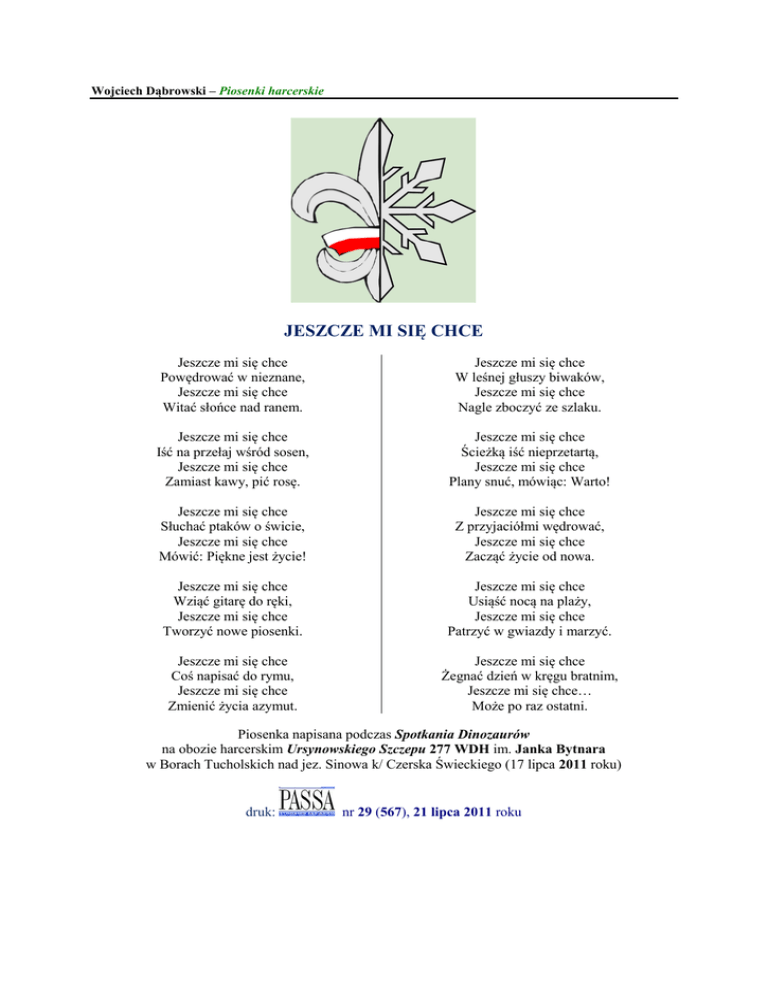 Wojciech Dąbrowski – Piosenki harcerskie JESZCZE MI SIĘ CHCE Jeszcze mi się chce Powędrować w nieznane, Jeszcze mi się chce Witać słońce nad ranem. Jeszcze mi się chce W leśnej głuszy biwaków, Jeszcze mi się chce Nagle zboczyć ze szlaku. Jeszcze mi się chce Iść na przełaj wśród sosen, Jeszcze mi się chce Zamiast kawy, pić rosę. Jeszcze mi się chce Ścieżką iść nieprzetartą, Jeszcze mi się chce Plany snuć, mówiąc: Warto! Jeszcze mi się chce Słuchać ptaków o świcie, Jeszcze mi się chce Mówić: Piękne jest życie! Jeszcze mi się chce Z przyjaciółmi wędrować, Jeszcze mi się chce Zacząć życie od nowa. Jeszcze mi się chce Wziąć gitarę do ręki, Jeszcze mi się chce Tworzyć nowe piosenki. Jeszcze mi się chce Usiąść nocą na plaży, Jeszcze mi się chce Patrzyć w gwiazdy i marzyć. Jeszcze mi się chce Coś napisać do rymu, Jeszcze mi się chce Zmienić życia azymut. Jeszcze mi się chce Żegnać dzień w kręgu bratnim, Jeszcze mi się chce… Może po raz ostatni. Piosenka napisana podczas Spotkania Dinozaurów na obozie harcerskim Ursynowskiego Szczepu 277 WDH im. Janka Bytnara w Borach Tucholskich nad jez. Sinowa k/ Czerska Świeckiego (17 lipca 2011 roku) druk: nr 29 (567), 21 lipca 2011 roku