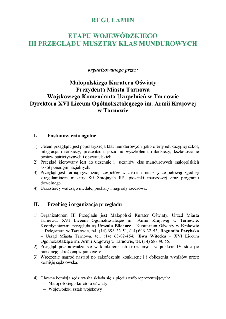REGULAMIN ETAPU WOJEWÓDZKIEGO III PRZEGLĄDU MUSZTRY KLAS MUNDUROWYCH organizowanego przez: Małopolskiego Kuratora Oświaty Prezydenta Miasta Tarnowa Wojskowego Komendanta Uzupełnień w Tarnowie Dyrektora XVI Liceum Ogólnokształcącego im. Armii Krajowej w Tarnowie I. Postanowienia ogólne 1) Celem przeglądu jest popularyzacja klas mundurowych, jako oferty edukacyjnej szkół, integracja młodzieży, prezentacja poziomu wyszkolenia młodzieży, kształtowanie postaw patriotycznych i obywatelskich. 2) Przegląd kierowany jest do uczennic i uczniów klas mundurowych małopolskich szkół ponadgimnazjalnych. 3) Przegląd jest formą rywalizacji zespołów w zakresie musztry zespołowej zgodnej z regulaminem musztry Sił Zbrojnych RP, piosenki marszowej oraz programu dowolnego. 4) Uczestnicy walczą o medale, puchary i nagrody rzeczowe. II. Przebieg i organizacja przeglądu 1) Organizatorem III Przeglądu jest Małopolski Kurator Oświaty, Urząd Miasta Tarnowa, XVI Liceum Ogólnokształcące im. Armii Krajowej w Tarnowie. Koordynatorami przeglądu są Urszula Blicharz - Kuratorium Oświaty w Krakowie – Delegatura w Tarnowie, tel. (14) 696 32 51, (14) 696 32 52, Bogumiła Porębska – Urząd Miasta Tarnowa, tel. (14) 68-82-454; Ewa Witecka – XVI Liceum Ogólnokształcące im. Armii Krajowej w Tarnowie, tel. (14) 688 90 55. 2) Przegląd przeprowadza się w konkurencjach określonych w punkcie IV stosując punktację określoną w punkcie V. 3) Wręczenie nagród nastąpi po zakończeniu konkurencji i obliczeniu wyników przez komisję sędziowską. 4) Główna komisja sędziowska składa się z pięciu osób reprezentujących: Małopolskiego kuratora oświaty Wojewódzki sztab wojskowy ▪ Komenda Wojewódzka Policji - 1 osoba ▪ Komenda Wojewódzka Straży Granicznej - 1 osoba ▪ Komenda Wojewódzka Państwowej Straży Pożarnej - 1 osoba Utworzone zostaną trzy trzyosobowe podkomisje w skład których wejdą: Program obowiązkowy oceniają przedstawiciele z batalionu reprezentacyjnego Wojska Polskiego, policji, straży pożarnej i straży granicznej, Program dowolny oceniają przedstawiciele z batalionu reprezentacyjnego Wojska Polskiego, policji, straży pożarnej i straży granicznej, Piosenkę marszową oceniają przedstawiciele orkiestr: wojskowych, policji, straży pożarnej i straży granicznej. 5) Przegląd odbędzie się 24 kwietnia 2015 r. w Tarnowie. 6) Zbiórka reprezentacji szkół odbędzie się 24 kwietnia 2015 r. o godzinie 9.00 w XVI Liceum Ogólnokształcącym w Tarnowie. Opiekunowie zespołów dokonają losowania numerów startowych. Planowane uroczyste rozpoczęcie przeglądu godz. 10.00. 7) Bezpośrednio po otwarciu przeglądu zespoły przystępują do prezentacji konkursowych. Po zakończeniu prezentacji komisja sędziowska udaje się na naradę. Godzina zakończenia przeglądu i ogłoszenia wyników jest uzależniona od ilości zgłoszonych zespołów. III. Warunki uczestnictwa w zawodach 1) Każdy zgłoszony zespół winien posiadać podręczną apteczkę pierwszej pomocy. 2) Od uczestników wymaga się posiadania: dokumentów tożsamości /legitymacja szkolna/, zgody rodziców lub opiekunów prawnych na wzięcie udziału w zawodach (załącznik nr 2); ubiorów dostosowanych do warunków zawodów policji, straży pożarnej i straży granicznej oraz zgodnych z wymogami: ROZPORZĄDZENIA MINISTRA OBRONY NARODOWEJ z dnia 19 października 2005 r. w sprawie zakazu używania munduru wojskowego lub jego części (Dz. U. z dnia 31 października 2005 r. z późn.zmianami), ROZPORZĄDZENIE MINISTRA SPRAW WEWNĘTRZNYCH I ADMINISTRACJI z dnia 20 maja 2009 r. w sprawie umundurowania policjantów (Dz. U. z dnia 12 czerwca 2009 r. z późn. zmianami) ROZPORZĄDZENIE MINISTRA SPRAW WEWNĘTRZNYCH I ADMINISTRACJI z dnia 30 listopada 2005 r. w sprawie umundurowania strażaków Państwowej Straży Pożarnej Na podstawie art. 61 ust. 6 ustawy z dnia 24 sierpnia 1991 r. o Państwowej Straży Pożarnej (Dz. U. z 2002 r. Nr 147, z późn. zmianami) USTAWA z dnia 12 października 1990 r. o Straży Granicznej (tekst pierwotny: Dz. U. 1990 r. Nr 78 poz. 462) (tekst jednolity: Dz. U. 2002 r. Nr 171 poz. 1399) (tekst jednolity: Dz. U. 2005 r. Nr 234 poz. 1997) (tekst jednolity: Dz. U. 2011 r. Nr 116 poz. 675) 3) Reprezentacja szkoły składa się z 13-uczniów i opiekuna. Szkołę biorącą udział w Przeglądzie należy zgłosić do dnia 1 marca 2015 r., drogą elektroniczną na adres: [email protected]. Zgłoszenie powinno zawierać: nazwę szkoły, imienną listę uczestników (załącznik nr 1), zgody rodziców lub opiekunów prawnych na wzięcie udziału w zawodach (załącznik nr 2) oraz imię i nazwisko opiekuna należy przesłać do dnia 31 marca 2015 r. pocztą na adres: Kuratorium Oświaty w Krakowie – Delegatura w Tarnowie, Al. Solidarności 5-9, 33-100 Tarnów. 4) Zespół może składać się tak z dziewcząt jak i chłopców w dowolnej proporcji. 5) Drużyną dowodzić może tylko uczeń wchodzący w skład zespołu. IV. Konkurencje. 1) „PROGRAM OBOWIĄZKOWY” – Konkurencja polega na wykonaniu przez zespół zestawu 10 zadań obejmującego umiejętności z zakresu regulaminu musztry Sił Zbrojnych RP. Zestaw otrzymuje opiekun zespołu przed startem. Komendy drużynom wydaje żołnierz zawodowy z kampanii reprezentacyjnej Wojska Polskiego. 2) „PROGRAM DOWOLNY” – Konkurencja polega na wykonaniu 10 minutowego pokazu opartego o zakres musztry paradnej. Kolejność startu identyczna jak w programie obowiązkowym. 3) „KONKURS PIOSENKI MARSZOWEJ” - Konkurencja polega na wejściu na plac ze śpiewem przed programem dowolnym oraz opuszczeniu placu ze śpiewem po zakończeniu pokazu. Ocenie podlega śpiew, wykonanie piosenki marszowej podczas wejścia na plac ze śpiewem i zejścia z placu drużyny ze śpiewem, gdzie wykonywano program dowolny. V. Punktacja 1) Punkty przyznaje jury w sposób jawny przez uniesienie tabliczki z ilością otrzymanych punktów bezpoś