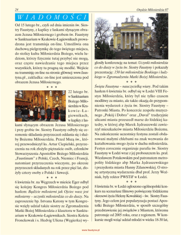 24 Orędzie Miłosierdzia 87 WIADOMOŚCI Od 15 lutego br., czyli od dnia imienin św. Siostry Faustyny, z kaplicy z łaskami słynącym obrazem Jezusa Miłosiernego i grobem św. Faustyny w Sanktuarium w Krakowie-Łagiewnikach prowadzona jest transmisja on-line. Umożliwia ona duchową pielgrzymkę do tego świętego miejsca, do stolicy kultu Miłosierdzia Bożego, wielu ludziom, którzy fizycznie tutaj przybyć nie mogą, oraz częste nawiedzanie tego miejsca przez wszystkich, którzy tu pragną się modlić. Wejście na transmisję on-line na stronie głównej: www.faustyna.pl , zakładka: on-line jest umieszczona pod obrazem Jezusa Miłosiernego. * * * 22 lutego br. w Sanktuarium Bożego Miłosierdzia w Krakowie-Łagiewnikach, w kaplicy z łaskami słynącym obrazem Jezusa Miłosiernego i przy grobie św. Siostry Faustyny odbyły się ceremonie składania przyrzeczeń oddania się i służby Bożemu Miłosierdziu. Przed Mszą św., której przewodniczył ks. Artur Ciepielski, przyrzeczenia na rok złożyło piętnaście osób, członków Stowarzyszenia Apostołów Bożego Miłosierdzia „Faustinum” z Polski, Czech, Niemiec i Francji, natomiast przyrzeczenia wieczyste, po okresie przyrzeczeń składanych na rok przez pięć lat, złożyły cztery osoby z Polski i Szwecji. * * * 6 kwietnia br. na Węgrzech w mieście Eger odbył się kolejny Kongres Miłosierdzia Bożego pod hasłem: Bądźcie miłosierni jak Ojciec wasz jest miłosierny – uczynki miłosierdzia co do duszy. Na zaproszenie bp. Istvana Katony w tym Kongresie wzięły udział także siostry ze Zgromadzenia Matki Bożej Miłosierdzia z klasztoru w Sanktuarium w Krakowie-Łagiewnikach. Siostra Koleta Fronckowak i s. Hedvig Ulicna (Węgierka) wy- głosiły konferencję na temat: Uczynki miłosierdzia co do duszy w życiu św. Siostry Faustyny i pokazały prezentację: 150 lat miłosierdzia Boskiego i ludzkiego w Zgromadzeniu Matki Bożej Miłosierdzia. * * * Święta Faustyna – nauczycielką wiary. Pod takim hasłem 6 kwietnia br. odbył się w Łodzi VIII Festyn Miłosierdzia, który był nie tylko czasem modlitwy za miasto, ale także okazją do przypomnienia wydarzeń z życia św. Siostry Faustyny – Patronki Miasta. Po koncercie zespołu muzycznego „Pokój i Dobro” oraz „Duval” tradycyjnie ulicami miasta przeszedł marsz do łódzkiej katedry, w której abp Marek Jędraszewski zawierzył mieszkańców miasta Miłosierdziu Bożemu. Na zakończenie uczestnicy festynu zostali obdarowani małymi chlebami na znak wezwania do kształtowania swego życia w duchu miłosierdzia. Festyn corocznie organizuje parafia św. Siostry Faustyny w Łodzi wraz z jej proboszczem ks. prał. Wiesławem Potakowskim pod patronatem metropolity łódzkiego abp Marka Jędraszewskiego i prezydenta miasta Hanny Zdanowskiej. O stronę artystyczną wydarzenia dbał prof. Jerzy Woźniak, były rektor PWSTiF w Łodzi. * * * 8 kwietnia br. w Łodzi ogłoszono ogólnopolski konkurs na scenariusz filmowy poświęcony łódzkiemu okresowi życia Heleny Kowalskiej – św. Siostry Faustyny. Jego celem jest popularyzacja postaci Apostołki Bożego Miłosierdzia, w sposób szczególny przedstawienie jej związków z Miastem, któremu patronuje od 2005 roku, oraz z regionem. W konkursie mogli wziąć udział młodzi w wieku 18-30 lat, www.faustyna.pl lipiec, sierpień, wrzesień 2013 25 co miało na celu także zainspirowanie ich do rozważań nad wyborem własnej drogi życia. Młodzi ludzie stają przed wyborem, jaką drogą pójść, jakie wartości są istotne – mówiła na konferencji prasowej wojewoda łódzki Jolanta Chełmińska, która objęła honorowy patronat nad konkursem. Konkurs wpisuje się w obchody przypadającej w 2016 roku rocznicy 1050-lecia Chrztu Polski. Organizuje go Narodowe Centrum Kultury (NCK), a współorganizują Archidiecezja Łódzka, władze miasta, Uniwersytet Łódzki oraz oddział TVP w Łodzi. Ogłoszenie wyników konkursu nastąpi 1 października br. * * * Centralne uroczystości święta Miłosierdzia odbywają się tradycyjnie w Sanktuarium w Krakowie-Łagiewnikach, gdzie wraz ze śmiercią św. Siostry Faustyny zostało złożone orędzie Miłosierdzia przekazane jej przez Jezusa, a w nim także żądanie ustanowienia i obchodzenia tego święta. W tym roku obchody Niedzieli Miłosierdzia odbywały się w nietypowej, trochę zimowej scenerii. Mimo niesprzyjającej aury do Łagiewnik przybyli pątnicy z różnych stron Polski i ponad dwudziestu krajów świata, nawet tak odległych i ezgotycznych jak Tajlandia, Australia, Burundi, Wenezuela, Kolumbia, Ekwador czy Meksyk. Msze święte celebrowali biskupi diecezji krakowskiej i rzeszowskiej. Uroczystej sumie przewodniczył metropolita krakowski kard. Stanisław Dziwisz. W homilii mówił o darze pokoju i radości, którą przynosi zmartwychwstały Chrystus uczniom w Wieczerniku i nam przez fundamentalną posługę Kościoła, jaką jest jednanie człowieka z Bogiem, ludźmi i samym sobą. Przesłanie, jakie płynie z łagiewnickiego Sanktuarium w tę Niedzielę Miłosierdzia brzmi: Przestań się lękać, Polsko. Zaufaj Bogu, który jest bogaty w miłosierdzie. Dzięki transmisji TVP, katolickich rozgłośni radiowych, transmisji on-line z klasztornej kaplicy i transmisji telewizji internetowej, z łagiewnickim Sanktuarium mogli się łączyć w modlitwie wszyscy, którzy nie mogli tu przybyć. Od 13 lat pierwsza niedziela po Wielkanocy już w całym Kościele obchodzona jest jako święto Bożego Miłosierdzia. Do klasztoru w Łagiewnikach napłynęły relacje o obchodach tego święta w różnych częściach świata. Z Libanu Rosy Chaanine napisała: Uroczystej Mszy w katedrze św. Jerzego w centrum stolicy w Bejrucie przewodniczył bp Georges Scandar, przewodniczący Wspólnot Bożego Miłosierdzia w Libanie, w koncelebrze z abp. Paulem Matar. Uczestniczyli w niej licznie wierni, a wśród nich ambasador Polski Tomasz Niegodzisz. Mszę transmitowała Te
