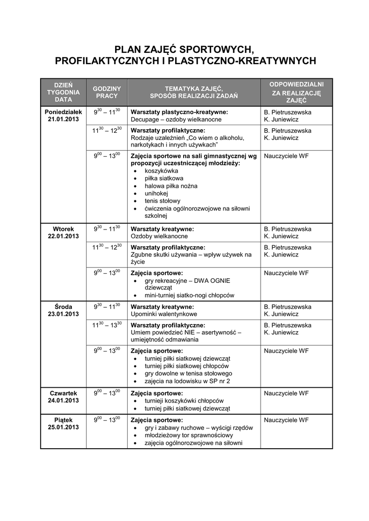 PLAN ZAJĘĆ SPORTOWYCH, PROFILAKTYCZNYCH I PLASTYCZNO-KREATYWNYCH DZIEŃ TYGODNIA DATA Poniedziałek 21.01.2013 GODZINY PRACY 30 30 9 – 11 30 30 11 – 12 Warsztaty plastyczno-kreatywne: Decupage – ozdoby wielkanocne B. Pietruszewska K. Juniewicz Warsztaty profilaktyczne: Rodzaje uzależnień „Co wiem o alkoholu, narkotykach i innych używkach” B. Pietruszewska K. Juniewicz 00 Zajęcia sportowe na sali gimnastycznej wg propozycji uczestniczącej młodzieży: koszykówka piłka siatkowa halowa piłka nożna unihokej tenis stołowy ćwiczenia ogólnorozwojowe na siłowni szkolnej Nauczyciele WF 30 30 Warsztaty kreatywne: Ozdoby wielkanocne B. Pietruszewska K. Juniewicz Warsztaty profilaktyczne: Zgubne skutki używania – wpływ używek na życie B. Pietruszewska K. Juniewicz 9 – 11 30 30 11 – 12 00 00 Zajęcia sportowe: gry rekreacyjne – DWA OGNIE dziewcząt mini-turniej siatko-nogi chłopców Nauczyciele WF 30 30 Warsztaty kreatywne: Upominki walentynkowe B. Pietruszewska K. Juniewicz Warsztaty profilaktyczne: Umiem powiedzieć NIE – asertywność – umiejętność odmawiania B. Pietruszewska K. Juniewicz 9 – 13 Środa 23.01.2013 ODPOWIEDZIALNI ZA REALIZACJĘ ZAJĘĆ 00 9 – 13 Wtorek 22.01.2013 TEMATYKA ZAJĘĆ, SPOSÓB REALIZACJI ZADAŃ 9 – 11 30 30 11 – 13 00 00 Zajęcia sportowe: turniej piłki siatkowej dziewcząt turniej piłki siatkowej chłopców gry dowolne w tenisa stołowego zajęcia na lodowisku w SP nr 2 Nauczyciele WF 00 00 Zajęcia sportowe: turnieji koszykówki chłopców turniej piłki siatkowej dziewcząt Nauczyciele WF 00 00 Zajęcia sportowe: gry i zabawy ruchowe – wyścigi rzędów młodzieżowy tor sprawnościowy zajęcia ogólnorozwojowe na siłowni Nauczyciele WF 9 – 13 Czwartek 24.01.2013 9 – 13 Piątek 25.01.2013 9 – 13 DZIEŃ TYGODNIA DATA Poniedziałek 28.01.2013 GODZINY PRACY 30 30 9 – 11 30 30 11 – 12 Warsztaty plastyczno-kreatywne: Decupage – ozdoby wielkanocne B. Pietruszewska K. Juniewicz Warsztaty profilaktyczne: Jestem wartościowym człowiekiem – nie piję! B. Pietruszewska K. Juniewicz 00 Zajęcia sportowe: turniej piłki nożnej halowej chłopców turniej piłki siatkowej dziewcząt turniej unihoca gry dowolne w tenisa stołowego Nauczyciele WF 30 30 Warsztaty kreatywne: Ozdoby wielkanocne B. Pietruszewska K. Juniewicz Warsztaty profilaktyczne: Jestem wartościowym człowiekiem – nie biorę! B. Pietruszewska K. Juniewicz 9 – 11 30 30 11 – 12 00 00 Zajęcia sportowe: mini-turniej unihokeja chłopców mini-turniej unihokeja dziewcząt mini-turniej piłki siatkowej (drużyny mieszane) zajęcia ogólnorozwojowe na siłowni zajęcia na lodowisku w SP nr 2 Nauczyciele WF 30 30 Warsztaty kreatywne: Upominki walentynkowe B. Pietruszewska K. Juniewicz Warsztaty profilaktyczne: Jak rozpoznać uzależnienie – „Kiedy przekroczyłem granicę?”. Gdzie szukać pomocy? Organizacje i instytucje pomagające osobom uzależnionym. B. Pietruszewska K. Juniewicz Zajęcia sportowe: zajęcia przy muzyce – aerobik (dla dziewcząt) turniej piłki siatkowej (drużyny mieszane) gry dowolne w tenisa stołowego turniej unihoca (drużyny mieszane) Nauczyciele WF 9 – 13 Środa 30.01.2013 ODPOWIEDZIALNI ZA REALIZACJĘ ZAJĘĆ 00 9 – 13 Wtorek 29.01.2013 TEMATYKA ZAJĘĆ, SPOSÓB REALIZACJI ZADAŃ 9 – 11 30 30 11 – 12 00 00 9 – 13