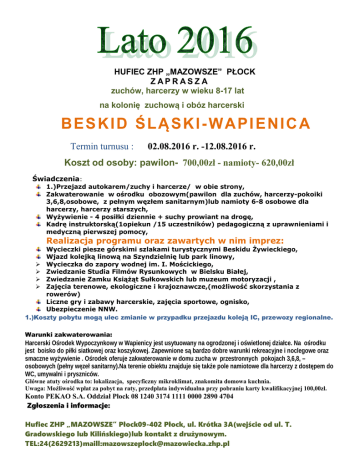 HUFIEC ZHP „MAZOWSZE” PŁOCK ZAPRASZA zuchów, harcerzy w wieku 8-17 lat na kolonię zuchową i obóz harcerski BESKID ŚLĄSKI-WAPIENICA Termin turnusu : 02.08.2016 r. -12.08.2016 r. Koszt od osoby: pawilon- 700,00zł - namioty- 620,00zł Świadczenia: 1.)Przejazd autokarem/zuchy i harcerze/ w obie strony, Zakwaterowanie w ośrodku obozowym(pawilon dla zuchów, harcerzy-pokoiki 3,6,8,osobowe, z pełnym węzłem sanitarnym)lub namioty 6-8 osobowe dla harcerzy, harcerzy starszych, Wyżywienie - 4 posiłki dziennie + suchy prowiant na drogę, Kadrę instruktorską(1opiekun /15 uczestników) pedagogiczną z uprawnieniami i medyczną pierwszej pomocy, Realizacja programu oraz zawartych w nim imprez: Wycieczki piesze górskimi szlakami turystycznymi Beskidu Żywieckiego, Wjazd kolejką linową na Szyndzielnię lub park linowy, Wycieczka do zapory wodnej im. I. Mościckiego, Zwiedzanie Studia Filmów Rysunkowych w Bielsku Białej, Zwiedzanie Zamku Książąt Sułkowskich lub muzeum motoryzacji , Zajęcia terenowe, ekologiczne i krajoznawcze,(możliwość skorzystania z rowerów) Liczne gry i zabawy harcerskie, zajęcia sportowe, ognisko, Ubezpieczenie NNW. 1.)Koszty pobytu mogą ulec zmianie w przypadku przejazdu koleją IC, przewozy regionalne. Warunki zakwaterowania: Harcerski Ośrodek Wypoczynkowy w Wapienicy jest usytuowany na ogrodzonej i oświetlonej działce. Na ośrodku jest boisko do piłki siatkowej oraz koszykowej. Zapewnione są bardzo dobre warunki rekreacyjne i noclegowe oraz smaczne wyżywienie . Ośrodek oferuje zakwaterowanie w domu zucha w przestronnych pokojach 3,6,8, – osobowych (pełny węzeł sanitarny).Na terenie obiektu znajduje się także pole namiotowe dla harcerzy z dostępem do WC, umywalni i pryszniców. Główne atuty ośrodka to: lokalizacja, specyficzny mikroklimat, znakomita domowa kuchnia. Uwaga: Możliwość wpłat za pobyt na raty, przedpłata indywidualna przy pobraniu karty kwalifikacyjnej 100,00zł. Konto PEKAO S.A. Oddział Płock 08 1240 3174 1111 0000 2890 4704 Zgłoszenia i informacje: Hufiec ZHP „MAZOWSZE” Płock09-402 Płock, ul. Krótka 3A(wejście od ul. T. Gradowskiego lub Kilińskiego)lub kontakt z drużynowym. TEL:24(2629213)maill:[email protected]