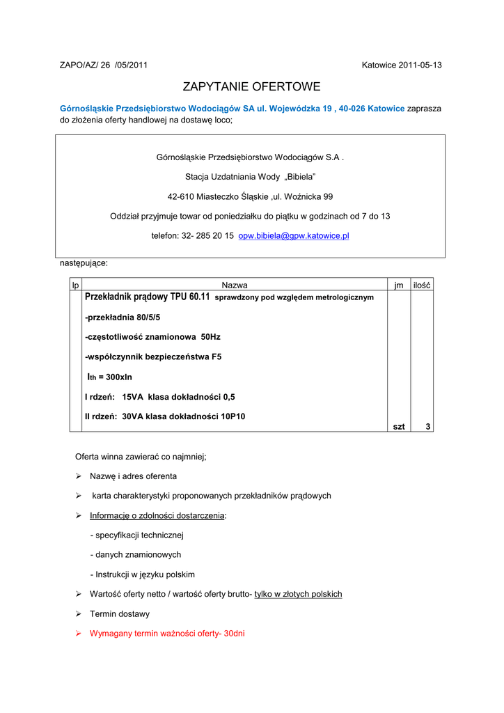 ZAPO/AZ/ 26 /05/2011 Katowice 2011-05-13 ZAPYTANIE OFERTOWE Górnośląskie Przedsiębiorstwo Wodociągów SA ul. Wojewódzka 19 , 40-026 Katowice zaprasza do złoŜenia oferty handlowej na dostawę loco; Górnośląskie Przedsiębiorstwo Wodociągów S.A . Stacja Uzdatniania Wody „Bibiela” 42-610 Miasteczko Śląskie ,ul. Woźnicka 99 Oddział przyjmuje towar od poniedziałku do piątku w godzinach od 7 do 13 telefon: 32- 285 20 15 [email protected] następujące: Nazwa lp Przekładnik prądowy TPU 60.11 jm ilość szt 3 sprawdzony pod względem metrologicznym -przekładnia 80/5/5 -częstotliwość znamionowa 50Hz -współczynnik bezpieczeństwa F5 Ith = 300xIn I rdzeń: 15VA klasa dokładności 0,5 II rdzeń: 30VA klasa dokładności 10P10 Oferta winna zawierać co najmniej; Nazwę i adres oferenta karta charakterystyki proponowanych przekładników prądowych Informację o zdolności dostarczenia: - specyfikacji technicznej - danych znamionowych - Instrukcji w języku polskim Wartość oferty netto / wartość oferty brutto- tylko w złotych polskich Termin dostawy Wymagany termin waŜności oferty- 30dni Warunki gwarancji- gwarancja min. 12 miesięcy Termin płatności wymagany przez Zamawiającego 30 dni po otrzymaniu faktury Oferta winna być sporządzona na papierze firmowym oferenta lub opatrzona pieczątką firmową, posiadać datę jej sporządzenia oraz powinna być podpisana przez oferenta. Oferta musi zawierać parafowany wzór umowy. Oferta winna być przesłana na adres: Górnośląskie Przedsiębiorstwo Wodociągów SA ul. Wojewódzka 19 , 40-026 Katowice Wydział Zaopatrzenia pokój 35B Termin złoŜenia ofert upływa w dniu 20.05.2011 godz. 9:00 Oferty moŜna dostarczyć ; 1. Za pośrednictwem poczty 2. Kurierem 3. Telefaksem – 032 60-38-631 4. Osobiście Informacji technicznych udziela Pan Marek Wieluniecki – 32-285 20 15 lub Pan Janusz Siuta 32 60 38 783 Informacji dotyczących realizacji umowy udziela Pani Małgorzata Stachowiecka - 32 60-38-635 Zamawiający nie będzie rozpatrywał ofert alternatywnych, niezgodnych z przedmiotem zapytania ofertowego oraz częściowych. Wybór oferty nastąpi w oparciu o kryterium ceny – waga 100% Z wybranym dostawcą będzie zawarta umowa wg. załączonego wzoru. Pytający zastrzega sobie prawo do nie skorzystania z Ŝadnej ze złoŜonych ofert, bez podania przyczyny, jak równieŜ nie powiadamiania pisemnie oferentów o wyniku postępowania. Informacja o wyborze oferenta zostanie umieszczona na stronie internetowej GPW S.A. www.gpw.katowice.pl -------------------------------------------------------------------------------------------------------------------------------------- WZÓR UMOWY UMOWA Nr AZ/ /2011 z dnia …………………… ZAMAWIAJĄCY: WYKONAWCA: Górnośląskie Przedsiębiorstwo Wodociągów ……………………………….. Spółka Akcyjna ……………………………….. ul. Wojewódzka 19 ………………………………. 40-026 Katowice ……………………………….. Przedmiot umowy: Dostawa zgodnie z ofertą Wykonawcy nr ……….. z dnia ……………; lp Nazwa Przekładnik prądowy TPU 60.11 jm ilość szt 3 sprawdzony pod względem metrologicznym -przekładnia 80/5/5 -częstotliwość znamionowa 50Hz -współczynnik bezpieczeństwa F5 Ith = 300xIn I rdzeń: 15VA klasa dokładności 0,5 II rdzeń: 30VA klasa dokładności 10P10 1. Cena netto: ..............................zł; słownie……………………………………………………… 2. Cena brutto: ............................ zł; słownie……………………………………………………… 3. Warunki odbioru: Dostawca przekaŜe wraz z przedmiotem umowy wszystkie wymagane dokumenty t.j.: • • • • 4. Deklaracje zgodności CE Karty katalogowe Instrukcję w języku polskim Protokół sprawdzenia metrologicznego Warunki gwarancji: Wykonawca udziela 12 miesięcznej gwarancji jakości na cały przedmiot umowy. 5. Warunki płatności: Zamawiający dokona zapłaty przelewem na konto wskazane w fakturze, w terminie 30 dni od daty otrzymania faktury po dostawie przedmiotu umowy, potwierdzonej podpisanym protokołem zdawczo-odbiorczym. Strony oświadczają, iŜ są płatnikami czynnymi podatku VAT, upowaŜniają się wzajemnie do wystawiania faktur VAT bez podpisu Odbiorcy i posiadają numery identyfikacji podatkowej VAT: ZAMAWIAJĄCY: NIP 634-012-87-88 Zamawiający zarejestrowany jest w Sądzie Rejonowym w Katowicach, Wydział Gospodarczy Krajowego Rejestru Sądowego pod numerem KRS 0000247533 posiadający kapitał zakładowy 608 393 000 zł wpłacony w całości reprezentowany przez: 1…………………………………………….. 2…………………………………………….. WYKONAWCA: NIP ………….. Wykonawca zarejestrowany w ….......…………………………………………………. pod numerem KRS ……………………….. które, reprezentuje: 1. ………………………………………………. 2. ………………………................................. 6. Termin realizacji: dostawa fabrycznie nowych kondensatów zgodnie z wymaganiami Zamawiającego nastąpi w terminie ………..dni od dnia podpisania umowy. 7. Adres dostawy: Wykonawca na swój koszt i ryzyko dostarczy przedmiot zamówienia do : Górnośląskie Przedsiębiorstwo Wodociągów S.A . Stacja Uzdatniania Wody „Bibiela” 42-610 Miasteczko Śląskie ,ul. Woźnicka 99 Oddział przyjmuje towar od poniedziałku do piątku w godzinach od 7 do 13 telefon: 32- 285 20 15 [email protected] ---------------------------------------------------------------------------------------------------------------- Nadzór nad realizacją dostawy oraz koordynację realizacji umowy: - ze strony Zamawiającego sprawuje: Małgorzata Stachowiecka z Wydziału Zaopatrzenia GPW S.A. tel: 32-60-38-635 - w zakresie rozliczenia ilościowo-wartościowego. Marek Wieluniecki Kierownik Stacji Uzdatniania Wody „Bibiela
