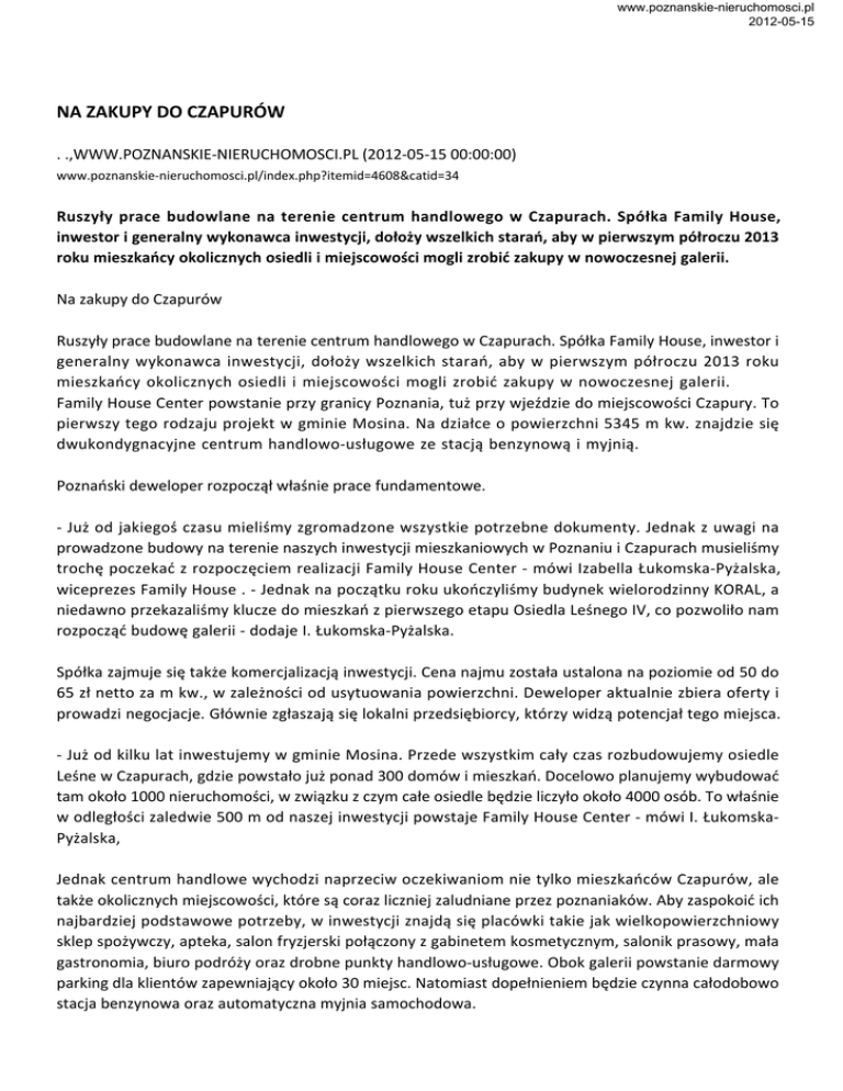 www.poznanskie-nieruchomosci.pl 2012-05-15 NA ZAKUPY DO CZAPURÓW . .,WWW.POZNANSKIE-NIERUCHOMOSCI.PL (2012-05-15 00:00:00) www.poznanskie-nieruchomosci.pl/index.php?itemid=4608&catid=34 Ruszyły prace budowlane na terenie centrum handlowego w Czapurach. Spółka Family House, inwestor i generalny wykonawca inwestycji, dołoży wszelkich starań, aby w pierwszym półroczu 2013 roku mieszkańcy okolicznych osiedli i miejscowości mogli zrobić zakupy w nowoczesnej galerii. Na zakupy do Czapurów Ruszyły prace budowlane na terenie centrum handlowego w Czapurach. Spółka Family House, inwestor i generalny wykonawca inwestycji, dołoży wszelkich starań, aby w pierwszym półroczu 2013 roku mieszkańcy okolicznych osiedli i miejscowości mogli zrobić zakupy w nowoczesnej galerii. Family House Center powstanie przy granicy Poznania, tuż przy wjeździe do miejscowości Czapury. To pierwszy tego rodzaju projekt w gminie Mosina. Na działce o powierzchni 5345 m kw. znajdzie się dwukondygnacyjne centrum handlowo-usługowe ze stacją benzynową i myjnią. Poznański deweloper rozpoczął właśnie prace fundamentowe. - Już od jakiegoś czasu mieliśmy zgromadzone wszystkie potrzebne dokumenty. Jednak z uwagi na prowadzone budowy na terenie naszych inwestycji mieszkaniowych w Poznaniu i Czapurach musieliśmy trochę poczekać z rozpoczęciem realizacji Family House Center - mówi Izabella Łukomska-Pyżalska, wiceprezes Family House . - Jednak na początku roku ukończyliśmy budynek wielorodzinny KORAL, a niedawno przekazaliśmy klucze do mieszkań z pierwszego etapu Osiedla Leśnego IV, co pozwoliło nam rozpocząć budowę galerii - dodaje I. Łukomska-Pyżalska. Spółka zajmuje się także komercjalizacją inwestycji. Cena najmu została ustalona na poziomie od 50 do 65 zł netto za m kw., w zależności od usytuowania powierzchni. Deweloper aktualnie zbiera oferty i prowadzi negocjacje. Głównie zgłaszają się lokalni przedsiębiorcy, którzy widzą potencjał tego miejsca. - Już od kilku lat inwestujemy w gminie Mosina. Przede wszystkim cały czas rozbudowujemy osiedle Leśne w Czapurach, gdzie powstało już ponad 300 domów i mieszkań. Docelowo planujemy wybudować tam około 1000 nieruchomości, w związku z czym całe osiedle będzie liczyło około 4000 osób. To właśnie w odległości zaledwie 500 m od naszej inwestycji powstaje Family House Center - mówi I. ŁukomskaPyżalska, Jednak centrum handlowe wychodzi naprzeciw oczekiwaniom nie tylko mieszkańców Czapurów, ale także okolicznych miejscowości, które są coraz liczniej zaludniane przez poznaniaków. Aby zaspokoić ich najbardziej podstawowe potrzeby, w inwestycji znajdą się placówki takie jak wielkopowierzchniowy sklep spożywczy, apteka, salon fryzjerski połączony z gabinetem kosmetycznym, salonik prasowy, mała gastronomia, biuro podróży oraz drobne punkty handlowo-usługowe. Obok galerii powstanie darmowy parking dla klientów zapewniający około 30 miejsc. Natomiast dopełnieniem będzie czynna całodobowo stacja benzynowa oraz automatyczna myjnia samochodowa. www.poznanskie-nieruchomosci.pl 2012-05-15 Family House Center to również ciekawa architektura, charakteryzująca się dużymi przeszkleniami. Budynek będzie komponował się z otoczeniem dzięki swej lekkiej konstrukcji oraz zastosowanym materiałom, jednocześnie nadając mu nowoczesny wygląd. Wnętrze zaprojektowano w ten sposób, aby przyszli najemcy oraz klienci odwiedzający galerię mogli cieszyć się funkcjonalnością, przestronnością i wygodą wszystkich pomieszczeń. Projekt inwestycji powstał w pracowni architektonicznej MSA Michnowicz Staszewski Architekci. Family House Center w liczbach : Powierzchnia działki: 5345 m2 Powierzchnia całkowita budynku wraz ze stacją i myjnią: 2214,31 m2 Powierzchnia handlowo-usługowa: 1289,83 m2 (bez myjni i stacji benzynowej) Powierzchnia zabudowy (wiata nad stacją paliw): 245 m2 Miejsca parkingowe: 37 Kondygnacje: 2 Liczba najemców galerii: 11 + stacja benzynowa + myjnia Otwarcie: I połowa 2013