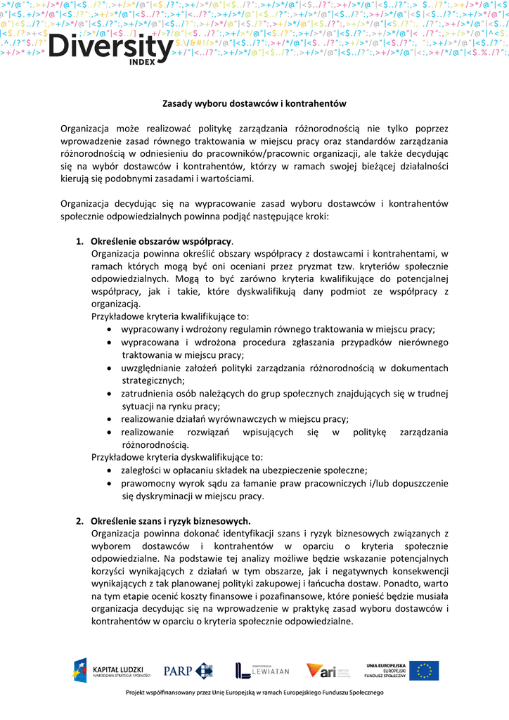 Zasady wyboru dostawców i kontrahentów Organizacja może realizować politykę zarządzania różnorodnością nie tylko poprzez wprowadzenie zasad równego traktowania w miejscu pracy oraz standardów zarządzania różnorodnością w odniesieniu do pracowników/pracownic organizacji, ale także decydując się na wybór dostawców i kontrahentów, którzy w ramach swojej bieżącej działalności kierują się podobnymi zasadami i wartościami. Organizacja decydując się na wypracowanie zasad wyboru dostawców i kontrahentów społecznie odpowiedzialnych powinna podjąć następujące kroki: 1. Określenie obszarów współpracy. Organizacja powinna określić obszary współpracy z dostawcami i kontrahentami, w ramach których mogą być oni oceniani przez pryzmat tzw. kryteriów społecznie odpowiedzialnych. Mogą to być zarówno kryteria kwalifikujące do potencjalnej współpracy, jak i takie, które dyskwalifikują dany podmiot ze współpracy z organizacją. Przykładowe kryteria kwalifikujące to: wypracowany i wdrożony regulamin równego traktowania w miejscu pracy; wypracowana i wdrożona procedura zgłaszania przypadków nierównego traktowania w miejscu pracy; uwzględnianie założeń polityki zarządzania różnorodnością w dokumentach strategicznych; zatrudnienia osób należących do grup społecznych znajdujących się w trudnej sytuacji na rynku pracy; realizowanie działań wyrównawczych w miejscu pracy; realizowanie rozwiązań wpisujących się w politykę zarządzania różnorodnością. Przykładowe kryteria dyskwalifikujące to: zaległości w opłacaniu składek na ubezpieczenie społeczne; prawomocny wyrok sądu za łamanie praw pracowniczych i/lub dopuszczenie się dyskryminacji w miejscu pracy. 2. Określenie szans i ryzyk biznesowych. Organizacja powinna dokonać identyfikacji szans i ryzyk biznesowych związanych z wyborem dostawców i kontrahentów w oparciu o kryteria społecznie odpowiedzialne. Na podstawie tej analizy możliwe będzie wskazanie potencjalnych korzyści wynikających z działań w tym obszarze, jak i negatywnych konsekwencji wynikających z tak planowanej polityki zakupowej i łańcucha dostaw. Ponadto, warto na tym etapie ocenić koszty finansowe i pozafinansowe, które ponieść będzie musiała organizacja decydując się na wprowadzenie w praktykę zasad wyboru dostawców i kontrahentów w oparciu o kryteria społecznie odpowiedzialne. 3. Określenie priorytetów w zakresie wyboru dostawców i kontrahentów. Organizacja powinna zidentyfikować te kryteria społecznie odpowiedzialne, które w pierwszej kolejności będą uwzględniane przez organizację w ramach wyboru dostawców i kontrahentów. Warto realizować tutaj podejście stopniowe, umożliwiające weryfikację poprawności oraz trafności wcześniej zakładanych założeń. Początkowo organizacja może się skupić na jednym podstawowym kryterium kwalifikującym albo dyskwalifikującym. 4. Określenie zasad oceny ofert składanych przez dostawców i kontrahentów. Organizacja powinna wypracować zasady oceny i różnicowania ofert składanych przez dostawców i kontrahentów społecznie odpowiedzialnych. Celem nadrzędnym powinien być wybór oferty, która w największym stopniu odpowiada potrzebom i wymaganiom organizacji. Warto wziąć także pod uwagę specyfikę małych i średnich przedsiębiorstw, które napotykać mogą na większe trudności w zakresie stosowania rozwiązań ocenianych przez organizację jako społecznie odpowiedzialnych. W związku z tym można dokonać dywersyfikacji kryteriów w zależności do wielkości podmiotu albo stworzyć możliwość składania ofert cząstkowych. 5. Wpisanie zasad wyboru dostawców i kontrahentów w dokumenty strategiczne organizacji. Organizacja powinna uwzględnić zasady wyboru dostawców i kontrahentów społecznie odpowiedzialnych w swoich strategicznych dokumentach, a także wypracować stosowe procedury postępowania, dedykowane dla pracowników/pracownic odpowiedzialnych za nawiązywanie współpracy z dostawcami i kontrahentami. 6. Wdrażanie zasady wyboru dostawców i kontrahentów. Organizacja powinna przeszkolić osoby odpowiedzialne za nawiązywanie współpracy z dostawcami i kontrahentami w obszarze zasad wyboru dostawców i kontrahentów społecznie odpowiedzialnych. Zasady te powinno być znane, czytelne oraz jednoznaczne dla wszystkich podmiotów zainteresowanych potencjalną współpracą. Oznacza to, że promocja i upowszechnianie tych zasad nie powinno się odbywać wyłącznie w oparciu o komunikację wewnętrzną organizacji, ale przede wszystkim komunikacje zewnętrzną (na przykład: strony internetowe, publikacje na stronach internetowych poświęconych tematyce społecznej odpowiedzialności biznesu). 7. Ocena realizowanych rozwiązań. Organizacja powinna dokonać obiektywnej oceny realizowanych rozwiązań w zakresie wyboru dostawców i kontrahentów z uwzględnieniem kryteriów społecznie odpowiedzialnych. Kluczowa jest tutaj identyfikacja realnych korzyści odnoszonych przez organizację, jak i kosztów ponoszonych z tego tytułu. Organizacja może na tym etapie dokonać także porównania korzyści netto osiąganych przez organizację w stosunku do innych alternatywnych rozwiązań możliwych do realizacji przez organizację.