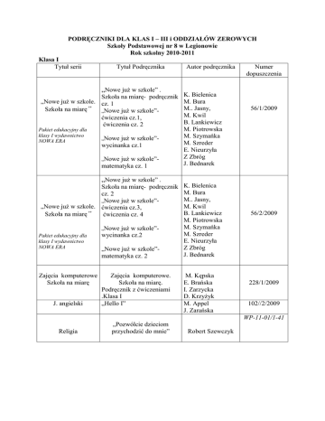 PODRĘCZNIKI DLA KLAS I – III i ODDZIAŁÓW ZEROWYCH Szkoły Podstawowej nr 8 w Legionowie Rok szkolny 2010-2011 Klasa I Tytuł serii Tytuł Podręcznika „Nowe już w szkole” . Szkoła na miarę- podręcznik „Nowe już w szkole. cz. 1 Szkoła na miarę” „Nowe już w szkole”ćwiczenia cz.1, ćwiczenia cz. 2 Pakiet edukacyjny dla klasy I wydawnictwo NOWA ERA „Nowe już w szkole”wycinanka cz.1 „Nowe już w szkole”matematyka cz. 1 Autor podręcznika K. Bielenica M. Bura M.. Jasny, M. Kwil B. Lankiewicz M. Piotrowska M. Szymańka M. Szreder E. Nieurzyła Z Zbróg J. Bednarek Numer dopuszczenia 56/1/2009 „Nowe już w szkole” . Szkoła na miarę- podręcznik cz. 2 „Nowe już w szkole”„Nowe już w szkole. ćwiczenia cz.3, Szkoła na miarę” ćwiczenia cz. 4 „Nowe już Pakiet edukacyjny dla klasy I wydawnictwo NOWA ERA Zajęcia komputerowe Szkoła na miarę J. angielski w szkole”wycinanka cz.2 „Nowe już w szkole”matematyka cz. 2 Zajęcia komputerowe. Szkoła na miarę. Podręcznik z ćwiczeniami .Klasa I „Hello I” K. Bielenica M. Bura M.. Jasny, M. Kwil B. Lankiewicz M. Piotrowska M. Szymańka M. Szreder E. Nieurzyła Z Zbróg J. Bednarek M. Kępska E. Brańska I. Zarzycka D. Krzyżyk M. Appel J. Zarańska 56/2/2009 228/1/2009 102//2/2009 WP-11-01/1-41 Religia „Pozwólcie dzieciom przychodzić do mnie” Robert Szewczyk Klasa II Tytuł serii Tytuł Podręcznika Autor podręcznika Numer dopuszczenia Semestr I Nowe Już w szkole 2. Szkoła na miarę. Podręcznik semestr I. Ćwiczenia kl. II cz. 1 Ćwiczenia kl. II cz. 2 Matematyka, klasa II cz.1 Matematyka, klasa II cz. 2 Nowe Już w szkole. Szkoła na miarę kl. II Wycinanka klasa II cz.1 K.Bielenica M. Bura E. Hryszkiewicz M. Jasny M. Kwil B. Lankiewicz M. Piotrowska E. SidorowiczAdamska B. Stępień M. Szreder M. Szymańska E. Nieurzyła Z. Zbróg M. Kryszczuk 56/3/2010 Semestr II Pakiet edukacyjny dla Nowe Już w szkole 2. klasy II wydawnictwo Szkoła na miarę. Podręcznik NOWA ERA semestr II. Ćwiczenia klasa II cz. 3 Ćwiczenia klasa II cz. 4 Matematyka, klasa II cz.3 Matematyka, klasa II cz. 4 Wycinanka klasa II cz. 2 K.Bielenica M. Bura E. Hryszkiewicz M. Jasny M. Kwil B. Lankiewicz M. Piotrowska E. SidorowiczAdamska B. Stępień M. Szreder M. Szymańska E. Nieurzyła Z. Zbróg M. Kryszczuk Zajęcia komputerowe Zajęcia komputerowe. klasa II . Szkoła na miarę. Szkoła na miarę Podręcznik z ćwiczeniami Klasa II M. Kęska E. Brańska I. Zarzycka D. Krzyżyk J. angielski M. Appel J. Zarańska Religia ”Hello II” „Przyjdźcie do mnie wszyscy” R. Szewczyk 56/4/2010 228/2/2010 102/2/209 WP-12-01/1-4 Klasy III Tytuł serii Tytuł Podręcznika Autor podręcznika M. Piotrowska M. Szymańska „Już w szkole” „Już w szkole.” Podręcznik do kształcenia zintegrowanego w klasie 3”semestr I i II. Pakiet edukacyjny dla Ćwiczenia do klasy III. kształcenia Wydawnictwo NOWA zintegrowanego ERA „Obserwuję, przeżywam, poznaję” Kształcenie zintegrowanematematyka do podręcznika „Już w szkole” Część I,II,III ,IV j. angielski „New Bingo3” Religia „Abyście szli i owoc przynosili” M. Piotrowska M. Szymańska Numer dopuszczenia 56/03 K. Bielenica M. Kwil M. Bura Anna Wieczorek R. Szewczyk 106/05 WP –13-01/1 –41 Podręczniki dodatkowe dla oddziałów zerowych Tytuł serii Pakiet na miarę sześciolatka w zerówce. „Bawię się i przygotowuję do szkoły” Wydawnictwo Nowa Era Tytuł Podręcznika Autor podręcznika Książka sześciolatka. „Przygotowuje się do szkoły” Karty pracy sześciolatka cz. 1,2,3,4 Wycinanka sześciolatka cz. 1,2,3,4 Lubię rysować i kolorować . Ćwiczenia grafomotoryczne Papierowe składanki S. Doroszuk D. Sotomska – Sas J. Hermanowska J. Gawryszewska