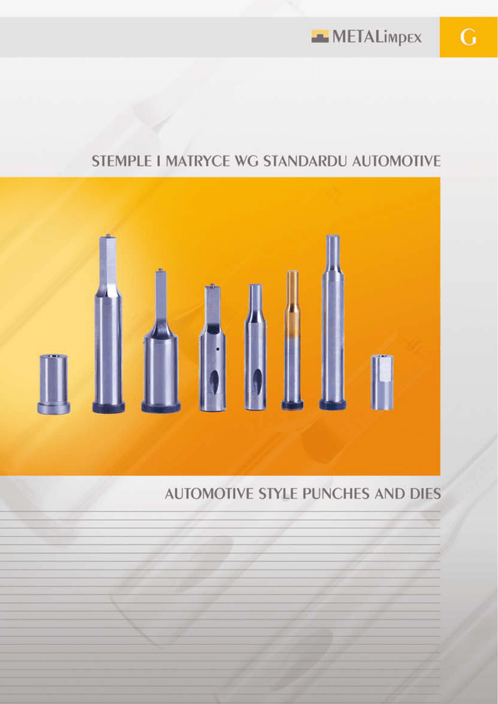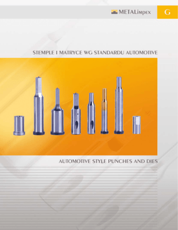 G/2 Spis produktów Table of contents Strona Page S, H Stempel standardowy Standard punch HND, ND Matryca standardowa Standard die R, HE Standardowy stempel Retrakto® Standard Retrakto® punch SP, SLP, SAP Pilot standardowy Standard precision pilot HB, HBR Stempel Bal-Lok® do dużych obciążeń Heavy duty Bal-Lok® punch B, BR Stempel Bal-Lok® do małych obciążeń Light duty Bal-Lok® punch BP, HBP, BLP, HBLP, BAP, HBAP Pilot Bal-Lok® Bal-Lok pilot BD Matryca Bal-Lok® Bal-Lok® die button G/4 G/5 G/6 G/7 G/8 TFP Stempel i matryca do otworów startowych pod blachowkręty Thread forming punch and matrix unit MST, MSF Standardowa oprawka True-Set Standard True-Set retainer MRL, MRH Oprawka True-Set dla stempli Bal-Lok® True-Set retainer for Bal-Lok® punch STR Zrywacz z płytkami mocującymi Stripping unit PM Podkładki dystansowe do matryc Shim rings for die button Strona Page G/15 G/16 G/17 G/18 G/19 G/9 G/10 G/11 G/11 HBK, HBRK Stempel Bal-Lok® Knob Style do dużych obciążeń Heavy duty Bal-Lok® Knob Style punch G/12 BK, BRK Stempel Bal-Lok® Knob Style do małych obciążeń Light duty Bal-Lok® Knob Style punch SCS, BCS, HBCS Stempel do gniazd stożkowych Countersink punch SSP, PSS Perforator, tuleja Perforator, sleev G/13 G/14 G/15 G/3 Stempel standardowy - S, H Standard punch - S, H Materiał/Material: HSS: M2 Twardość/Hardness: Trzpień/Shaft: 62±2 HRC Łeb/Head: 48±8 HRC Obróbka/Treatment: Nitrogenic® PORTER PRECISION Stempel standardowy z łbem (S-) Standard headed punch (S-) Stempel standardowy bez łba (H-) Standard headless punch (H-) Pozostałe standardowe kształty na stronie G/23 For additional standards forms see page G/23 +1.5 D m5 +0.0 H - 0.3 + 0.25 T - 0.00 L - 0.0 standard opcja/alternates S B(20) C(25) D(32) E(38) 4 7 5 12 5 8 5 12 6 9 5 13 8 11 5 14 10 13 5 16 13 16 5 21 16 19 5 24 20 23 5 27 25 28 5 32 32 35 5 32 40 43 5 32 45 48 5 32 50 53 5 32 56 59 5 32 63 66 5 32 ● ● ● ● ● ● ● ● ● ● ● ● ● ● ● ● ● ● ● ● okrągłe round +0.5 B - 0.0 ● ● ● ● ● ● ● ● ● ● ● ● 45 50 56 63 71 80 90 100 ● ● ● ● ● ● ● ● ● ● ● ● ● ● ● ● ● ● ● ● ● ● ● ● ● ● ● ● ● ● ● ● ● ● ● ● ● ● ● ● ● ● ● ● ● ● ● ● ● ● ● ● ● ● ● ● ● ● ● ● ● ● ● ● ● ● ● ● ● ● ● ● ● ● ● ● ● ● ● ● ● ● ● ● ● ● ● ● ● ● ● ● ● ● ● ● ● ● ● ● ● Informacje o powłokach na str G/24 For coating information see page G/24 G/4 ● ● ● ● ● +0.01 P - 0.00 min +0.01 W - 0.01 max How to order: Stempel SC D = 13 mm B=S L = 71 mm P = 11 mm Nr katalogowy Punch SC D = 13 mm B=S L = 71 mm P = 11 mm - SC 13 S 71 11 Item no. - SC 13 Sx71x11 P/G 1.5 - 3.99 1.5 4 1.5 - 4.99 1.5 5 1.5 - 5.99 1.5 6 2.5 - 7.99 2.0 8 3.2 - 9.99 3.5 10 5.0 - 12.99 4.5 13 8.0 - 15.99 6.5 16 10.0 - 19.99 8.0 20 12.0 - 24.99 10.0 25 16.0 - 31.99 12.0 32 20.0 - 39.99 14.0 40 25.0 - 44.99 16.0 45 30.0 - 49.99 19.0 50 35.0 - 55.99 21.0 56 40.0 - 62.99 23.0 63 (standard) Sposób zamawiania: - SC 13 S 71 11 - SC 13 Sx71x11 110 kształtowe shape Szczegóły dotyczące mocowania na str. G/22 Optional locating methods see page G/22 Matryca standardowa - HND, ND Standard die - HND, ND Materiał/Material: HSS: M2 Twardość/Hardness: 62±2 HRC Obróbka/Treatment: Nitrogenic® PORTER PRECISION Matryca standardowa z kołnierzem (HND-) Standard headed die button (HND-) Matryca standardowa bez kołnierza (ND-) Standard headless die button (ND-) Pozostałe standardowe kształty na stronie G/23 For additional standards forms see page G/23 okrągłe round +0.5 D m5 B max L - 0.0 R 8 4 4.0 10 4 6.0 13 5 8.0 16 5 9.5 20 5 12.0 22 6 15.0 25 6 17.5 32 6 21.0 38 8 27.0 +0.01 kształtowe shape +0.01 19 20 22 25 28 30 32 35 P - 0.00 ● ● ● ● ● ● ● ● ● ● ● ● ● ● ● ● ● ● ● ● ● ● ● ● ● ● ● ● ● ● ● ● ● ● ● ● ● ● ● ● ● ● ● ● ● ● ● ● ● ● ● ● ● ● ● ● ● ● ● ● ● ● ● ● ● ● 1.5 - 3.2 - - 1.5 - 5.0 1.2 5.0 1.5 - 7.2 1.9 7.2 5.0 - 8.8 1.9 8.8 W - 0.01 max P/G 7.0 - 11.0 1.9 11.0 9.0 - 14.0 1.9 14.0 11.0 - 16.5 1.9 16.5 13.0 - 20.0 1.9 20.0 16.0 - 26.0 1.9 26.0 Informacje o powłokach na str G/24 For coating information see page G/24 (standard) Sposób zamawiania: How to order: Matryca NDR D = 16 mm L = 25 mm W = 4,2 mm P = 5,4 mm Mocowanie - LM2 Nr katalogowy Die NDR D = 16 mm L = 25 mm W = 4,2 mm P = 5,4 mm Locate - LM2 Item no. - NDR 16 25 4,2 5,4 LM2 - NDR 16x25x4,2x5,4 LM2 min - NDR 16 25 4,2 5,4 LM2 - NDR 16x25x4,2x5,4 LM2 Szczegóły dotyczące mocowania na str. G/22 Optional locating methods see page G/22 G/5 Standardowy stempel Retrakto® - R, HE Standard Retrakto® punch - R, HE Materiał/Material: HSS: M2 Twardość/Hardness: Trzpień/Shaft: 62±2 HRC Łeb/Head: 48±8 HRC Obróbka/Treatment: Nitrogenic® PORTER PRECISION Stempel Retrakto® z łbem (R-) Standard precision headed Retrakto® punch (R-) Stempel Retrakto® bez łba (HE-) Standard headless Retrakto® punch (HE-) Pozostałe standardowe kształty na stronie G/23 For additional standards forms see page G/23 +1.5 D m5 5 +0.0 H - 0.3 8 + 0.25 T - 0.00 12 6 9 5 13 8 11 5 14 10 13 5 16 13 16 5 21 16 19 5 24 20 23 5 27 25 28 5 32 32 35 5 32 Informacje o powłokach na str G/24 For coating information see page G/24 G/6 L - 0.0 standard opcja/alternates 45 S B(20) C(25) D(32) 5 ● ● ● ● okrągłe round +0.5 B - 0.0 ● ● ● ● ● ● ● ● ● ● ● ● ● ● ● ● ● ● ● ● ● 50 56 63 71 80 ● ● ● ● ● ● ● ● ● ● ● ● ● ● ● ● ● ● ● ● ● ● ● ● ● ● ● ● ● ● ● ● ● ● ● ● ● ● ● ● ● ● ● ● ● ● ● 100 ● ● ● ● ● ● ● ● +0.01 P - 0.00 min +0.01 W - 0.01 max P/G zestaw naprawczy Retrakto replacement 1.6 - 4.99 1.6 5