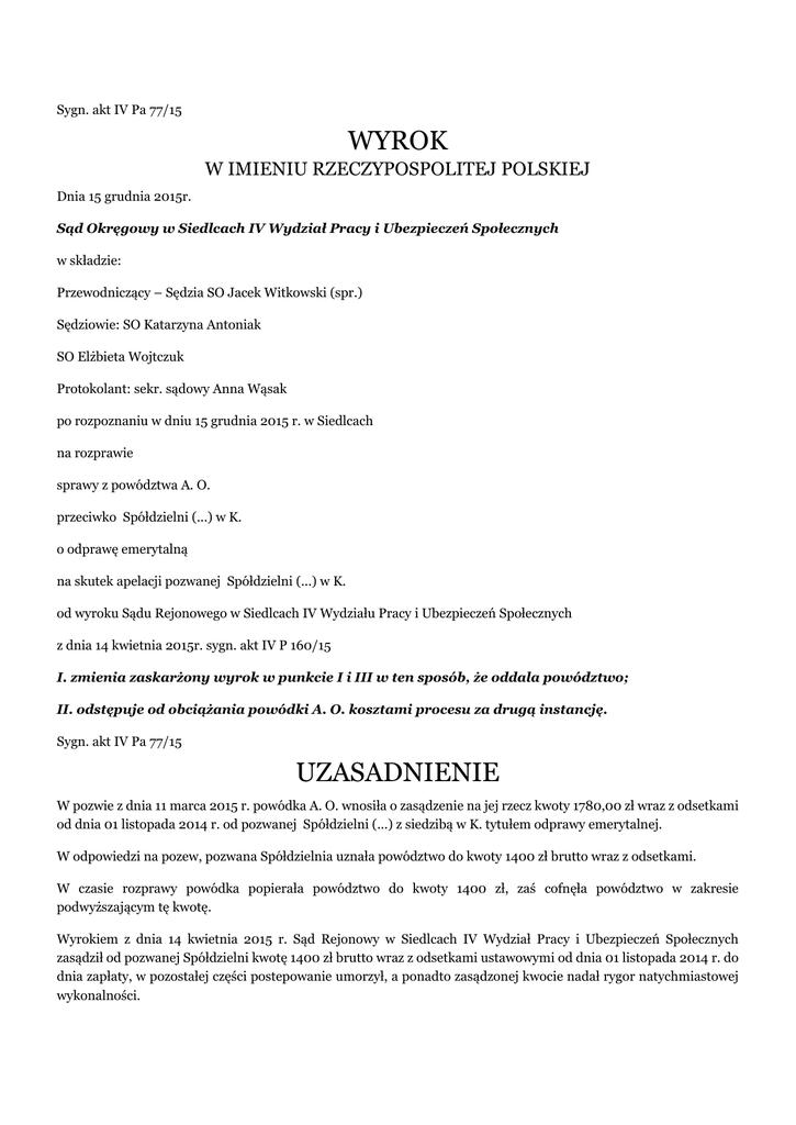Sygn. akt IV Pa 77/15 WYROK W IMIENIU RZECZYPOSPOLITEJ POLSKIEJ Dnia 15 grudnia 2015r. Sąd Okręgowy w Siedlcach IV Wydział Pracy i Ubezpieczeń Społecznych w składzie: Przewodniczący – Sędzia SO Jacek Witkowski (spr.) Sędziowie: SO Katarzyna Antoniak SO Elżbieta Wojtczuk Protokolant: sekr. sądowy Anna Wąsak po rozpoznaniu w dniu 15 grudnia 2015 r. w Siedlcach na rozprawie sprawy z powództwa A. O. przeciwko Spółdzielni (...) w K. o odprawę emerytalną na skutek apelacji pozwanej Spółdzielni (...) w K. od wyroku Sądu Rejonowego w Siedlcach IV Wydziału Pracy i Ubezpieczeń Społecznych z dnia 14 kwietnia 2015r. sygn. akt IV P 160/15 I. zmienia zaskarżony wyrok w punkcie I i III w ten sposób, że oddala powództwo; II. odstępuje od obciążania powódki A. O. kosztami procesu za drugą instancję. Sygn. akt IV Pa 77/15 UZASADNIENIE W pozwie z dnia 11 marca 2015 r. powódka A. O. wnosiła o zasądzenie na jej rzecz kwoty 1780,00 zł wraz z odsetkami od dnia 01 listopada 2014 r. od pozwanej Spółdzielni (...) z siedzibą w K. tytułem odprawy emerytalnej. W odpowiedzi na pozew, pozwana Spółdzielnia uznała powództwo do kwoty 1400 zł brutto wraz z odsetkami. W czasie rozprawy powódka popierała powództwo do kwoty 1400 zł, zaś cofnęła powództwo w zakresie podwyższającym tę kwotę. Wyrokiem z dnia 14 kwietnia 2015 r. Sąd Rejonowy w Siedlcach IV Wydział Pracy i Ubezpieczeń Społecznych zasądził od pozwanej Spółdzielni kwotę 1400 zł brutto wraz z odsetkami ustawowymi od dnia 01 listopada 2014 r. do dnia zapłaty, w pozostałej części postepowanie umorzył, a ponadto zasądzonej kwocie nadał rygor natychmiastowej wykonalności. Sąd Rejonowy swoje rozstrzygnięcie wydał na podstawie następujących ustaleń faktycznych. Powódka A. O. była zatrudniona w pozwanej Spółdzielni od 01 maja 2014 r. do 01 listopada 2014 r. na stanowisku salowej. Rozwiązanie umowy o pracę nastąpiło na mocy porozumienia stron. Powódka oświadczyła pracodawcy , że zamierza skorzystać z uprawnień emerytalnych. Decyzją z dnia 09 stycznia 2015 r. organ rentowy przyznał powódce prawo do emerytury od dnia 01 listopada 2014 r. Pismem z dnia 26 stycznia 2015 r. powódka zwróciła się o przyznanie jej odprawy emerytalnej i załączyła decyzję ZUS. Jej żądanie nie zostało spełnione przez byłego pracodawcę i w związku z tym wniosła ona pozew w dniu 11 marca 2015 r. przeciwko pozwanej Spółdzielni o zapłatę odprawy pieniężnej w kwocie 1780 zł. Pozwana Spółdzielnia wraz z odpowiedzią na pozew załączyła kserokopię wydruków bankowych, potwierdzających dokonanie przelewów na konto powódki kwoty 1148 zł tytułem odprawy oraz 45,44 zł tytułem odsetek za zwłokę w wypłacie odprawy. Przelewy te zostały wykonane w dniu 02 kwietnia 2015 r. Na rozprawie w dniu 14 kwietnia 2015 r. powódka po zapoznaniu się z odpowiedzią na pozew, cofnęła powództwo od kwoty powyższej 1400 zł. Sąd Rejonowy wydając rozstrzygnięcie stwierdził, że powództwo jest uzasadnione co do kwoty, co do której nie nastąpiło jego cofnięcie i jako podstawę prawną rozstrzygnięcia wskazał art. 921 § 1 k.p., a w pozostałej części postępowanie umorzył. Od wyroku tego apelację wniosła pozwana Spółdzielnia (...) w K.. Orzeczenie zostało zaskarżone w pkt. I i III. Strona apelująca zarzuciła Sądowi Rejonowemu naruszenie przepisów postepowania tj. art. 233 § 1 k.p.c. poprzez dowolną wewnętrznie niespójną ocenę zebranego w sprawie materiału dowodowego przez co błędnie ustalił wymagalność roszczenia, w sytuacji gdy roszczenie zostało zaspokojone. Ponadto zarzucił naruszenie prawa materialnego tj. art. 921 § 1 k.p. w zw. z art. 316 k.p.c. poprzez dokonanie nieprawidłowej subsumpcji przepisu art. 92(1 § 1 )k.p. w sytuacji gdy roszczenie zostało zaspokojone. W ocenie Sądu Okręgowego, apelacja strony pozwanej jest zasadna. Sąd I instancji błędnie ocenił zebrany w sprawie materiał dowodowy co doprowadziło do wydania wadliwego rozstrzygnięcia w pkt. I i III wyroku. Rację ma skarżąca wyrok Spółdzielnia, iż Sąd I instancji naruszył dyspozycję art. 316 k.p.c. w zw. z art. 921 § 1 k.p. Pierwszy z powołanych przepisów obliguje Sąd do brania pod uwagę w dacie wyrokowania stan rzeczy istniejący w fazie procesu. Bezsporne jest, iż roszczenie powódki w chwili zamknięcia rozprawy było zaspokojone. Sąd Rejonowy dysponował dowodami z dokumentów tj. potwierdzeniem dokonania przelewów bankowych. Przelewy te zostały dokonane w dniu 02 kwietnia 2015 r. Zatem Sąd dysponował wiedzą o zaspokojeniu roszczenia powódki w dacie wyrokowania. W tej sytuacji Sąd Rejonowy powinien był oddalić powództwo w całości. Powódka bowiem nie cofnęła powództwa w zakresie odprawy emerytalnej. W świetle powyższego apelacja strony pozwanej podległa uwzględnieniu. W związku z tym Sąd Okręgowy na podstawie art. 386 § 1 k.p.c. orzekł jak w sentencji.