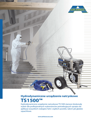 Hydrodynamiczne urządzenie natryskowe TS1500™ Hydrodynamiczne urządzenie natryskowe TS1500 stanowi doskonały wybór dla profesjonalnych wykonawców potrzebujących sprzętu do aplikacji wszystkich rodzajów farb i ciężkich powłok, takich jak gładzie szpachlowe. www.airlessco.eu.com HYDRODYNAMICZNE URZĄDZENIE NATRYSKOWE TS1500™ WŁAŚCIWOŚCI ZASTOSOWANIA • Cyfrowy wyświetlacz LCD i elektroniczny system regulacji ciśnienia • • Inteligentny układ elektroniczny z Cyfrowy system pomiaru (DTS), oprogramowaniem wskazującym konieczność przeprowadzenia prac konserwacyjnych TS1500 to maszyna elektryczna o największej mocy z tej serii, obsługuje 2 pistolety i długie węże • Do natryskiwania dużych budynków mieszkalnych oraz zastosowań komercyjnych i przemysłowych • Do 20 000 litrów rocznie • Chromowany tłok i tuleja ze stali nierdzewnej • Konstrukcja wózka z potrójnie chromowanych stalowych rur • Łatwe przemieszczanie po nierównym terenie dzięki kołom z dużymi pneumatycznymi oponami NATRYSKIWANIE: • Powłok wodnych i olejnych • Lateksów • Emulsji • Akryli • Powłok ogniochronnych • Powłok wodoodpornych • Finiszowych gładzi szpachlowych do natrysku airless TS1500 DANE TECHNICZNE TS1500 Numer katalogowy 16K548 Maks. wielkość dyszy do farby – 1 pistolet/2 pistolety 0,033" / 0,022" Maks. wielkość dyszy do gładzi 0,035" Wydajność na minutę – litr (galon) 4,7 (1,25) Maks. ciśnienie – w barach (PSI). 227 (3300) Waga – kg (lb) 59 (130) Silnik – kW (HP) 1,65 (2,2) TEFC DC Urządzenie w komplecie z wężem 3/8" x 15 m, końcówką biczową ¼" x 0,9 m, połączeniem obrotowym pistoletu, hydrodynamicznym pistoletem Mastic, dyszą 631 Rev-Tip oraz dwoma zastawami kulek zaworowych wykonanymi z ceramiki i stali nierdzewnej. Ulepszona dolna pompa Zwiększona wydajność dzięki zastosowaniu opuszczanej pompy, która umożliwia zasysanie bezpośrednio ze zbiornika. Łatwy w użyciu system filtrujący Wystarczy kilka sekund, aby wyjąć filtr bez żadnych narzędzi. Pistolet hydrodynamiczny Mastic Zoptymalizowany na potrzeby natryskiwania gładzi i farb bez zapychania się dysz. Cyfrowy system pomiaru (DTS) Licznik przepływu medium w litrach, przepracowanych godzin oraz informacja o kodach serwisowych. Airlessco – oddział firmy Graco © 2011 Graco. Formularz nr 341878PL Wersja B 08/11 Wszystkie inne nazwy lub znaki firmowe używane są do celów identyfikacji i stanowią zastrzeżone znaki handlowe swoich właścicieli. Wszystkie dane zawarte w niniejszym dokumencie w formie pisemnej lub graficznej odzwierciedlają informacje aktualne w momencie oddawania go do druku. Firma Airlessco zastrzega sobie prawo do wprowadzania zmian bez uprzedniego powiadomienia.