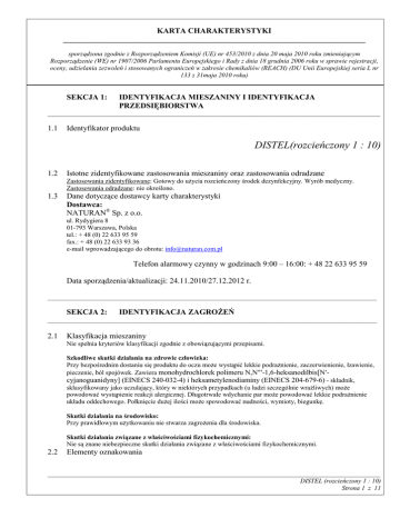 KARTA CHARAKTERYSTYKI ___________________________________________________________________________ sporządzona zgodnie z Rozporządzeniem Komisji (UE) nr 453/2010 z dnia 20 maja 2010 roku zmieniającym Rozporządzenie (WE) nr 1907/2006 Parlamentu Europejskiego i Rady z dnia 18 grudnia 2006 roku w sprawie rejestracji, oceny, udzielania zezwoleń i stosowanych ograniczeń w zakresie chemikaliów (REACH) (DU Unii Europejskiej seria L nr 133 z 31maja 2010 roku) SEKCJA 1: IDENTYFIKACJA MIESZANINY I IDENTYFIKACJA PRZEDSIĘBIORSTWA ___________________________________________________________________________________________________ 1.1 Identyfikator produktu DISTEL(rozcieńczony 1 : 10) 1.2 Istotne zidentyfikowane zastosowania mieszaniny oraz zastosowania odradzane Zastosowania zidentyfikowane: Gotowy do użycia rozcieńczony środek dezynfekcyjny. Wyrób medyczny. Zastosowania odradzane: nie określono. 1.3 Dane dotyczące dostawcy karty charakterystyki Dostawca: NATURAN® Sp. z o.o. ul. Rydygiera 8 01-793 Warszawa, Polska tel.: + 48 (0) 22 633 95 59 fax.: + 48 (0) 22 633 93 36 e-mail wprowadzającego do obrotu: [email protected] Telefon alarmowy czynny w godzinach 9:00 – 16:00: + 48 22 633 95 59 Data sporządzenia/aktualizacji: 24.11.2010/27.12.2012 r. __________________________________________________________________________________________________ SEKCJA 2: IDENTYFIKACJA ZAGROŻEŃ __________________________________________________________________________________________________ 2.1 Klasyfikacja mieszaniny Nie spełnia kryteriów klasyfikacji zgodnie z obowiązującymi przepisami. Szkodliwe skutki działania na zdrowie człowieka: Przy bezpośrednim dostaniu się produktu do oczu może wystąpić lekkie podrażnienie, zaczerwienienie, łzawienie, pieczenie, ból spojówek. Zawiera monohydrochlorek polimeru N,N″′-1,6-heksanodilbis[N′cyjanoguanidyny] (EINECS 240-032-4) i heksametylenodiaminy (EINECS 204-679-6) - składnik, sklasyfikowany jako uczulający, który w niektórych przypadkach (u ludzi szczególnie wrażliwych) może powodować wystąpienie reakcji alergicznej. Długotrwałe wdychanie par może powodować lekkie podrażnienie układu oddechowego. Połknięcie dużej ilości może spowodować nudności, wymioty, biegunkę. Skutki działania na środowisko: Przy prawidłowym użytkowaniu nie stwarza zagrożenia dla środowiska. Skutki działania związane z właściwościami fizykochemicznymi: Nie są znane niebezpieczne skutki działania związane z właściwościami fizykochemicznymi. 2.2 Elementy oznakowania ___________________________________________________________________________________________________ DISTEL (rozcieńczony 1 : 10) Strona 1 z 11 KARTA CHARAKTERYSTYKI ___________________________________________________________________________ sporządzona zgodnie z Rozporządzeniem Komisji (UE) nr 453/2010 z dnia 20 maja 2010 roku zmieniającym Rozporządzenie (WE) nr 1907/2006 Parlamentu Europejskiego i Rady z dnia 18 grudnia 2006 roku w sprawie rejestracji, oceny, udzielania zezwoleń i stosowanych ograniczeń w zakresie chemikaliów (REACH) (DU Unii Europejskiej seria L nr 133 z 31maja 2010 roku) ZNAK Nie jest wymagany Zwroty wskazujące rodzaj zagrożenia: Nie są wymagane. Zwroty określające warunki bezpiecznego stosowania: Nie są wymagane. Zawiera: Monohydrochlorek polimeru N,N″′-1,6-heksanodilbis[N′-cyjanoguanidyny] (EINECS 240-032-4) i heksametylenodiaminy (EINECS 204-679-6). Może powodować wystąpienie reakcji alergicznej. Karta dostępna na żądanie użytkownika prowadzącego działalność zawodową. 2.3 Inne zagrożenia Mieszanina nie spełnia kryteriów PBT i vPvB. _________________________________________________________________________________________________ SEKCJA 3: SKŁAD / INFORMACJA O SKŁADNIKACH ___________________________________________________________________________________________________ 3.2 Mieszanina Identyfikator produktu: DISTEL (rozcieńczony 1 : 10) Składniki mieszaniny: Nazwa substancji Propan-2-ol Monohydrochlorek polimeru N,N″′-1,6-heksanodilbis[N′cyjanoguanidyny] (EINECS 240-032-4) i heksametylenodiaminy (EINECS 204-679-6) nr indeksowy 603-117-00-0 nr CAS 67-63-0 nr WE 200-661-7 uł. masowy w % <1 - 27083-27-8 608-042-7* <1 Chlorek didecylodimetyloamonium 612-131-00-6 7173-51-5 230-525-2 <1 Alkohole C9 – C11, etoksylowane - 68439-46-3 614-482-0* <1 Czwartorzędowe związki amoniowe, benzyl-C12-16alkildimetyl, chlorki - 68424-85-1 270-325-2 <.1 Klasyfikacja zgodna z dyrektywą Rady 67/548/EWG Znak ostrzegawcz y Klasyfikacja zgodna z rozporządzeniem (WE) nr 1272/2008 Klasy zagrożenia i kody kategorii Kody zwrotów wskazujący ch rodzaj zagrożenia Symbol Zwrot yR F 11 Flam. Liq. 2 H225 Xi 36 67 Eye Irrit. 2 STOT SE 3 H319 H336 Xi - 38 43 Skin Irrit. 2 Skin Sens. 1 H315 H317 N 50-53 Aquatic Acute 1 Aquatic Chronic 1 H400 H410 Xn C 22 34 Acute Tox. 4 Skin Corr. 1B H302 H314 Xn Xi 22 41 Acute Tox. 4 Eye Dam. 1 H302 H318 Xn C 22 34 Acute Tox. 4 Skin Corr. 1B H302 H314 N 50 Aquatic Acute 1 H400 * - nr tymczasowy nadany w procesie rejestracji wstępnej ___________________________________________________________________________________________________ DISTEL (rozcieńczony 1 : 10) Strona 2 z 11 KARTA CHARAKTERYSTYKI ___________________________________________________________________________ sporządzona zgodnie z Rozporządzeniem Komisji (UE) nr 453/2010 z dnia 20 maja 2010 roku zmieniającym Rozporządzenie (WE) nr 1907/2006 Parlamentu Europejskiego i Rady z dnia 18 grudnia 2006 roku w sprawie rejestracji, oceny, udzielania zezwoleń i stosowanych ograniczeń w zakresie chemikaliów (REACH) (DU Unii Europejskiej seria L nr 133 z 31maja 2010 roku) Pełne brzmienia zwrotów R, H oraz kodów zagrożeń podano w sekcji 16. Karty charakterystyki. __________________________________________________________________________________________________ SEKCJA 4: ŚRODKI PIERWSZEJ POMOCY ______________________________________________