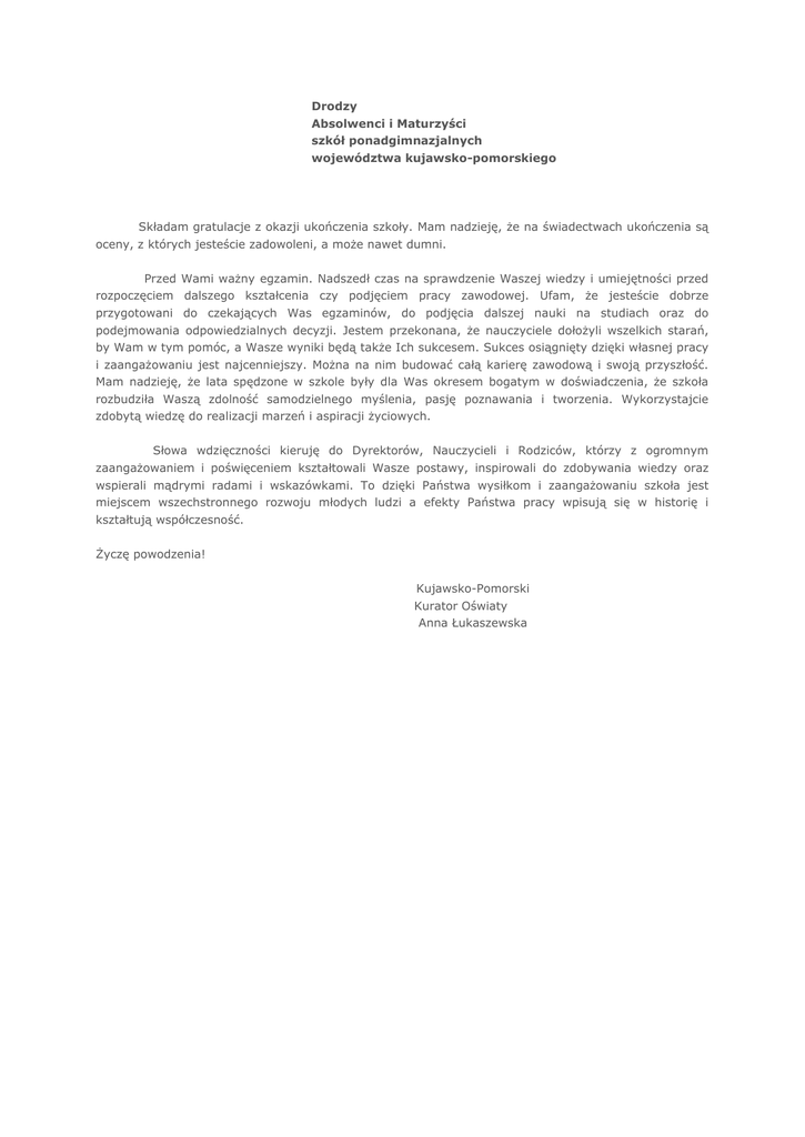 Drodzy Absolwenci i Maturzyści szkół ponadgimnazjalnych województwa kujawsko-pomorskiego Składam gratulacje z okazji ukończenia szkoły. Mam nadzieję, że na świadectwach ukończenia są oceny, z których jesteście zadowoleni, a może nawet dumni. Przed Wami ważny egzamin. Nadszedł czas na sprawdzenie Waszej wiedzy i umiejętności przed rozpoczęciem dalszego kształcenia czy podjęciem pracy zawodowej. Ufam, że jesteście dobrze przygotowani do czekających Was egzaminów, do podjęcia dalszej nauki na studiach oraz do podejmowania odpowiedzialnych decyzji. Jestem przekonana, że nauczyciele dołożyli wszelkich starań, by Wam w tym pomóc, a Wasze wyniki będą także Ich sukcesem. Sukces osiągnięty dzięki własnej pracy i zaangażowaniu jest najcenniejszy. Można na nim budować całą karierę zawodową i swoją przyszłość. Mam nadzieję, że lata spędzone w szkole były dla Was okresem bogatym w doświadczenia, że szkoła rozbudziła Waszą zdolność samodzielnego myślenia, pasję poznawania i tworzenia. Wykorzystajcie zdobytą wiedzę do realizacji marzeń i aspiracji życiowych. Słowa wdzięczności kieruję do Dyrektorów, Nauczycieli i Rodziców, którzy z ogromnym zaangażowaniem i poświęceniem kształtowali Wasze postawy, inspirowali do zdobywania wiedzy oraz wspierali mądrymi radami i wskazówkami. To dzięki Państwa wysiłkom i zaangażowaniu szkoła jest miejscem wszechstronnego rozwoju młodych ludzi a efekty Państwa pracy wpisują się w historię i kształtują współczesność. Życzę powodzenia! Kujawsko-Pomorski Kurator Oświaty Anna Łukaszewska