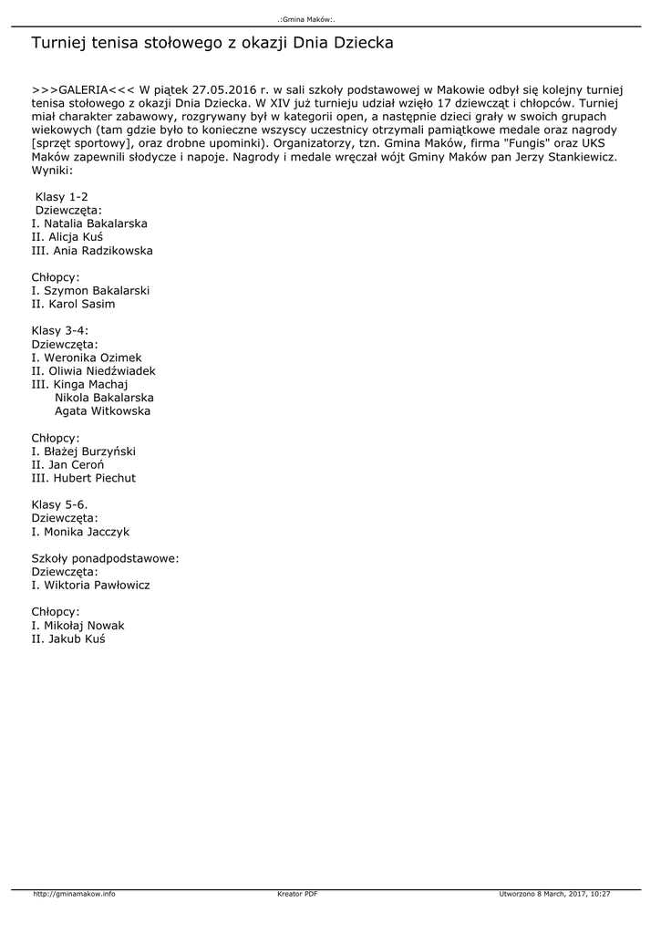 .:Gmina Maków:. Turniej tenisa stołowego z okazji Dnia Dziecka >>>GALERIA<<< W piątek 27.05.2016 r. w sali szkoły podstawowej w Makowie odbył się kolejny turniej tenisa stołowego z okazji Dnia Dziecka. W XIV już turnieju udział wzięło 17 dziewcząt i chłopców. Turniej miał charakter zabawowy, rozgrywany był w kategorii open, a następnie dzieci grały w swoich grupach wiekowych (tam gdzie było to konieczne wszyscy uczestnicy otrzymali pamiątkowe medale oraz nagrody [sprzęt sportowy], oraz drobne upominki). Organizatorzy, tzn. Gmina Maków, firma "Fungis" oraz UKS Maków zapewnili słodycze i napoje. Nagrody i medale wręczał wójt Gminy Maków pan Jerzy Stankiewicz. Wyniki: Klasy 1-2 Dziewczęta: I. Natalia Bakalarska II. Alicja Kuś III. Ania Radzikowska Chłopcy: I. Szymon Bakalarski II. Karol Sasim Klasy 3-4: Dziewczęta: I. Weronika Ozimek II. Oliwia Niedźwiadek III. Kinga Machaj Nikola Bakalarska Agata Witkowska Chłopcy: I. Błażej Burzyński II. Jan Ceroń III. Hubert Piechut Klasy 5-6. Dziewczęta: I. Monika Jacczyk Szkoły ponadpodstawowe: Dziewczęta: I. Wiktoria Pawłowicz Chłopcy: I. Mikołaj Nowak II. Jakub Kuś http://gminamakow.info Kreator PDF Utworzono 8 March, 2017, 10:27