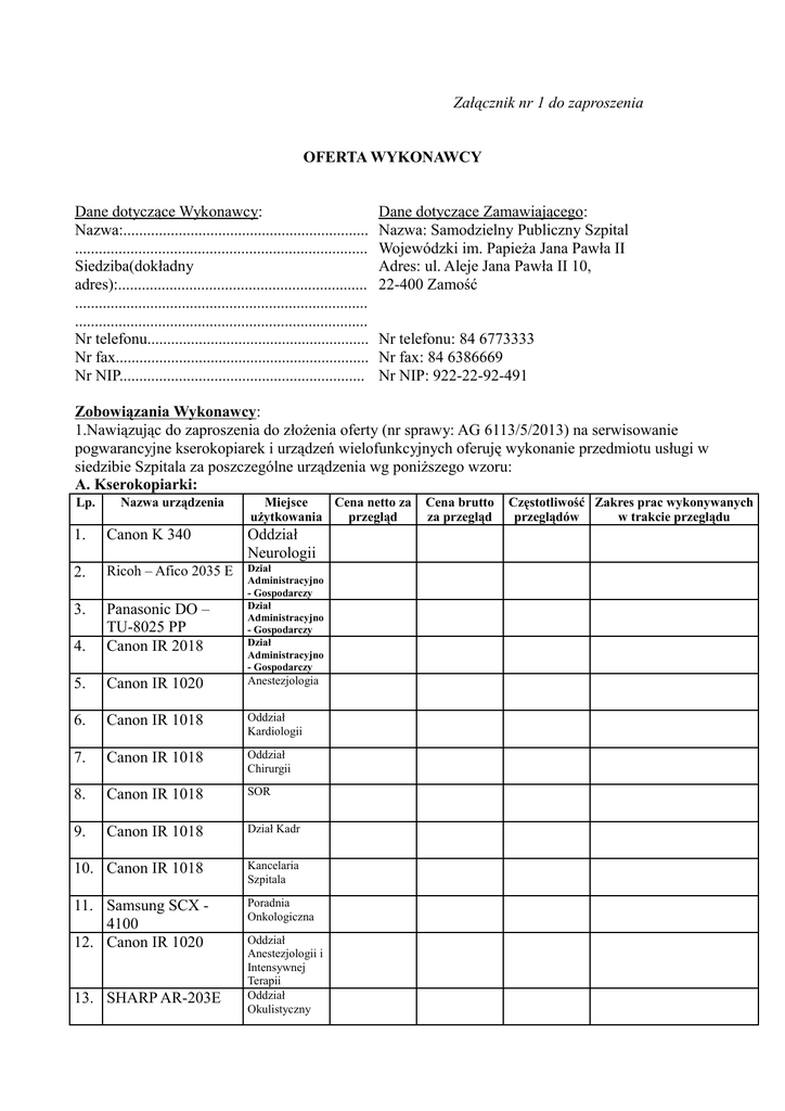 Załącznik nr 1 do zaproszenia OFERTA WYKONAWCY Dane dotyczące Wykonawcy: Nazwa:.............................................................. .......................................................................... Siedziba(dokładny adres):............................................................... .......................................................................... .......................................................................... Nr telefonu........................................................ Nr fax................................................................ Nr NIP.............................................................. Dane dotyczące Zamawiającego: Nazwa: Samodzielny Publiczny Szpital Wojewódzki im. Papieża Jana Pawła II Adres: ul. Aleje Jana Pawła II 10, 22-400 Zamość Nr telefonu: 84 6773333 Nr fax: 84 6386669 Nr NIP: 922-22-92-491 Zobowiązania Wykonawcy: 1.Nawiązując do zaproszenia do złożenia oferty (nr sprawy: AG 6113/5/2013) na serwisowanie pogwarancyjne kserokopiarek i urządzeń wielofunkcyjnych oferuję wykonanie przedmiotu usługi w siedzibie Szpitala za poszczególne urządzenia wg poniższego wzoru: A. Kserokopiarki: Lp. Nazwa urządzenia Miejsce Cena netto za użytkowania przegląd 1. Canon K 340 Oddział Neurologii 2. Ricoh – Afico 2035 E 3. 4. Panasonic DO – TU-8025 PP Canon IR 2018 Dział Administracyjno - Gospodarczy Dział Administracyjno - Gospodarczy Dział Administracyjno - Gospodarczy 5. Canon IR 1020 Anestezjologia 6. Canon IR 1018 Oddział Kardiologii 7. Canon IR 1018 Oddział Chirurgii 8. Canon IR 1018 SOR 9. Canon IR 1018 Dział Kadr 10. Canon IR 1018 Kancelaria Szpitala 11. Samsung SCX 4100 12. Canon IR 1020 Poradnia Onkologiczna 13. SHARP AR-203E Oddział Anestezjologii i Intensywnej Terapii Oddział Okulistyczny Cena brutto za przegląd Częstotliwość Zakres prac wykonywanych przeglądów w trakcie przeglądu 14. Canon IR 1018 15. CANON IR 1018 16. CANON IR 1024A 17. CANON IR 1018 18. CANON IR 1018 19. CANON IR 1018 20. Konica Minolta 240f 21. Konica Minolta 240f 22. Konica Minolta 240f 23. Konica Minolta 240f Razem Oddział Nefrologii, Endokrynologii, Chorób Metabolicznych i Chorób Wewnętrznych Oddział Chirurgii Naczyniowej Sekcja Statystyki medycznej i Dokumentacji Chorych Dział Administracyjn o-Gospodarczy - Zaopatrzenie Dział Analiz i Rozliczeń nad Świadczeniami Medycznymi Oddział Ginekologiczno -Położniczy Stacja Dializ Dział Administrac. Gospodarczy Oddział Laryngologiczn y Dział Księgowości Kasa - - - B. Urządzenia wielofunkcyjne: Lp. Nazwa urządzenia Miejsce Cena netto za użytkowania przegląd Oddział Urologii Oddział Neurologii Oddział Nefrologii 1. HP Laser Jet 3050 2. HP PSC 2110 3. 4. Panasonic KX – FLM 653 Samsung SX - 4300 5. HP Laser Jest 3015 6. 7. Panasonic KX MB 773 HP Laser Jest 3020 8. HP Laser Kadry 9. HP Officejet 4255 Poradnia onkologiczna Oddział Nefrologii Oddział Ginekologiczno - Połozniczy Oddział Kardiologii Oddział Kardiochirurgii Cena brutto za przegląd Częstotliwość Zakres prac wykonywanych przeglądów w trakcie przeglądu Oddział Neonatologii 10. HP Ofificejet J6410ALL Razem - - - C. Urządzenie powielające RISO Lp. Nazwa urządzenia Miejsce Cena netto za użytkowania przegląd 1. Riso RZ 200 EP Dział Admnistracyjno - Gospodarczy - Razem Cena brutto za przegląd Częstotliwość Zakres prac wykonywanych przeglądów w trakcie przeglądu - - 2. Oświadczam, że zapoznałem się z opisem przedmiotu zamówienia i nie wnoszę do niego zastrzeżeń. 3.Oświadczam, że zapoznałem się i akceptuję postanowienia zawarte w projekcie umowy. 4.Oferuje termin płatności............. dni licząc od daty otrzymania przez Zamawiającego faktury VAT (minimalny wymagany przez Zamawiającego – 30 dni). 5. Oświadczam, że realizowana usługa spełnia wymogi bezpieczeństwa dla obsługującego sprzęt personelu. 6.Oświadczam, że Wykonawca w trakcie usługi serwisowania dokona oceny stanu technicznego urządzeń, poinformuje o tym Zamawiającego oraz dokona wpisu do książki urządzenia. Załączniki: - aktualny odpis z właściwego rejestru wystawiony nie wcześniej niż 6 miesięcy przed upływem składania ofert. .................................dnia....................2013r. * niepotrzebne skreślić ...... .. ........................................ /podpis osoby uprawnionej lub upoważnionej/*