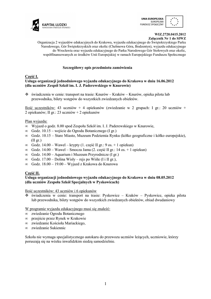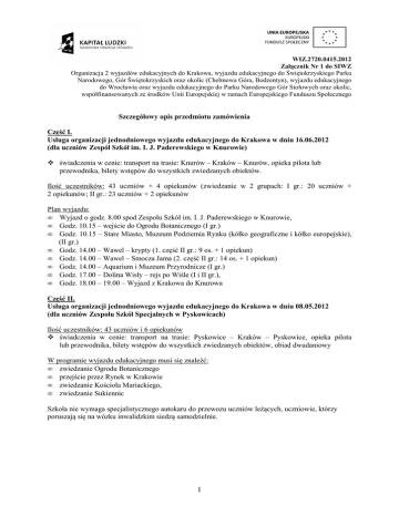 WIZ.2720.0415.2012 Załącznik Nr 1 do SIWZ Organizacja 2 wyjazdów edukacyjnych do Krakowa, wyjazdu edukacyjnego do Świętokrzyskiego Parku Narodowego, Gór Świętokrzyskich oraz okolic (Chełmowa Góra, Bodzentyn), wyjazdu edukacyjnego do Wrocławia oraz wyjazdu edukacyjnego do Parku Narodowego Gór Stołowych oraz okolic, współfinansowanych ze środków Unii Europejskiej w ramach Europejskiego Funduszu Społecznego Szczegółowy opis przedmiotu zamówienia Część I. Usługa organizacji jednodniowego wyjazdu edukacyjnego do Krakowa w dniu 16.06.2012 (dla uczniów Zespół Szkół im. I. J. Paderewskiego w Knurowie) świadczenia w cenie: transport na trasie: Knurów – Kraków – Knurów, opieka pilota lub przewodnika, bilety wstępów do wszystkich zwiedzanych obiektów. Ilość uczestników: 43 uczniów + 4 opiekunów (zwiedzanie w 2 grupach: I gr.: 20 uczniów + 2 opiekunów; II gr.: 23 uczniów + 2 opiekunów Plan wyjazdu: • Wyjazd o godz. 8.00 spod Zespołu Szkół im. I. J. Paderewskiego w Knurowie, • Godz. 10.15 – wejście do Ogrodu Botanicznego (I gr.) • Godz. 10.15 – Stare Miasto, Muzeum Podziemia Rynku (kółko geograficzne i kółko europejskie), (II gr.) • Godz. 14.00 – Wawel – krypty (1. część II gr.: 9 os. + 1 opiekun) • Godz. 14.00 – Wawel – Smocza Jama (2. część II gr.: 14 os. + 1 opiekun) • Godz. 14.00 – Aquarium i Muzeum Przyrodnicze (I gr.) • Godz. 17.00 – Dolina Wisły – rejs po Wiśle (I i II gr.), • Godz. 18.00 – 19.00 – Wyjazd z Krakowa do Knurowa Część II. Usługa organizacji jednodniowego wyjazdu edukacyjnego do Krakowa w dniu 08.05.2012 (dla uczniów Zespołu Szkół Specjalnych w Pyskowicach) Ilość uczestników: 43 uczniów i 6 opiekunów świadczenia w cenie: transport na trasie: Pyskowice – Kraków – Pyskowice, opieka pilota lub przewodnika, bilety wstępów do wszystkich zwiedzanych obiektów, obiad dwudaniowy W programie wyjazdu edukacyjnego musi się znaleźć: • zwiedzanie Ogrodu Botanicznego • przejście przez Rynek w Krakowie • zwiedzanie Kościoła Mariackiego, • zwiedzanie Sukiennic Szkoła nie wymaga specjalistycznego autokaru do przewozu uczniów leżących, uczniowie, którzy poruszają się na wózku inwalidzkim siedzą samodzielnie. 1 WIZ.2720.0415.2012 Załącznik Nr 1 do SIWZ Organizacja 2 wyjazdów edukacyjnych do Krakowa, wyjazdu edukacyjnego do Świętokrzyskiego Parku Narodowego, Gór Świętokrzyskich oraz okolic (Chełmowa Góra, Bodzentyn), wyjazdu edukacyjnego do Wrocławia oraz wyjazdu edukacyjnego do Parku Narodowego Gór Stołowych oraz okolic, współfinansowanych ze środków Unii Europejskiej w ramach Europejskiego Funduszu Społecznego Część III. Usługa organizacji trzydniowego wyjazdu edukacyjnego do Świętokrzyskiego Parku Narodowego, Gór Świętokrzyskich oraz okolic (Chełmowa Góra, Bodzentyn...) w terminie 29.05.2012 – 31.05.2012 (dla uczniów Zespołu Szkół Specjalnych w Pyskowicach) Ilość uczestników: 43 uczniów i 6 opiekunów świadczenia w cenie: transport na trasie: Pyskowice – Góry Świętokrzyskie – Pyskowice, opieka pilota lub przewodnika, bilety wstępów do wszystkich zwiedzanych obiektów, 2 noclegi w ośrodku o standardzie schroniska młodzieżowego, hostelu lub nie gorszym, wyżywienie: Dzień pierwszy: obiad dwudaniowy, kolacja Dzień drugi: śniadanie, obiad dwudaniowy, kolacja Dzień trzeci: śniadanie, obiad dwudaniowy W programie wyjazdu edukacyjnego musi się znaleźć: • Bodzentyn – zwiedzanie kolegiaty z XV wieku oraz ruin zamku biskupiego, • Zwiedzanie kapliczki św. Franciszka i św. Mikołaja położonych przy szlaku ze Świętej Katarzyny na Święty Krzyż, • Ścieżka historyczna na Łysej Górze zwiedzanie/oglądanie: - Muzeum Przyrodniczo – Leśnego Świętokrzyskiego Parku Narodowego - Kościoła i Klasztoru na Św. Krzyżu, - Punktu widokowego przy klasztorze, - Kapliczki „Dąbrówki”, - Cmentarza jeńców radzieckich, - Zamku w ujeździe – Krzyżtopór (turniej rycerski w dniach 28.05.2012 – 29.05.2012), - Dębu Bartek, - Ruin Zamku Królewskiego z XIV w. - Jaskini Raj Szkoła nie wymaga specjalistycznego autokaru do przewozu uczniów leżących, uczniowie, którzy poruszają się na wózku inwalidzkim siedzą samodzielnie. Część IV. Usługa organizacji jednodniowego wyjazdu edukacyjnego do Wrocławia w dniu 05.06.2012 (dla uczniów Zespołu Szkół Specjalnych w Pyskowicach) Ilość uczestników: 43 uczniów i 6 opiekunów świadczenia w cenie: transport na trasie: Pyskowice – Wrocław – Pyskowice, opieka pilota lub przewodnika, bilety wstępów do wszystkich zwiedzanych obiektów, obiad dwudaniowy. W programie wyjazdu edukacyjnego musi się znaleźć: • zwiedzanie ZOO Szkoła nie wymaga specjalistycznego autokaru do przewozu uczniów leżących, uczniowie, którzy poruszają się na wózku inwalidzkim siedzą samodzielnie 2 WIZ.2720.0415.2012 Załącznik Nr 1 do SIWZ Organizacja 2 wyjazdów edukacyjnych do Krakowa, wyjazdu edukacyjnego do Świętokrzyskiego Parku Narodowego, Gór Świętokrzyskich oraz okolic (Chełmowa Góra, Bodzentyn), wyjazdu edukacyjnego do Wrocławia oraz wyjazdu edukacyjnego do Parku Narodowego Gór Stołowych oraz okolic, współfinansowanych ze środków Unii Europejskiej w ramach Europejskiego Funduszu Społecznego Część V. Usługa organizacji trzydniowego wyjazdu edukacyjnego do Parku Narodowego Gór Stołowych i okolic w terminie 12.06.2012r – 14.06.2012r. (dla uczniów Zespołu Szkół Specjalnych w Pyskowicach) Ilość uczestników: 43 uczniów i 6 opiekunów świadczenia w cenie: transport na trasie: Pyskowice – Góry Stołowe (Polanica Zdrój, Kudowa Zdrój) – Pyskowice, opieka pilota lub przewodnika, bilety wstępów do wszystkich zwiedzanych obiektów, 2 noclegi w ośrodku o standardzie schroniska młodzieżowego, hostelu lub nie gorszym, Wyżywienie: Dzień pierwszy: obiad dwudaniowy, kolacja Dzień drugi: śniadanie, obiad dwudanio