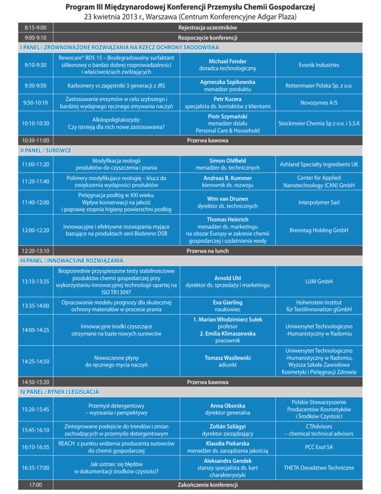 Program III Międzynarodowej Konferencji Przemysłu Chemii Gospodarczej 23 kwietnia 2013 r., Warszawa (Centrum Konferencyjne Adgar Plaza) 8:15-9:00 Rejestracja uczestników 9:00-9:10 Rozpoczęcie konferencji I PANEL / ZRÓWNOWAŻONE ROZWIĄZANIA NA RZECZ OCHRONY ŚRODOWISKA 9:10-9:30 Rewocare® BDS 15 – Biodegradowalny surfaktant silikonowy o bardzo dobrej rozprowadzalności i właściwościach zwilżających Michael Fender doradca technologiczny Evonik Industries 9:30-9:50 Karbomery vs zagęstniki 3 generacji z JRS Agnieszka Szpikowska menadżer produktu Rettenmaier Polska Sp. z o.o. 9:50-10:10 Zastosowanie enzymów w celu szybszego i bardziej wydajnego ręcznego zmywania naczyń Petr Kucera specjalista ds. kontaktów z klientami Novozymes A/S 10:10-10:30 Alkilopoliglukozydy: Czy istnieją dla nich nowe zastosowania? Piotr Szymański menadżer działu Personal Care & Household Stockmeier Chemia Sp z o.o. i S.S.K Przerwa kawowa 10:30-11:00 II PANEL / SUROWCE 11:00-11:20 Modyfikacja reologii produktów do czyszczenia i prania Simon Oldfield menadżer ds. technicznych Ashland Specialty Ingredients UK 11:20-11:40 Polimery modyfikujace reologię – klucz do zwiększenia wydajności produktów Andreas B. Kummer kierownik ds. rozwoju Center for Applied Nanotechnology (CAN) GmbH 11:40-12:00 Pielęgnacja podłóg w XXI wieku. Wpływ konserwacji na jakość i poprawę stopnia higieny powierzchni podłóg Wim van Drunen dyrektor ds. technicznych Interpolymer Sarl 12:00-12:20 Innowacyjne i efektywne rozwiązania myjące bazujące na produktach serii Biobrenn DSB Thomas Heinrich menadżer ds. marketingu na obszar Europy w zakresie chemii gospodarczej i uzdatniania wody Brenntag Holding GmbH Przerwa na lunch 12:20-13:10 III PANEL / INNOWACYJNE ROZWIĄZANIA 13:10-13:35 Bezpośrednie przyspieszone testy stabilnościowe produktów chemii gospodarczej przy wykorzystaniu innowacyjnej technologii opartej na ISO TR13097 Arnold Uhl dyrektor ds. sprzedaży i marketingu LUM GmbH 13:35-14:00 Opracowanie modelu prognozy dla skutecznej ochrony materiałów w procesie prania Eva Gierling naukowiec Hohenstein Institut für Textilinnovation gGmbH 14:00-14:25 Innowacyjne środki czyszczące otrzymane na bazie nowych surowców 1. Marian Włodzimierz Sułek profesor 2. Emilia Klimaszewska pracownik Uniwersytet Technologiczno -Humanistyczny w Radomiu 14:25-14:50 Nowoczesne płyny do ręcznego mycia naczyń Tomasz Wasilewski adiunkt Uniwersytet Technologiczno -Humanistyczny w Radomiu, Wyższa Szkoła Zawodowa Kosmetyki i Pielęgnacji Zdrowia Przerwa kawowa 14:50-15:20 IV PANEL / RYNEK I LEGISLACJA 15:20-15:45 Przemysł detergentowy – wyzwania i perspektywy Anna Oborska dyrektor generalna Polskie Stowarzyszenie Producentów Kosmetyków i Środków Czystości 15:45-16:10 Zintegrowane podejście do trendów i zmian zachodzących w przemyśle detergentowym Zoltán Szilágyi dyrektor zarządzający CTAdvisors – chemical technical advisors 16:10-16:35 REACH z punktu widzenia producenta surowców do chemii gospodarczej Klaudia Piekarska menadżer ds. zarządzania jakością PCC Exol SA 16:35-17:00 Jak ustrzec się błędów w dokumentacji środków czystości? Aleksandra Gendek starszy specjalista ds. kart charakterystyki THETA Doradztwo Techniczne 17:00 Zakończenie konferencji
