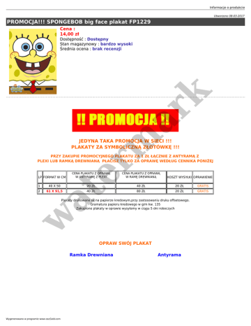 Informacje o produkcie Utworzono 08-03-2017 PROMOCJA!!! SPONGEBOB big face plakat FP1229 Cena : 14,00 zł er m ar k Dostępność : Dostępny Stan magazynowy : bardzo wysoki Średnia ocena : brak recenzji JEDYNA TAKA PROMOCJA W SIECI !!! PLAKATY ZA SYMBOLICZNĄ ZŁOTÓWKĘ !!! PRZY ZAKUPIE PROMOCYJNEGO PLAKATU ZA 1 ZŁ ŁĄCZNIE Z ANTYRAMĄ Z PLEXI LUB RAMKĄ DREWNIANĄ PŁACISZ TYLKO ZA OPRAWĘ WEDŁUG CENNIKA PONIŻEJ LP FORMAT W CM 2 40 X 50 CENA PLAKATU Z OPRAWĄ W RAMĘ DREWNIANĄ 20 ZŁ 40 ZŁ 20 ZŁ GRATIS 80 ZŁ 20 ZŁ GRATIS at 1 CENA PLAKATU Z OPRAWĄ W ANTYRAMĘ Z PLEXI 61 X 91,5 40 ZŁ KOSZT WYSYŁKI OPRAWIENIE w Plakaty drukowane są na papierze kredowym,przy zastosowaniu druku offsetowego. Gramatura papieru kredowego w g/m kw. 135 Zakupione plakaty w oprawie wysyłamy w ciągu 5 dni roboczych OPRAW SWÓJ PLAKAT Ramka Drewniana Wygenerowano w programie www.oscGold.com Antyrama er m ar k at ZOBACZ RÓWNIEŻ RAMY DREWNIANE w ANTYRAMY TABLICE KORKOWE PLAKATY w at er m ar k Informacje o produkcie Wygenerowano w programie www.oscGold.com