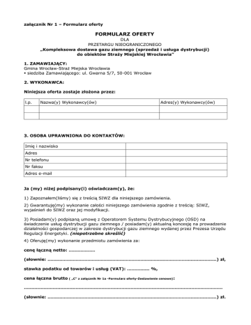 załącznik Nr 1 – Formularz oferty FORMULARZ OFERTY DLA PRZETARGU NIEOGRANICZONEGO „Kompleksowa dostawa gazu ziemnego (sprzedaż i usługa dystrybucji) do obiektów Straży Miejskiej Wrocławia” 1. ZAMAWIAJĄCY: Gmina Wrocław-Straż Miejska Wrocławia siedziba Zamawiającego: ul. Gwarna 5/7, 50-001 Wrocław 2. WYKONAWCA: Niniejsza oferta zostaje złożona przez: l.p. Nazwa(y) Wykonawcy(ów) Adres(y) Wykonawcy(ów) 3. OSOBA UPRAWNIONA DO KONTAKTÓW: Imię i nazwisko Adres Nr telefonu Nr faksu Adres e-mail Ja (my) niżej podpisany(i) oświadczam(y), że: 1) Zapoznałem(liśmy) się z treścią SIWZ dla niniejszego zamówienia. 2) Gwarantuję(my) wykonanie całości niniejszego zamówienia zgodnie z treścią: SIWZ, wyjaśnień do SIWZ oraz jej modyfikacji. 3) Posiadam(y) podpisaną umowę z Operatorem Systemu Dystrybucyjnego (OSD) na świadczenie usług dystrybucji gazu ziemnego / posiadam(y) aktualną koncesję na prowadzenie działalności gospodarczej w zakresie dystrybucji gazu ziemnego wydanej przez Prezesa Urzędu Regulacji Energetyki. (niepotrzebne skreślić) 4) Oferuję(my) wykonanie przedmiotu zamówienia za: cenę łączną netto: ……………… (słownie: ………………………………………………………………………………….................….) zł, stawka podatku od towarów i usług (VAT): ………...... %, cena łączna brutto ( „C“ z załącznik Nr 1a -Formularz oferty-Zestawienie cenowe) : …..............................................................................................................……………… (słownie: ……………………………………………………………………………………..................) zł. 5) Podana całkowita cena brutto obejmuje wszystkie koszty niezbędne do należytego wykonania zamówienia. 6) Oferuję(my) wykonanie przedmiotowego zamówienia w terminie określonym w SIWZ. 7) Uważam(y) się za związanych niniejszą ofertą na czas wskazany w SIWZ, tj. 30 dni od terminu składania ofert. 8) W przypadku uznania mojej (naszej) oferty za najkorzystniejszą zobowiązuję(emy) się zawrzeć umowę w miejscu i terminie jakie zostaną wskazane przez Zamawiającego. 9) Składam(y) niniejszą ofertę we własnym imieniu / jako Wykonawcy wspólnie ubiegający się o udzielenie zamówienia. (niepotrzebne skreślić) 10) Nie uczestniczę(ymy) jako Wykonawca w jakiejkolwiek innej ofercie złożonej w celu udzielenie niniejszego zamówienia. 11) Na podstawie art. 8 ust. 3 ustawy z dnia 29 stycznia 2004 r. Prawo zamówień publicznych (tekst jednolity Dz. U. z 2010 r. nr 113 poz. 759 z późn. zm.), żadne z informacji zawartych w ofercie nie stanowią tajemnicy przedsiębiorstwa w rozumieniu przepisów o zwalczaniu nieuczciwej konkurencji / wskazane poniżej informacje zawarte w ofercie stanowią tajemnicę przedsiębiorstwa w rozumieniu przepisów o zwalczaniu nieuczciwej konkurencji i w związku z niniejszym nie mogą być one udostępniane, w szczególności innym uczestnikom postępowania (niepotrzebne skreślić) l.p. oznaczenie rodzaju (nazwa) informacji strony w ofercie od do 12) Nie zamierzam(y) powierzać do podwykonania żadnej części niniejszego zamówienia podwykonawcom / następujące części niniejszego zamówienia zamierzam(y) powierzyć podwykonawcom (niepotrzebne skreślić) : l.p. Wykaz części zamówienia powierzonych podwykonawcy 1 2 _________________________________ data, imię i nazwisko podpis uprawnionego przedstawiciela Wykonawcy pieczęć firmowa wykonawcy załącznik Nr 1a -Formularz oferty-Zestawienie cenowe FORMULARZ OFERTY zestawienie cenowe DLA PRZETARGU NIEOGRANICZONEGO „Kompleksowa dostawa gazu ziemnego (sprzedaż i usługa dystrybucji) do obiektów Straży Miejskiej Wrocławia” 1. ZAMAWIAJĄCY: Gmina Wrocław-Straż Miejska Wrocławia siedziba Zamawiającego: ul. Gwarna 5/7, 50-001 Wrocław 2. WYKONAWCA: Niniejsza oferta zostaje złożona przez: l.p. Nazwa(y) Wykonawcy(ów) 3. Adres(y) Wykonawcy(ów) ZESTAWIENIE CEN: TABELA NR 1 obiekt ul.Pautscha 4 pierwszy układ pomiarowy b=moc umowna, gdzie b <= 10 m3/h 1 ilość jednostek 2 paliwo gazowe 32 640m3 opłata -abonament za sprzedaż paliwa gazowego 24m-cy opłata sieciowa zmienna 32 640m3 opłata sieciowa stała 24m-c cena jednostkowa netto 3 wartość netto (kol.2xkol.3) 4 stawka vat w % 5 C1 =cena brutto z Tabeli Nr1 wartość brutto (kol.4+ kol.4 x kol.5) 6 suma z kol.6 ................... TABELA NR 2 obiekt ul.Pautscha 4 drugi układ pomiarowy b=moc umowna, gdzie b <= 10 m3/h ilość jednostek 1 2 paliwo gazowe 260m3 opłata -abonament za sprzedaż paliwa gazowego 24m-cy opłata sieciowa zmienna 260m3 opłata sieciowa stała 24m-cy C1 =cena brutto z Tabeli Nr1 cena jednostkowa netto 3 wartość netto (kol.2xkol.3) 4 stawka vat w % 5 wartość brutto (kol.4+ kol.4 x kol.5) 6 suma z kol.6 ................... TABELA NR 3 obiekt ul.Kosmonautów 274 b=moc umowna, gdzie 10<b<=65m3/h ilość jednostek 1 cena jednostkowa netto 2 paliwo gazowe 84 000 m3 opłata -abonament za sprzedaż paliwa gazowego 24 m-cy opłata sieciowa zmienna 84000m3 wartość netto (kol.2xkol.3) 3 4 stawka vat wartość brutto w% (kol.4+ kol.4 x kol.5) 5 6 opłata sieciowa stała przy 2 lata x 8760h w mocy zamówionej 58m3/h w roku x 58m3/h (moc okresie 24 m-cy zamówiona)= 1016160 C3=cena brutto z Tabeli Nr3 suma z kol.6 ................... Ceny jednostkowe podane przez Wykonawcę za sprzedaż gazu, opłaty abonamentowe i za usługę dystrybucji (opłaty stałe i zmienne) nie mogą być wyższe niż ceny obowiązujące na dzień składania oferty (zgodne z obowiązującą taryfą Wykonawcy zatwierdzoną przez Prezesa Urzędu Regulacji Energetyki). 4. OBLICZENIE CENY CAŁKOWITEJ BRUTTO Cenę całkowitą brutto należy obliczyć wg wzoru: C=C1+C2+C3 TABELA NR 4 oznaczenie cena w zł 1 2 C1 (cena brutto , to jest suma z kolumny 6 Tabela Nr1) .....................................zł C2 (cena brutto, to jest suma z kolumny 