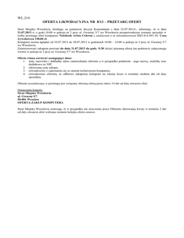 WL.214 OFERTA LIKWIDACYJNA NR 8/13 – PRZETARG OFERT Straż Miejska Wrocławia, działając na podstawie decyzji Komendanta z dnia 22.07.2013r., informuje, że w dniu 31.07.2013 r. o godz.10:00 w pokoju nr 2 przy ul. Gwarnej 5/7 we Wrocławiu przeprowadzona zostanie sprzedaż w trybie przetargu ofert komputera Notebook Aristo Celeron z zasilaczem o nr inwentarzowym SM2-0-4-491-30. Cena wywoławcza 150,00 zł. Komputer można oglądać od 24.07.2013 do 30.07.2013 w godzinach 10:00 – 14:00 w pokoju nr 2 przy ul. Gwarnej 5/7 we Wrocławiu. Zainteresowani zakupem powinni do dnia 31.07.2013 do godz. 9:30 złożyć pisemną ofertę (na podstawie załączonego wzoru) w pokoju nr 2 przy ul. Gwarnej 5/7 we Wrocławiu. Oferta winna zawierać następujące dane: 1. imię, nazwisko i dokładny adres zamieszkania oferenta a w przypadku podmiotu - jego nazwę, siedzibę oraz dodatkowo nr NIP, 2. oferowaną cenę zakupu, 3. oświadczenie o zapoznaniu się ze stanem technicznym komputera, 4. oświadczenie oferenta, że odbierze zakupiony komputer na własny koszt w terminie siedmiu dni od daty sprzedaży. Oferent uczestniczący w przetargu jest związany złożoną ofertą przez okres 14 dni od daty otwarcia ofert. Oznaczenie koperty: Straż Miejska Wrocławia ul. Gwarna 5/7 50-001 Wrocław OFERTA-ZAKUP KOMPUTERA Straż Miejska Wrocławia zastrzega, iż w przypadku nie uiszczenia przez Oferenta oferowanej kwoty w terminie 2 dni od daty otwarcia ofert wybrana zostanie kolejna oferta cenowa. Wzór oferty Oferta na zakup komputera Notebook Aristo Celeron z zasilaczem o nr inwentarzowym SM2-0-4-491-30 Dane oferenta Imię i nazwisko / Nazwa ............................................................................................... NIP (w przypadku podmiotu) ........................................................................................ Adres / Siedziba ............................................................................................................. Numer telefonu kontaktowego ...................................................................................... Oferowana cena zakupu.............................................................................................. Oświadczam, że zapoznałem się ze stanem technicznym komputera oraz, że zakupiony komputer odbiorę na swój koszt w terminie 7 dni od daty zakupu. …...................................... (podpis oferenta)