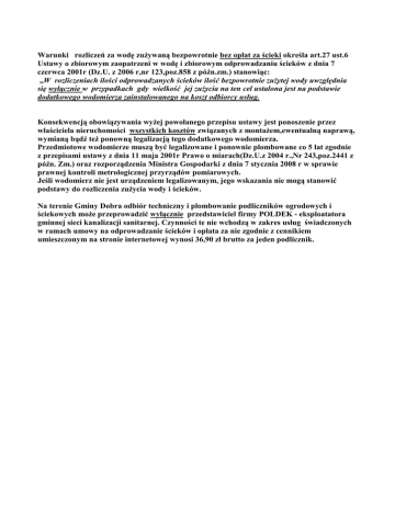 Warunki rozliczeń za wodę zuŜywaną bezpowrotnie bez opłat za ścieki określa art.27 ust.6 Ustawy o zbiorowym zaopatrzeni w wodę i zbiorowym odprowadzaniu ścieków z dnia 7 czerwca 2001r (Dz.U. z 2006 r,nr 123,poz.858 z późn.zm.) stanowiąc: „W rozliczeniach ilości odprowadzanych ścieków ilość bezpowrotnie zuŜytej wody uwzględnia się wyłącznie w przypadkach gdy wielkość jej zuŜycia na ten cel ustalona jest na podstawie dodatkowego wodomierza zainstalowanego na koszt odbiorcy usług. Konsekwencją obowiązywania wyŜej powołanego przepisu ustawy jest ponoszenie przez właściciela nieruchomości wszystkich kosztów związanych z montaŜem,ewentualną naprawą, wymianą bądź teŜ ponowną legalizacją tego dodatkowego wodomierza. Przedmiotowe wodomierze muszą być legalizowane i ponownie plombowane co 5 lat zgodnie z przepisami ustawy z dnia 11 maja 2001r Prawo o miarach(Dz.U.z 2004 r.,Nr 243,poz.2441 z późn. Zm.) oraz rozporządzenia Ministra Gospodarki z dnia 7 stycznia 2008 r w sprawie prawnej kontroli metrologicznej przyrządów pomiarowych. Jeśli wodomierz nie jest urządzeniem legalizowanym, jego wskazania nie mogą stanowić podstawy do rozliczenia zuŜycia wody i ścieków. Na terenie Gminy Dobra odbiór techniczny i plombowanie podliczników ogrodowych i ściekowych moŜe przeprowadzić wyłącznie przedstawiciel firmy POLDEK - eksploatatora gminnej sieci kanalizacji sanitarnej. Czynności te nie wchodzą w zakres usług świadczonych w ramach umowy na odprowadzanie ścieków i opłata za nie zgodnie z cennikiem umieszczonym na stronie internetowej wynosi 36,90 zł brutto za jeden podlicznik.