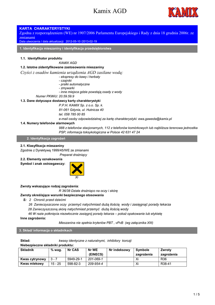 R Kamix AGD KARTA CHARAKTERYSTYKI Zgodna z rozporządzeniem (WE) nr 1907/2006 Parlamentu Europejskiego i Rady z dnia 18 grudnia 2006r. ze zmianami Data utworzenia / data aktualizacji: 2012-05-10 /2013-02-19 1. Identyfikacja mieszaniny i identyfikacja przedsiębiorstwa 1.1. Identyfikator produktu KAMIX AGD 1.2. Istotne zidentyfikowane zastosowania mieszaniny Czyści z osadów kamienia urządzenia AGD zasilane wodą: - ekspresy do kawy i herbaty - czajniki - pralki automatyczne - zmywarki - inne miejsca gdzie powstają osady z wody Numer PKWiU: 20.59.59.9 1.3. Dane dotyczące dostawcy karty charakterystyki P.P.H. KAMIX Sp. z o.o. Sp. k. 81-061 Gdynia, ul. Hutnicza 40 tel. 058 785 00 85 e-mail osoby odpowiedzialnej za kartę charakterystyki: [email protected] 1.4. Numery telefonów alarmowych 988 z telefonów stacjonarnych, 112 z telefonów komórkowych lub najbliższa terenowa jednostka PSP; informacja toksykologiczna w Polsce 42 631 47 24 2. Identyfikacja zagrożeń 2.1. Klasyfikacja mieszaniny Zgodnie z Dyrektywą 1999/45/WE ze zmianami Preparat drażniący 2.2. Elementy oznakowania Symbol i znak ostrzegawczy: Xi Zwroty wskazujące rodzaj zagrożenia: R 36/38 Działa drażniąco na oczy i skórę Zwroty określające warunki bezpiecznego stosowania S: 2 Chronić przed dziećmi 26 Zanieczyszczone oczy przemyć natychmiast dużą ilością wody i zasięgnąć porady lekarza 28 Zanieczyszczoną skórę natychmiast przemyć dużą ilością wody 46 W razie połknięcia niezwłocznie zasięgnij porady lekarza – pokaż opakowanie lub etykietę Inne zagrożenia: Mieszanina nie spełnia kryteriów PBT , vPvB (wg załącznika XIII) 3. Skład/ informacja o składnikach Skład: kwasy identyczne z naturalnymi, inhibitory korozji Niebezpieczne składniki produktu: Składnik % wag. Nr CAS Nr WE Nr indeksowy (EINECS) Kwas cytrynowy 3 - 7 201-069-1 5949-29-1 Kwas mlekowy 209-954-4 15 - 25 598-82-3 Symbole zagrożenia Xi Xi Zwroty zagrożenia R36 R38-41 1/5 Kamix AGD R 4. Środki pierwszej pomocy 4.1. Opis środków pierwszej pomocy Po wdychaniu: Zapewnić dobrą wentylację, w razie dolegliwości wezwać lekarza. Po styczności ze skórą: Dobrze spłukać wodą Po styczności z okiem: Przemywać oczy pod bieżącą wodą, w razie wystąpienia niepokojących objawów zasięgnąć porady lekarza. Po przełknięciu: Przepłukać jamę ustną i obficie popić wodą. Nie powodować wymiotów i zasięgnąć porady lekarza. 4.2. Najważniejsze ostre i opóźnione objawy i skutki narażenia Wdychanie oparów jest drażniące dla układu oddechowego, może powodować ból gardła, kaszel. Długotrwała styczność ze skórą: Może powodować podrażnienie skóry Styczność z okiem: Może powodować podrażnienie oka, zapalenie spojówki, uszkodzenie rogówki. Połknięcie: Może powodować podrażnienie układu pokarmowego, nudności, wymioty, biegunkę. 5. Postępowanie w przypadku pożaru 5.1. Środki gaśnicze: środki pianotwórcze, woda – prądy rozproszone, proszki gaśnicze, dwutlenek węgla Niedozwolone środki gaśnicze - silny strumień wody 5.2. Szczególne zagrożenie związane z mieszaniną w wysokiej temperaturze niebezpieczeństwo emisji toksycznych gazów 5.3. Informacje dla straży pożarnej Mieszanina niepalna. Zabiegi gaszenia ognia dostosować do otoczenia i materiałów składowanych w pobliżu. Nie przebywać w strefie zagrożenia bez specjalnej odzieży ochronnej i indywidualnego aparatu do oddychania. 6. Postępowanie w przypadku niezamierzonego uwolnienia do środowiska 6.1. Indywidualne środki ostrożności, wyposażenie ochronne i procedury w sytuacjach awaryjnych: Stosować środki ochrony indywidualnej. Unikać kontaktu z preparatem, unikać wdychania par. 6.2. Środki ostrożności w zakresie ochrony środowiska Nie dopuścić do przedostania się do kanalizacji, wód i gleby. 6.3. Metody i materiały zapobiegające rozprzestrzenianiu się skażenia i służące do usuwania skażenia O ile to możliwe zatrzymać wyciek. Rozlany płyn przysypać materiałem pochłaniającym i zebrać do szczelnego opakowania i przekazać do usunięcia. Oczyścić skażone miejsce. W przypadku przedostania się większej ilości do zbiorników wodnych lub kanalizacji zawiadomić właściwe władze. 6.4. Odniesienie do innych akcji Środki ochrony indywidualnej - patrz pkt 8. Postępowanie z odpadami - patrz pkt 13. 7. Postępowanie z mieszaniną i jej magazynowanie 7.1. Środki ostrożności dotyczące bezpiecznego postępowania Postępować zgodnie z zasadami dobrej praktyki przemysłowej oraz ogólnymi zasadami bezpieczeństwa i higieny pracy z preparatami chemicznymi. Stosować środki ochrony zgodnie z pkt. 8. Pracować w dobrze wentylowanym pomieszczeniu. 7,2. Warunki bezpiecznego magazynowania, łącznie z informacjami dotyczącymi wszelkich wzajemnych niezgodności Przechowywać w szczelnych opakowaniach w chłodnym, dobrze wentylowanym magazynie. Nie dopuścić do kontaktu z alkaliami (ługami) i środkami utleniającymi. 7.3. Szczególne zastosowania końcowe Patrz pkt 1.2. 2/5 Kamix AGD R 8. Kontrola narażenia i środki ochrony indywidualnej 8.1. Parametry dotyczące kontroli NDS, NDSCh, NDSP nie ustalone Dz. U. nr 217, Rozporządzenie z dnia 29 listopada 2002 (poz. 1833) 8.2. Kontrola narażenia Środki ochrony indywidualnej: dróg oddechowych: maska przeciwgazowa wskazana gdy tworzą się pary rąk: używać rękawice ochronne kwasoodporne oczu i twarzy: zalecane okulary ochronne typu gogle skóry: robocza odzież ochronna 9. Właściwości fizyczne i chemiczne 9.1. Informacje na temat podstawowych właściwości fizycznych i chemicznych Postać: bezbarwna do żółtawej cieccz Zapach: charakterystyczny pH: w rozcieńczeniu roboczym 20% ok. 2 Temperatura wrzenia: ok. 100°C topnienia: poniżej 0°C zapłonu: nie dotyczy samozapłonu: nie dotyczy Palność: produkt niepalny Właściwości wybuchowe: produkt nie grozi wybuchem Właściwości utleniające: nie dotyczy Prężności pa