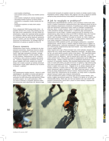 - zwrot kosztów rehabilitacji, - zwrot kosztów zakupu protez oraz środków pomocniczych, - zwrot kosztów niezbędnych operacji plastycznych, - refundację kosztów leczenia na terenie Polski, - świadczenia w przypadku trwałej niezdolności do pracy, - świadczenia szpitalne za każdy dzień pobytu w szpitalu. Formy ubezpieczeń NNW bywają bardzo różne - na przykład niektóre firmy kuszą niską składką przy bardzo dużej sumie ubezpieczenia, ale żeby dostać odszkodowanie, trzeba ulec naprawdę bardzo poważnemu wypadkowi. Bardzo ważne jest też sprawdzenie, czy kupowana przez nas polisa obejmuje uprawianie sportu w wydaniu, jaki nas interesuje - rekreacyjnie, wyczynowo lub ekstremalnie. Ze zwykłego NNW nie dostaniecie ani grosza za wypadek na torze 4X. Casco roweru Ubezpieczenie Casco roweru, analogicznie do ubezpieczenia samochodu, obejmować powinno szkody polegające na uszkodzeniu, zniszczeniu lub utracie roweru, bądź jego wyposażenia wskutek: różnego rodzaju zdarzeń losowych, a także wypadku, rabunku oraz kradzieży. Ubezpieczenie się od kradzieży z mieszkania, domu piwnicy lub garażu jest łatwiejsze - wystarczy ubezpieczyć mieszkanie. Gorzej już sprawa wygląda, jeśli rower ukradną nam sprzed sklepu lub w czasie wycieczki po bardziej odludnych zakamarkach miasta, gdzie natkniemy się na panów w dresach i z pałkami. KL Czyli ubezpieczenie kosztów leczenia - dotyczy to osób wyjeżdżających, aby jeździć na rowerze poza granice Polski lub też na granicy Polski. Koszty leczenia, poszukiwania lub akcji ratowniczej poza granicami Polski są bardzo wysokie i nie w pełni pokrywane z NFZ. Już nawet na Słowacji w przypadku zgubienia szlaku lub konieczności akcji ratowniczej (np. złamana noga 50 bi k eBoar d #5 czerwiec 2007 i konieczność transportu do szpitala) narazić się możemy na bardzo wysokie koszty. Przykładowo rodzice małego chłopca, który zaginął w tym roku w Tatrach za szeroko zakrojoną akcję poszukiwawczą muszą zapłacić równowartość 68 000 zł A jak to wygląda w praktyce? Ubezpieczenie odpowiedzialności cywilnej w życiu prywatnym można kupić praktycznie w każdym towarzystwie ubezpieczeniowym jako oddzielną polisę lub jest to część składową ubezpieczenia mieszkania. W podstawowym zakresie najczęściej ujęte jest rekreacyjne użytkowanie roweru (razem ze szkodami wyrządzonymi przez psy, dzieci, a nawet kosiarki). Często nie zdajemy sobie nawet do końca z faktu posiadania takiego ubezpieczenia i z możliwości jego wykorzystania. Ubezpieczenie nie jest drogie, a składka uzależniona jest od wysokości sumy ubezpieczenia, która może się wahać od 10 000 zł (składka rzędu 10 zł rocznie) do nawet 1 000 000 zł (składka ok. 200 zł rocznie). Jednak - jeśli bierzemy udział w jakiś zawodach (maratony) lub jazda na rowerze nie może w żaden sposób zostać nazwana rekreacją - downhill itp. to niestety zakres ubezpieczenia musi zostać rozszerzony (oczywiście za dodatkową składkę). Ubezpieczenie NNW, podobnie jak OC, jest dostępne praktycznie u wszystkich ubezpieczycieli. Jednak różnice w składce mogą być bardzo duże ze względu na zakres ubezpieczenia i możliwości skorzystania z opcji dodatkowych. Ubezpieczenie w formie grupy zorganizowanej daje duże korzyści - przy niższej składce otrzymujemy większy zakres. Casco rowerów jest wciąż w Polsce tematem tabu wśród zakładów ubezpieczeń. Jedynie PZU ma w swojej ofercie pakiet „Bezpieczny rowerzysta”. Ale gdyby zakres był taki, jak został opisany powyżej, byłoby to zbyt piękne - PZU odpowiada jedynie za zdarzenia losowe, wypadek oraz rabunek. Niestety od kradzieży „z ulicy” nikt w Polsce roweru nie ubezpieczy - pole do oszustw jest tu zbyt duże. Do tego maksymalna wartość roweru, którą możemy przyjąć do ubezpieczenia wynosi 5000 zł. Podsumowując - niestety w Polsce wciąż nie ma ubezpieczeń skierowanych i ukierunkowanych na rowerzystów. Pakietów, które dawałyby bezpieczeństwo jazdy i świadomość, że nawet jeśli zrobimy coś sobie lub komuś, to wyjdziemy z tego obronną ręką. Czym jest to spowodowane? W Polsce sprzedaje się ok. 1 mln rowerów rocznie, prawie w każdym domu jest rower… Wygląda na to, że zakłady ubezpieczeń wychodzą z założenia, że każdy może na własną rękę „skompletować” sobie taki pakiet ubezpieczeń ogólnie dostępnych - OC, NNW. Natomiast rękami i nogami bronią się przed ubezpieczaniem samych rowerów. Niezrozumiały jest brak możliwości (poza PZU) ubezpieczenia się od wypadku, czy utraty roweru w przypadku zdarzeń losowych (pożar) poza miejscem zamieszkania. A takie kompletowanie pakietu na własną rękę oznacza wyższą składkę. Tylko pakiety mogłyby spowodować spadek cen. Przyszło mi do głowy, że nie tylko mnie interesowałby takowy. Może więc uda nam się wspólnie coś z tym zrobić? Jeśli jesteście zainteresowani czymś takim, piszcie na adres redakcji z dopiskiem/tematem ubezpieczenia.