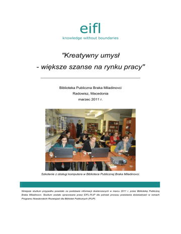 eifl knowledge without boundaries "Kreatywny umysł - większe szanse na rynku pracy" _________________________________________________ Biblioteka Publiczna Braka Miladinovci Radowisz, Macedonia marzec 2011 r. Szkolenie z obsługi komputera w Bibliotece Publicznej Braka Miladinovci. Niniejsze studium przypadku powstało na podstawie informacji dostarczonych w marcu 2011 r. przez Bibliotekę Publiczną Braka Miladinovci. Studium zostało opracowane przez EIFL-PLIP dla potrzeb procesu powielania doświadczeń w ramach Programu Nowatorskich Rozwiązań dla Bibliotek Publicznych (PLIP). STRESZCZENIE NOWATORSKI POMYSŁ Rozwinięcie umiejętności poszukiwania pracy i pewności siebie dzięki szkoleniom z zakresu nowoczesnych technologii oraz zapewnieniu serwisu informacyjnego dla bezrobotnych. PROJEKT Projekt Kreatywny umysł - większe szanse na rynku pracy dotyczy osób bezrobotnych mieszkających w gminach Radowisz i Konce w południowo-wschodniej Macedonii. Usługa adresowana jest szczególnie do bezrobotnych kobiet, którym brakuje motywacji i pewności siebie, aby szukać pracy i które nie mogą sobie pozwolić na udział w komercyjnych szkoleniach. Działa ona na różnych poziomach: rozwija motywację i pewność siebie, zapewnia szkolenie w dziedzinie nowoczesnych technologii, dzięki czemu bezrobotni mają możliwość nabycia potrzebnych umiejętności; uczy ludzi, jak pisać CV, jak wypełnić formularz aplikacyjny oraz jak się zachowywać i odpowiadać na pytania podczas rozmowy kwalifikacyjnej. NAJWAŻNIEJSZE OSIĄGNIĘCIA W ramach usługi przeszkolonych zostało 67 osób. Z tego 31 (46%) udało się znaleźć pracę. 2/EIFL Studium przypadku – Macedonia Plakat promujący usługę pn. „Kreatywne umysły stwarzają możliwości znalezienia pracy”. 3/EIFL Studium przypadku – Macedonia STUDIUM PRZYPADKU – KREATYWNY UMYSŁ – WIĘKSZE SZANSE NA RYNKU PRACY WPROWADZENIE Radowisz to miasto liczące około 28 250 mieszkańców. Leży ono w południowo-wschodniej Macedonii, u podnóża góry Plackovicaon. Według statystyki gminnej około 20% mieszkańców Radowisza i pobliskiej wioski Konce to osoby bezrobotne. Ponad 38% wszystkich bezrobotnych stanowią kobiety, a prawie 50% to osoby w wieku od 20 do 40 lat. Bezrobocie w gminie jest wynikiem powolnego i niedostatecznego rozwoju gospodarczego, braku wykwalifikowanej siły roboczej oraz braku proaktywnego przedsiębiorczego podejścia ze strony młodych ludzi. Sytuacja w Radowiszu i Koncach odzwierciedla problem istniejący na większą skalę: bezrobocie w Macedonii wynosi 35%. Tworzenie nowych możliwości znalezienia pracy stanowi główny priorytet planu strategicznego na lata 2007-2011 dla dwóch gmin: Radowisz i Konce. Biblioteka Publiczna Braka Miladinovci obsługuje obie gminy – społeczność liczącą łącznie około 32 tys. mieszkańców. Jako dostępna dla wszystkich instytucja, biblioteka jest w stanie pomóc w rozwiązaniu problemu bezrobocia. Powstała w 1957 r. biblioteka została zmodernizowana w 2006 r. i obecnie stanowi wielofunkcyjne centrum, oferujące dostęp do informacji w formie pisemnej i elektronicznej. Biblioteka świadczy tradycyjne usługi biblioteczne (wypożyczanie książek/czasopism/gazet), zapewnia dostęp do Internetu za pośrednictwem sześciu komputerów przeznaczonych do powszechnego użytku, możliwość skanowania i drukowania dokumentów, robienia fotokopii, organizuje też imprezy kulturalno-społeczne. We współpracy z gminą i lokalnymi instytucjami, prywatnymi firmami i organizacjami pozarządowymi biblioteka organizuje warsztaty, kursy językowe i obrady okrągłego stołu dotyczące ważnych lokalnych kwestii, a także wystawy i prezentacje. Biblioteka zatrudnia tylko czterech pracowników i zajmuje niewielką powierzchnię (340 m2), ale jest dobrze znana wśród bibliotek w Macedonii ze swojej nowatorskiej działalności. Klucze do jej sukcesu to: tworzenie przestrzeni, która jest funkcjonalna, atrakcyjna i dostosowana do potrzeb użytkowników, nowoczesne technologie i nowatorskie usługi. Zachęcanie do czytania oraz zdobywania umiejętności czytania i pisania od najmłodszych lat, a także uczenie metod samodzielnego poszukiwania informacji przy odrabianiu pracy 4/EIFL Studium przypadku – Macedonia domowej przez młodzież szkolną i studentów stanowią element codziennej pracy personelu biblioteki. Biblioteka oferuje przyjazne środowisko wszystkim grupom wiekowym i jest dostępna dla osób niepełnosprawnych. Z dumą realizuje motto: „Przyjazne biblioteki dla wszystkich obywateli”. Nowa usługa Kreatywny umysł - większe szanse na rynku pracy dobrze wpisuje się w potrzeby otoczenia i stanowi dalsze rozwinięcie naszych usług. OPIS PROJEKTU Analiza potrzeb Biblioteka przeprowadziła badanie ankietowe wśród bezrobotnych użytkowników biblioteki w wieku od 18 do 40 lat. Wyniki pokazały, że brak podstawowych umiejętności dotyczących obsługi komputera oraz brak środków na opłacenie kursów szkoleniowych stanowiły dwa spośród głównych powodów braku konkurencyjności młodych ludzi na rynku pracy. Ponadto system edukacji formalnej nie daje młodym ludziom wiedzy ani umiejętności w zakresie autoprezentacji podczas ubiegania się o pracę. Cele dalsze i bliższe Projekt Kreatywny umysł - większe szanse na rynku pracy stanowi rozwinięcie usług biblioteki. Ma on na celu zwiększenie możliwości uczenia się przez całe życie przez grupy osób społecznie wykluczonych, poprzez: • rozwijanie i wzmacnianie umiejętności związanych z posługiwaniem się nowoczesnymi technologiami przez młode osoby bezrobotne; • doskonalenie umiejętności poszukiwania pracy przez młodych ludzi oraz prezentowania swoich możliwości przy wykorzystaniu technologii, (np. projektowanie CV na komputerze oraz korzystanie z dostępnych online systemów składania podań); • zachęcanie do proaktywnego podejścia w poszukiwaniu pracy; • zachęcanie kobiet i