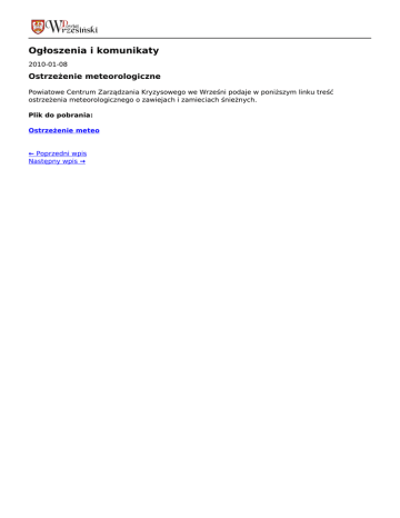 Ogłoszenia i komunikaty 2010-01-08 Ostrzeżenie meteorologiczne Powiatowe Centrum Zarządzania Kryzysowego we Wrześni podaje w poniższym linku treść ostrzeżenia meteorologicznego o zawiejach i zamieciach śnieżnych. Plik do pobrania: Ostrzeżenie meteo ← Poprzedni wpis Następny wpis →