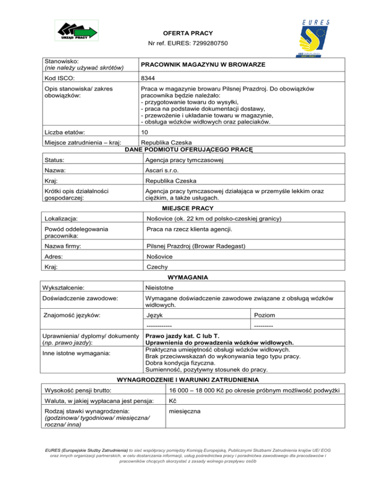 OFERTA PRACY Nr ref. EURES: 7299280750 Stanowisko: (nie