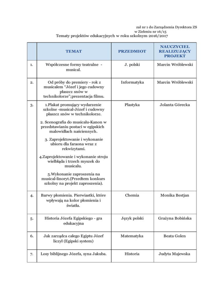 zał nr 1 do Zarządzenia Dyrektora ZS w Zieleniu nr 16/15 Tematy projektów edukacyjnych w roku szkolnym 2016/2017 TEMAT PRZEDMIOT NAUCZYCIEL REALIZUJĄCY PROJEKT 1. Współczesne formy teatralne musical. J. polski Marcin Wróblewski 2. Od próby do premiery rok z musicalem “Józef i jego cudowny płaszcz snów w technikolorze”;prezentacja filmu. Informatyka Marcin Wróblewski 3. 1.Plakat promujący wydarzenie szkolne musicalJózef i cudowny płaszcz snów w technikolorze. Plastyka Jolanta Górecka 2. Scenografia do musicaluKanon w przedstawianiu postaci w egipskich malowidłach naściennych. 3. Zaprojektowanie i wykonanie ubioru dla faraona wraz z rekwizytami. 4.Zaprojektowanie i wykonanie stroju wielbłąda i trzech myszek do musicalu. 5.Wykonanie z aproszenia na musicallinoryt.(Przedtem konkurs szkolny na projekt z aproszenia). 4. Barwy płomienia. Pierwiastki, które wpływają na kolor płomienia i światła. Chemia Monika Bestjan 5. Historia Józefa Egipskiego gra edukacyjna Język polski Grażyna Bobińska 6. Jak z arządca całego Egiptu Józef liczył (Egipski system) Matematyka Beata Golen 7. Losy biblijnego Józefa, syna Jakuba. Historia Judyta Majewska 8. Szata św. Józefa projekt, wykonanie. Technika Dariusz Langowski 9. Tłumaczenie tekstów wybranych piosenek z musicalu “Józef i jego cudowny płaszcz snów w technikolorze” przygotowanie albumu. J. angielski Agnieszka Trendewicz 10 . Jak Egipcjanie wyznaczali katy proste? Matematyka Bartłomiej Wasilewski 11. Pojęcie “wybaczenie” na podstawie wydarzeń z z ż ycia Józefa Egipskiego, prezentacja lub przedstawienie Religia Ewa Kurzyńska 12. Tradycje i obrzędy w krajach niemieckojęzycznych J. niemiecki Sławomir Jablonski Wf Justyna Rumińska Sul 13. Tworzenie ukladow choreograficznych do wybranych utworów muzycznych.