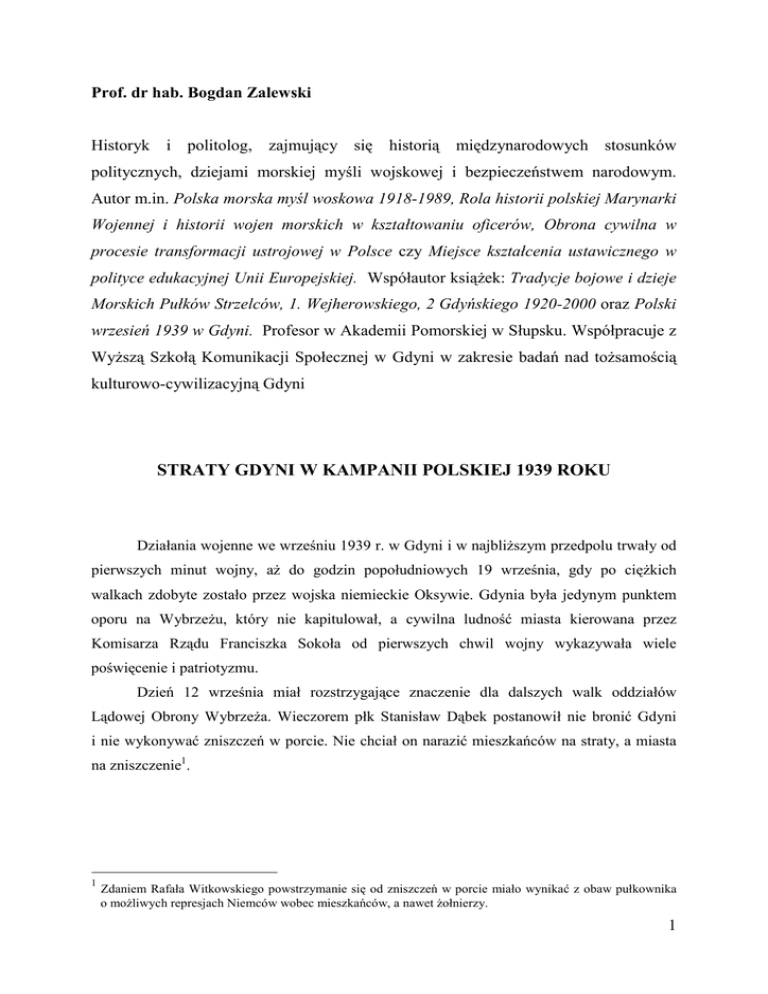 Prof. dr hab. Bogdan Zalewski Historyk i politolog, zajmujący się historią międzynarodowych stosunków politycznych, dziejami morskiej myśli wojskowej i bezpieczeństwem narodowym. Autor m.in. Polska morska myśl woskowa 1918-1989, Rola historii polskiej Marynarki Wojennej i historii wojen morskich w kształtowaniu oficerów, Obrona cywilna w procesie transformacji ustrojowej w Polsce czy Miejsce kształcenia ustawicznego w polityce edukacyjnej Unii Europejskiej. Współautor ksiąŜek: Tradycje bojowe i dzieje Morskich Pułków Strzelców, 1. Wejherowskiego, 2 Gdyńskiego 1920-2000 oraz Polski wrzesień 1939 w Gdyni. Profesor w Akademii Pomorskiej w Słupsku. Współpracuje z WyŜszą Szkołą Komunikacji Społecznej w Gdyni w zakresie badań nad toŜsamością kulturowo-cywilizacyjną Gdyni STRATY GDYNI W KAMPANII POLSKIEJ 1939 ROKU Działania wojenne we wrześniu 1939 r. w Gdyni i w najbliŜszym przedpolu trwały od pierwszych minut wojny, aŜ do godzin popołudniowych 19 września, gdy po cięŜkich walkach zdobyte zostało przez wojska niemieckie Oksywie. Gdynia była jedynym punktem oporu na WybrzeŜu, który nie kapitulował, a cywilna ludność miasta kierowana przez Komisarza Rządu Franciszka Sokoła od pierwszych chwil wojny wykazywała wiele poświęcenie i patriotyzmu. Dzień 12 września miał rozstrzygające znaczenie dla dalszych walk oddziałów Lądowej Obrony WybrzeŜa. Wieczorem płk Stanisław Dąbek postanowił nie bronić Gdyni i nie wykonywać zniszczeń w porcie. Nie chciał on narazić mieszkańców na straty, a miasta na zniszczenie1. 1 Zdaniem Rafała Witkowskiego powstrzymanie się od zniszczeń w porcie miało wynikać z obaw pułkownika o moŜliwych represjach Niemców wobec mieszkańców, a nawet Ŝołnierzy. 1 W ciągu nocy z 12 na 13 września większość oddziałów polskich opuściła swoje dotychczasowe stanowiska i przeszła na Kępę Oksywską, który stanowił teren trudny do obrony2. W Gdyni pozostała tylko StraŜ Obywatelska i niektóre oddziały ochotnicze i robotnicze. Wśród nich, jak zwykle ofiarna Organizacja Przysposobienia Wojskowego Kobiet do Obrony Kraju, której członkinie likwidowały biura, magazyny i sztab Dowództwa Morskich Batalionów Obrony Narodowej. Palono dokumenty, rozdzielano Ŝywność i przekazywano lekarstwa szpitalowi w Państwowej Szkole Morskiej na Grabówku3. W tym czasie funkcję Komisarza Rządu w Gdyni miał pełnić Lucjan Skupień, gdyŜ 7 września dotychczasowy Komisarz Franciszek Sokół przekazał władzę administracyjną nad Gdynią na ręce dowódcy LOW płk. Stanisława Dąbka4, a ten mianował wojennym komendantem miasta właśnie Skupienia. Jednak w nocy z 12 na 13 września władzę w mieście przejął Włodzimierz Szaniawski, którego Sokół upowaŜnił do przekazania miasta Niemcom5. Po złoŜeniu urzędu, Franciszek Sokół mianowany został Komisarzem Cywilnym przy dowódcy Lądowej Obrony WybrzeŜa i był przy nim na Oksywiu do 16 września, a potem przedostał się na Hel, gdzie wzięty został do niewoli. Wczesnym rankiem 14 września do opuszczonej przez oddziały polskie Gdyni wkroczyły wojska niemieckie. Najpierw ich patrole pojawiły się przy wylocie ulicy Świętojańskiej. Za patrolami bardzo ostroŜnie posuwały się oddziały piechoty, zajmując śródmieście miasta, gdzie nieprzyjaciel przygotował zasadzkę. Sprawozdawca radia berlińskiego Hugo Landgraf dał wyraz temu przekonaniu: „Gdzie jest Gdynia? Gdzie jej mieszkańcy? Tu wszystko puste. Byliśmy pewni, Ŝe wróg czai się za kaŜdym domem, czekając tylko, aby nas napaść”6. Równolegle z siłami zajmującymi śródmieście Gdyni około godz. 08.30 grupa szturmowa licząca ponad 100 ludzi z bataliony morskiego SA pod dowództwem kmdr. ppor. Wilhelma Hornaka wdarła się od strony morza do portu w Gdyni i umocniła się7. Dopiero o 2 R. Witkowski, Obrona Gdyni i WybrzeŜa, „Rocznik Gdyński” 1989/1990, nr 9, Gdynia 1991, s. 56 – 57. D. Skibniewska, Praca Przysposobienia Wojskowego Kobiet, (w:) Gdynia 1939. Relacje uczestników walk lądowych, opr. W. Tym, A. Rzepniewski, Gdańsk 1979, s. 628. 4 M. Kardas, Stefan Franciszek Sokół Komisarz Rządu w Gdyni, Peplin 2002., s. 324. 5 Ibidem. 6 Cyt. za E. Obertyński, Walcząca Gdynia. Organizacja podziemnej walki 1939 – 1945, cz. I, (maszynopis), Muzeum Marynarki Wojennej, sygn. 786, s. 9. 7 Militararchiv Freiburg, (dalej MF), RM sygn. 7/278, s. 82. 3 2 godz. 19.48 zameldowano, Ŝe port gdyński aŜ do basenu marynarki wojennej jest w rękach niemieckich. Gdynia została zajęta przez hitlerowców po dwóch tygodniach zaciętych walk. NajcięŜsze chwile obrońcy przeŜywali w drugim tygodniu działań, kiedy wróg zacieśniał kleszcze wokół miasta. Polscy Ŝołnierze bronili swych pozycji wokół miasta z duŜą determinacją i poświęceniem. Obrońców ofiarnie wspierała ludność cywilna. Planując wojnę z Polską Dowództwo Wojsk Lądowych podczas wspólnych ustaleń z Kierownictwem Wojny Morskiej liczyło się z tym, Ŝe do zajęcia Gdyni potrzebny będzie okres około czterech tygodni. Z kolei Kriegsmarine pragnęło jak najszybszego zajęcia Gdyni, gdyŜ nie tylko uniemoŜliwiłoby to bazowanie polskich sił morskich, ale w ręce niemieckie przejdzie wykorzystywany do róŜnych celów port. Marynarka podkreślała, Ŝe im wcześniej zostanie on zajęty tym mniejsze będą moŜliwości nieprzyjaciela w zniszczeniu urządzeń portowych. Z tego teŜ względu jeŜeli będzie wcześniejsze zajęcie Gdyni bez znaczącego wpływu na główną operację wojsk lądowych na wybrzeŜu, tym bardziej będzie to korzystne dla marynarki8. Zaraz po zajęciu miasta pierwszym rozkazem gen. F. G. Eberharda było polecenie, aby stu obywateli Gdyni zgłosiło się jako zakładnicy gwarantujący spokojne opanowanie miasta. Szereg przedsiębiorstw gdyńskich wytypowało swoich pracowników, a dowództwo portu zgłosiło 20 swych pracowników. Większość zgłosiła s