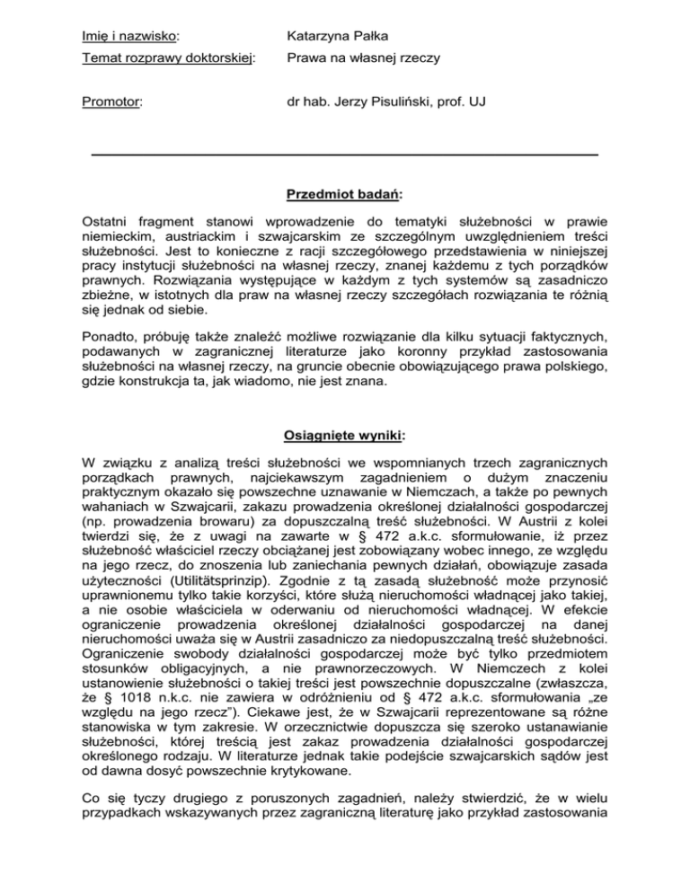 Imię i nazwisko: Katarzyna Pałka Temat rozprawy doktorskiej: Prawa na własnej rzeczy Promotor: dr hab. Jerzy Pisuliński, prof. UJ _________________________________________________ Przedmiot badań: Ostatni fragment stanowi wprowadzenie do tematyki służebności w prawie niemieckim, austriackim i szwajcarskim ze szczególnym uwzględnieniem treści służebności. Jest to konieczne z racji szczegółowego przedstawienia w niniejszej pracy instytucji służebności na własnej rzeczy, znanej każdemu z tych porządków prawnych. Rozwiązania występujące w każdym z tych systemów są zasadniczo zbieżne, w istotnych dla praw na własnej rzeczy szczegółach rozwiązania te różnią się jednak od siebie. Ponadto, próbuję także znaleźć możliwe rozwiązanie dla kilku sytuacji faktycznych, podawanych w zagranicznej literaturze jako koronny przykład zastosowania służebności na własnej rzeczy, na gruncie obecnie obowiązującego prawa polskiego, gdzie konstrukcja ta, jak wiadomo, nie jest znana. Osiągnięte wyniki: W związku z analizą treści służebności we wspomnianych trzech zagranicznych porządkach prawnych, najciekawszym zagadnieniem o dużym znaczeniu praktycznym okazało się powszechne uznawanie w Niemczach, a także po pewnych wahaniach w Szwajcarii, zakazu prowadzenia określonej działalności gospodarczej (np. prowadzenia browaru) za dopuszczalną treść służebności. W Austrii z kolei twierdzi się, że z uwagi na zawarte w § 472 a.k.c. sformułowanie, iż przez służebność właściciel rzeczy obciążanej jest zobowiązany wobec innego, ze względu na jego rzecz, do znoszenia lub zaniechania pewnych działań, obowiązuje zasada użyteczności (Utilitätsprinzip). Zgodnie z tą zasadą służebność może przynosić uprawnionemu tylko takie korzyści, które służą nieruchomości władnącej jako takiej, a nie osobie właściciela w oderwaniu od nieruchomości władnącej. W efekcie ograniczenie prowadzenia określonej działalności gospodarczej na danej nieruchomości uważa się w Austrii zasadniczo za niedopuszczalną treść służebności. Ograniczenie swobody działalności gospodarczej może być tylko przedmiotem stosunków obligacyjnych, a nie prawnorzeczowych. W Niemczech z kolei ustanowienie służebności o takiej treści jest powszechnie dopuszczalne (zwłaszcza, że § 1018 n.k.c. nie zawiera w odróżnieniu od § 472 a.k.c. sformułowania „ze względu na jego rzecz”). Ciekawe jest, że w Szwajcarii reprezentowane są różne stanowiska w tym zakresie. W orzecznictwie dopuszcza się szeroko ustanawianie służebności, której treścią jest zakaz prowadzenia działalności gospodarczej określonego rodzaju. W literaturze jednak takie podejście szwajcarskich sądów jest od dawna dosyć powszechnie krytykowane. Co się tyczy drugiego z poruszonych zagadnień, należy stwierdzić, że w wielu przypadkach wskazywanych przez zagraniczną literaturę jako przykład zastosowania konstrukcji praw na własnej rzeczy, można by na gruncie prawa polskiego osiągnąć ten sam rezultat bez konieczności stosowania tej konstrukcji. Powstaje jednak pytanie, czy konstrukcja praw na własnej rzeczy nie jest mimo wszystko prostsza niż przedstawione rozwiązanie, za pomocą którego można zrealizować te same cele gospodarcze, pozostając w prawdzie w zgodzie z rzymską zasadą konsolidacji, ale jednocześnie napotykając na problemy konstrukcyjne na innym poziomie.