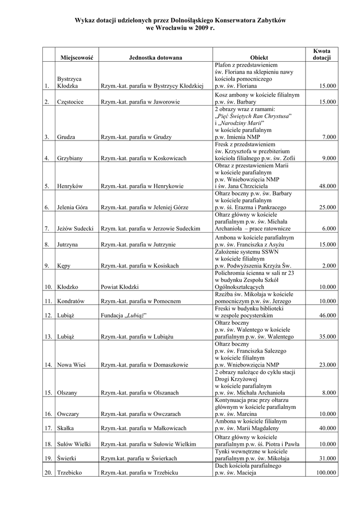 Wykaz dotacji udzielonych przez Dolnośląskiego Konserwatora Zabytków we Wrocławiu w 2009 r. Miejscowość Jednostka dotowana 1. Bystrzyca Kłodzka Rzym.-kat. parafia w Bystrzycy Kłodzkiej 2. Częstocice Rzym.-kat. parafia w Jaworowie 3. Grudza Rzym.-kat. parafia w Grudzy 4. Grzybiany Rzym.-kat. parafia w Koskowicach 5. Henryków Rzym.-kat. parafia w Henrykowie 6. Jelenia Góra Rzym.-kat. parafia w Jeleniej Górze 7. Jeżów Sudecki Rzym. kat. parafia w Jerzowie Sudeckim 8. Jutrzyna Rzym.-kat. parafia w Jutrzynie 9. Kępy Rzym.-kat. parafia w Kosiskach 10. Kłodzko Powiat Kłodzki 11. Kondratów Rzym.-kat. parafia w Pomocnem 12. Lubiąż Fundacja „Lubiąż” 13. Lubiąż Rzym.-kat. parafia w Lubiążu 14. Nowa Wieś Rzym.-kat. parafia w Domaszkowie 15. Olszany Rzym.-kat. parafia w Olszanach 16. Owczary Rzym.-kat. parafia w Owczarach 17. Skałka Rzym.-kat. parafia w Małkowicach 18. Sułów Wielki Rzym.-kat. parafia w Sułowie Wielkim 19. Świerki Rzym.kat. parafia w Świerkach 20. Trzebicko Rzym.-kat. parafia w Trzebicku Obiekt Plafon z przedstawieniem św. Floriana na sklepieniu nawy kościoła pomocniczego p.w. św. Floriana Kosz ambony w kościele filialnym p.w. św. Barbary 2 obrazy wraz z ramami: „Pięć Świętych Ran Chrystusa” i „Narodziny Marii” w kościele parafialnym p.w. Imienia NMP Fresk z przedstawieniem św. Krzysztofa w prezbiterium kościoła filialnego p.w. św. Zofii Obraz z przestawieniem Marii w kościele parafialnym p.w. Wniebowzięcia NMP i św. Jana Chrzciciela Ołtarz boczny p.w. św. Barbary w kościele parafialnym p.w. śś. Erazma i Pankracego Ołtarz główny w kościele parafialnym p.w. św. Michała Archanioła – prace ratownicze Ambona w kościele parafialnym p.w. św. Franciszka z Asyżu Założenie systemu SSWN w kościele filialnym p.w. Podwyższenia Krzyża Św. Polichromia ścienna w sali nr 23 w budynku Zespołu Szkół Ogólnokształcących Rzeźba św. Mikołaja w kościele pomocniczym p.w. św. Jerzego Freski w budynku biblioteki w zespole pocysterskim Ołtarz boczny p.w. św. Walentego w kościele parafialnym p.w. św. Walentego Ołtarz boczny p.w. św. Franciszka Salezego w kościele filialnym p.w. Wniebowzięcia NMP 2 obrazy należące do cyklu stacji Drogi Krzyżowej w kościele parafialnym p.w. św. Michała Archanioła Kontynuacja prac przy ołtarzu głównym w kościele parafialnym p.w. św. Marcina Ambona w kościele filialnym p.w. św. Marii Magdaleny Ołtarz główny w kościele parafialnym p.w. śś. Piotra i Pawła Tynki wewnętrzne w kościele parafialnym p.w. św. Mikołaja Dach kościoła parafialnego p.w. św. Macieja Kwota dotacji 15.000 15.000 7.000 9.000 48.000 25.000 6.000 15.000 2.000 10.000 10.000 46.000 35.000 23.000 8.000 10.000 40.000 10.000 31.000 100.000 21. Turów Rzym.-kat. parafia w Turowie 22. Wszechświęte Rzym.-kat. parafia w Solnikach Wielkich Ząbkowice 23. Śląskie Gmina Ząbkowice Śląskie Rzeźba Madonny z Dzieciątkiem z ołtarza głównego w kościele parafialnym p.w. Narodzenia NMP Chrzcielnica w kościele filialnym p.w. MB Częstochowskiej Rzeźba przydrożna MB z Dzieciątkiem w Ząbkowicach Śląskich Razem: 7.000 8.000 10.000 490.000