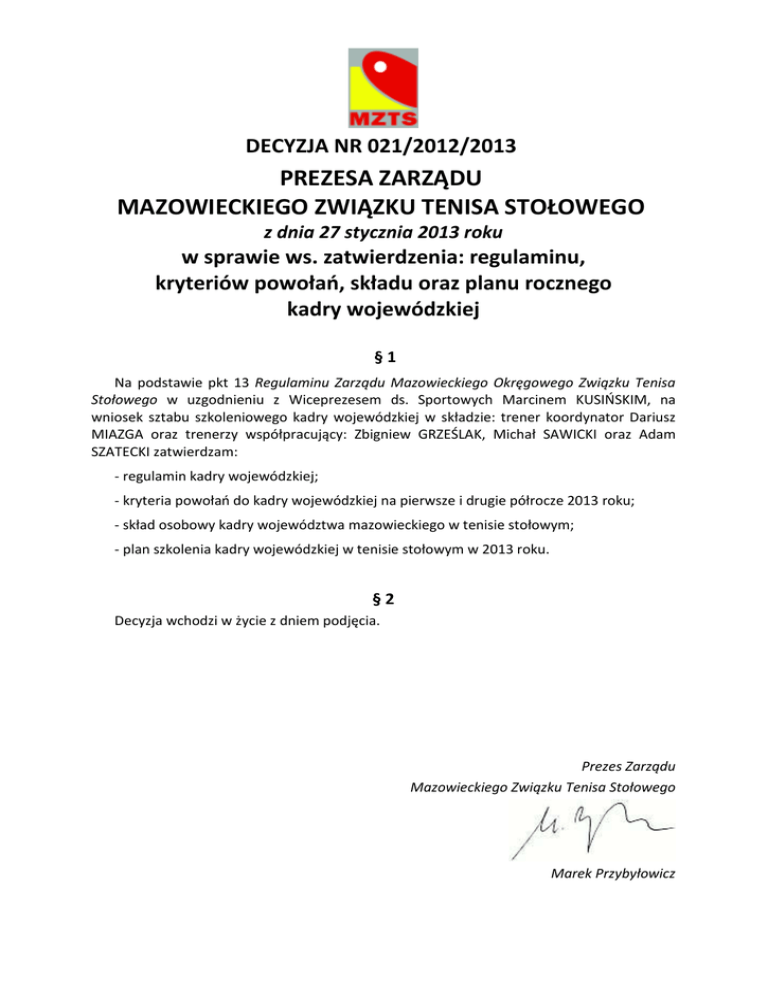 prezesa zarządu mazowieckiego związku tenisa stołowego