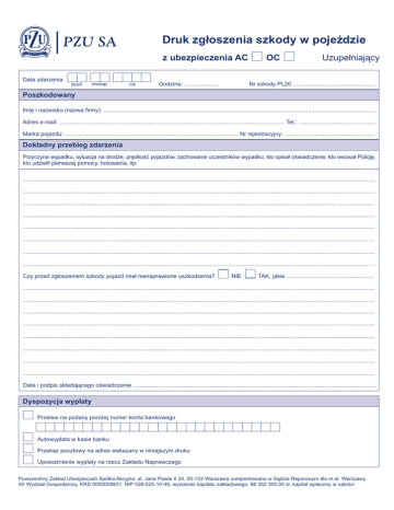 Druk zgłoszenia szkody w pojeździe z ubezpieczenia AC Data zdarzenia dzień miesiąc rok Godzina: ..................... OC Uzupełniający Nr szkody PL20 .................................................. Poszkodowany Imię i nazwisko (nazwa firmy): ..................................................................................................................................................................... Adres e-mail: ........................................................................................................................................ Tel.: .............................................. Marka pojazdu: ......................................................................................................... Nr rejestracyjny: ....................................................... Dokładny przebieg zdarzenia Przyczyna wypadku, sytuacja na drodze, prędkość pojazdów, zachowanie uczestników wypadku, kto spisał oświadczenie, kto wezwał Policję, kto udzielił pierwszej pomocy, holowania, itp. ..................................................................................................................................................................................................................... ..................................................................................................................................................................................................................... ..................................................................................................................................................................................................................... ..................................................................................................................................................................................................................... ..................................................................................................................................................................................................................... ..................................................................................................................................................................................................................... ..................................................................................................................................................................................................................... ..................................................................................................................................................................................................................... Czy przed zgłoszeniem szkody pojazd miał nienaprawione uszkodzenia? NIE TAK, jakie ..................................................... ..................................................................................................................................................................................................................... ..................................................................................................................................................................................................................... ..................................................................................................................................................................................................................... ..................................................................................................................................................................................................................... ..................................................................................................................................................................................................................... ..................................................................................................................................................................................................................... ..................................................................................................................................................................................................................... ..................................................................................................................................................................................................................... Data i podpis składającego oświadczenie ................................................................................................................................................... Dyspozycja wypłaty Przelew na podany poniżej numer konta bankowego Autowypłata w kasie banku Przekaz pocztowy na adres wskazany w niniejszym druku Upoważnienie wypłaty na rzecz Zakładu Naprawczego Powszechny Zakład Ubezpieczeń Spółka Akcyjna, al. Jana Pawła II 24, 00-133 Warszawa zarejestrowana w Sądzie Rejonowym dla m.st. Warszawy XII Wydział Gospodarczy, KRS 0000009831, NIP 526-025-10-49, wysokość kapitału zakładowego: 86 352 300,00 zł, kapitał wpłacony w całości Oświadczenie właściciela pojazdu poszkodowanego Oświadczam, że: 1) Pojazd został użyty w dniu zdarzenia za moją zgodą i wiedzą. 2) Z tytułu zaistniałej szkody nie otrzymałem(am) odszkodowania z innego zakładu ubezpieczeń i nie ubiegam się o odszkodowanie w innym zakładzie ubezpieczeń lub innej jednostce PZU SA. 3) Jestem/nie jestem* płatnikiem podatku VAT. 4) Po zakupie pojazdu dokonałem(am)/nie dokonałem(am)* odliczenia podatku VAT naliczonego przy jego zakupie. 5) Samochód, w którym powstała szkoda jest/nie jest* ubezpieczony w innym zakładzie ubezpieczeń; w przypadku zaznaczenia odpowiedzi jest", na podstawie przepisu art. 8241 § 2 kodeksu cywilnego, prosimy o wypełnienie poni