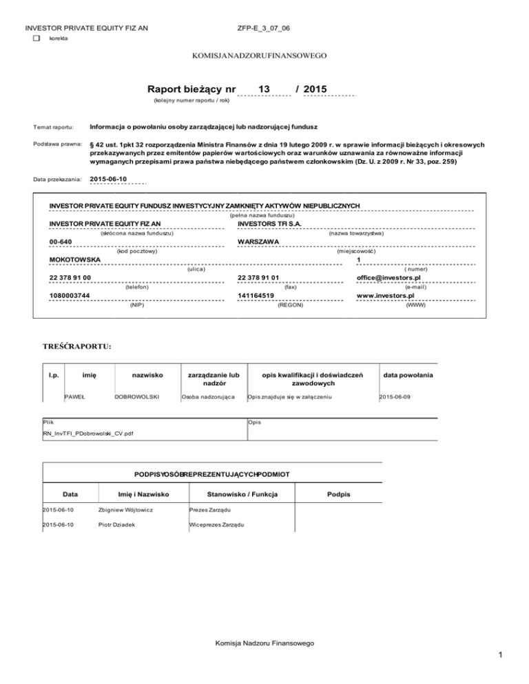 INVESTOR PRIVATE EQUITY FIZ AN ZFP-E_3_07_06 korekta KOMISJA NADZORU FINANSOWEGO Raport bieżący nr 13 / 2015 (kolejny numer raportu / rok) Temat raportu: Informacja o powołaniu osoby zarządzającej lub nadzorującej fundusz Podstawa prawna: § 42 ust. 1pkt 32 rozporządzenia Ministra Finansów z dnia 19 lutego 2009 r. w sprawie informacji bieżących i okresowych przekazywanych przez emitentów papierów wartościowych oraz warunków uznawania za równoważne informacji wymaganych przepisami prawa państwa niebędącego państwem członkowskim (Dz. U. z 2009 r. Nr 33, poz. 259) Data przekazania: 2015-06-10 INVESTOR PRIVATE EQUITY FUNDUSZ INWESTYCYJNY ZAMKNIĘTY AKTYWÓW NIEPUBLICZNYCH (pełna nazwa funduszu) INVESTOR PRIVATE EQUITY FIZ AN INVESTORS TFI S.A. (skróc ona nazwa funduszu) (nazwa towarzystwa) 00-640 WARSZAWA (kod poc ztowy) (miejscowość) MOKOTOWSKA 1 (ulica) ( numer) 22 378 91 00 22 378 91 01 (telefon) [email protected] (fax) 1080003744 (e-mail) www.investors.pl 141164519 (NIP) (REGON) (WWW) TREŚĆRAPORTU: l.p. imię PAWEŁ nazwisko DOBROWOLSKI opis kwalifikacji i doświadczeń zawodowych zarządzanie lub nadzór Osoba nadzorując a Plik Opis znajduje się w załączeniu data powołania 2015-06-09 Opis RN_InvTFI_PDobrowolski_CV.pdf PODPISYOSÓBREPREZENTUJĄCYCHPODMIOT Data Imię i Nazwisko Stanowisko / Funkcja 2015-06-10 Zbigniew Wójtowicz Prezes Zarządu 2015-06-10 Piotr Dziadek Wic eprezes Zarządu Podpis Komisja Nadzoru Finansowego 1 PAWEŁ DOBROWOLSKI DOŚWIADCZENIE ZAWODOWE Czerwiec 2011 – Wrzesień 2013 Prezes Forum Obywatelskiego Rozwoju Partner TRIGON Dyrektor WARSAW EQUITY MANAGEMENT Sierpień 2000 - Lipiec 2001 Associate ADVENT INTERNATIONAL Sierpień 1999 - Lipiec 2000 Executive DEUTSCHE MORGAN GRENFELL Sierpień 1995 - Lipiec 1999 Research Assistant JEFFREY SACHS AND ASSOCIATES Sierpień 2001 – Marzec 2009 Wrzesień 1989 - Sierpień 1991 CZŁONKOSTWO W RADACH NADZORCZYCH DOM INWESTYCYJNY INVESTORS 2012 – obecnie PERŁA BROWARY LUBELSKIE 2010 – 2012 AMG.net 2004 – 2006 WARSAW EQUITY HOLDING 2000 – 2001 2000 HOGART WYKSZTAŁCENIE HARVARD UNIVERSITY (Massachusetts, USA). Wydział Ekonomii. 1991 - 1995 POZOSTAŁE INFORMACJE Działalność społeczna Strażak, uprawnienia ratownika medycznego, Ochotnicza Straż Pożarna Wilków Polski (2008 – Teraz) Fundacja Ius et Lex – członek zarządu (2005 – 2007) Autor koncepcji liberalizacji prawa upadłościowego w zakresie upadłości konsumenckiej. W czerwcu 2009 opublikował raport „O potrzebie naprawy upadłości konsumenckiej w Polsce.” (Raport Instytutu Sobieskiego nr 34, czerwiec 2009 r.). Zarządzeniem ministra sprawiedliwości z dnia 14 maja 2012 r. powołany do zespołu ds. Nowelizacji Prawa Upadłościowego i Naprawczego. Koncepcja częściowo wdrożona ustawą z sierpnia 2014 o zmianie ustawy - Prawo upadłościowe i naprawcze, ustawy o Krajowym Rejestrze Sądowym oraz ustawy o kosztach sądowych w sprawach cywilnych. Autor koncepcji wprowadzenia do polskiego porządku prawnego anglosaskiej instytucji public hearing (pol. publiczne wysłuchanie ). Koncepcja została wdrożona w 2005 w uchwalonej przez Sejm ustawie lobbingowej, w 2006 w rozporządzeniu Rady Ministrów (Dz.U. 2006 nr 30 poz. 207) o przeprowadzeniu publicznego wysłuchania, oraz w 2006 w uchwale Sejmu (M.P. 2006 nr 15 poz. 194) w sprawie zmiany Regulaminu Sejmu Rzeczypospolitej Polskiej. Języki Od lata 2004 do dziś koordynuje pracę grupy Przejrzyste Media. Naszym celem jest zwiększenie ilości dobrych misyjnych programów w polskich mediach poprzez sprawne zorganizowanie mediów państwowych, a zwłaszcza poprzez konkretne i wyczerpujące zdefiniowanie misji państwa w mediach, a następnie rozliczenie polityków i mediów państwowych z realizacji misji. W roku 2006 sam złożyłem, oraz pomogłem złożyć stowarzyszeniu Przychodnia wniosek do Komisji Europejskiej o uznanie obecnego sposobu finansowania TVP za sprzeczny z prawem UE. Polska Fundacja Rozwoju Oświaty, Sekretarz (2001- Teraz). Wiosną 2007 w szkole w Głusku w gminie Leoncin ufundowaliśmy bibliotekę podręczników, z której uczniowie wypożyczają podręczniki na okres roku szkolnego. Harvard Club of Poland, Prezes (2000, 1999, 1998), Skarbnik (1997, 1996). Komisja d/s odbiurokratyzowania gospodarki (1997 – 1999) American Economic Association (2001 – Teraz) Polski, angielski i rosyjski.