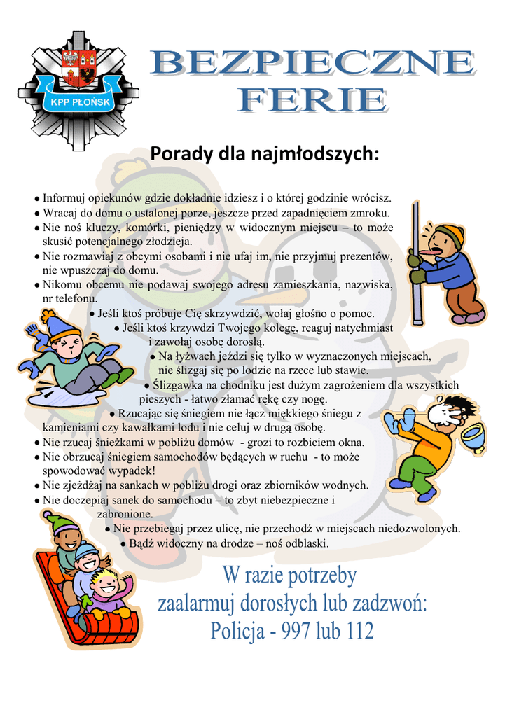 Porady dla najmłodszych: Informuj opiekunów gdzie dokładnie idziesz i o której godzinie wrócisz. Wracaj do domu o ustalonej porze, jeszcze przed zapadnięciem zmroku. Nie noś kluczy, komórki, pieniędzy w widocznym miejscu – to może skusić potencjalnego złodzieja. Nie rozmawiaj z obcymi osobami i nie ufaj im, nie przyjmuj prezentów, nie wpuszczaj do domu. Nikomu obcemu nie podawaj swojego adresu zamieszkania, nazwiska, nr telefonu. Jeśli ktoś próbuje Cię skrzywdzić, wołaj głośno o pomoc. Jeśli ktoś krzywdzi Twojego kolegę, reaguj natychmiast i zawołaj osobę dorosłą. Na łyżwach jeździ się tylko w wyznaczonych miejscach, nie ślizgaj się po lodzie na rzece lub stawie. Ślizgawka na chodniku jest dużym zagrożeniem dla wszystkich pieszych - łatwo złamać rękę czy nogę. Rzucając się śniegiem nie łącz miękkiego śniegu z kamieniami czy kawałkami lodu i nie celuj w drugą osobę. Nie rzucaj śnieżkami w pobliżu domów - grozi to rozbiciem okna. Nie obrzucaj śniegiem samochodów będących w ruchu - to może spowodować wypadek! Nie zjeżdżaj na sankach w pobliżu drogi oraz zbiorników wodnych. Nie doczepiaj sanek do samochodu – to zbyt niebezpieczne i zabronione. Nie przebiegaj przez ulicę, nie przechodź w miejscach niedozwolonych. Bądź widoczny na drodze – noś odblaski.