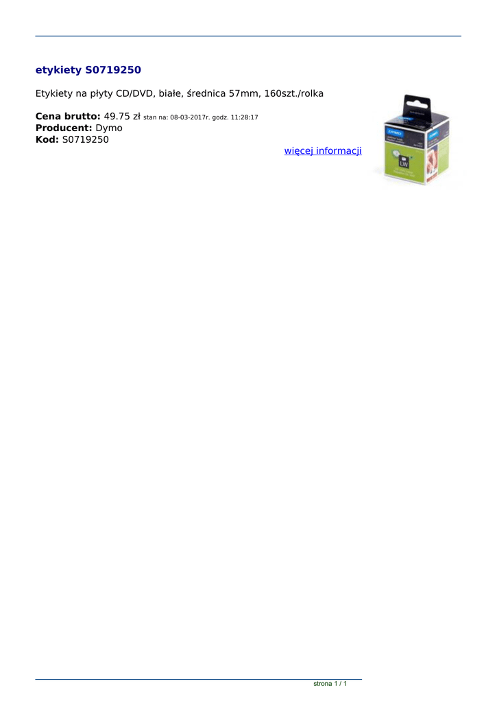 etykiety S0719250 Etykiety na płyty CD/DVD, białe, średnica 57mm, 160szt./rolka Cena brutto: 49.75 zł Producent: Dymo Kod: S0719250 stan na: 08-03-2017r. godz. 11:28:17 więcej informacji strona 1 / 1 Powered by TCPDF (www.tcpdf.org)