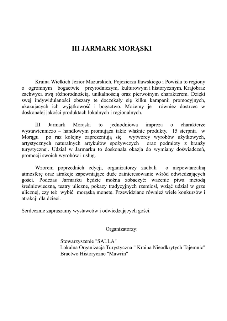 III JARMARK MORĄSKI Kraina Wielkich Jezior Mazurskich, Pojezierza Iławskiego i Powiśla to regiony o ogromnym bogactwie przyrodniczym, kulturowym i historycznym. Krajobraz zachwyca swą różnorodnością, unikalnością oraz pierwotnym charakterem. Dzięki swej indywidulaności obszary te doczekały się kilku kampanii promocyjnych, ukazujacych ich wyjątkowość i bogactwo. Możemy je również dostrzec w doskonałej jakości produktach lokalnych i regionalnych. III Jarmark Morąski to jednodniowa impreza o charakterze wystawienniczo – handlowym promująca takie właśnie produkty. 15 sierpnia w Morągu po raz kolejny zaprezentują się wytwórcy wyrobów użytkowych, artystycznych naturalnych artykułów spożywczych oraz podmioty z branży turystycznej. Udział w Jarmarku to doskonała okazja do wymiany doświadczeń, promocji swoich wyrobów i usług. Wzorem poprzednich edycji, organizatorzy zadbali o niepowtarzalną atmosferę oraz atrakcje zapewniające duże zainteresowanie wśród odwiedzających gości. Podczas Jarmarku będzie można zobaczyć: ważenie piwa metodą średniowieczną, teatry uliczne, pokazy tradycyjnych rzemiosł, wziąć udział w grze ulicznej, czy też wybić morąską monetę. Przewidziano również wiele konkursów i atrakcji dla dzieci. Serdecznie zapraszamy wystawców i odwiedzających gości. Organizatorzy: Stowarzyszenie "SALLA" Lokalna Organizacja Turystyczna " Kraina Nieodkrytych Tajemnic" Bractwo Historyczne "Mawrin"