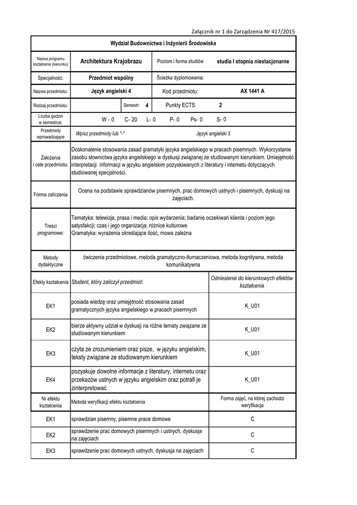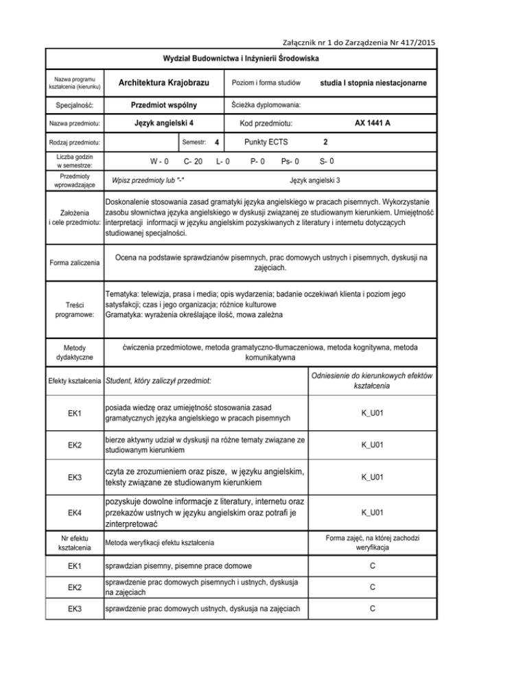 Załącznik nr 1 do Zarządzenia Nr 417/2015 Wydział Budownictwa i Inżynierii Środowiska Nazwa programu kształcenia (kierunku) Architektura Krajobrazu Poziom i forma studiów Specjalność: Przedmiot wspólny Ścieżka dyplomowania: Nazwa przedmiotu: Język angielski 4 Kod przedmiotu: Rodzaj przedmiotu: Liczba godzin w semestrze: Przedmioty wprowadzające Semestr: 4 C- 20 L- 0 W- 0 Punkty ECTS P- 0 Wpisz przedmioty lub "-" studia I stopnia niestacjonarne AX 1441 A 2 Ps- 0 S- 0 Język angielski 3 Doskonalenie stosowania zasad gramatyki języka angielskiego w pracach pisemnych. Wykorzystanie zasobu słownictwa języka angielskiego w dyskusji związanej ze studiowanym kierunkiem. Umiejętność Założenia i cele przedmiotu: interpretacji informacji w języku angielskim pozyskiwanych z literatury i internetu dotyczących studiowanej specjalności. Forma zaliczenia Treści programowe: Metody dydaktyczne Ocena na podstawie sprawdzianów pisemnych, prac domowych ustnych i pisemnych, dyskusji na zajęciach. Tematyka: telewizja, prasa i media; opis wydarzenia; badanie oczekiwań klienta i poziom jego satysfakcji; czas i jego organizacja; różnice kulturowe Gramatyka: wyrażenia określające ilość, mowa zależna ćwiczenia przedmiotowe, metoda gramatyczno-tłumaczeniowa, metoda kognitywna, metoda komunikatywna Efekty kształcenia Student, który zaliczył przedmiot: Odniesienie do kierunkowych efektów kształcenia EK1 posiada wiedzę oraz umiejętność stosowania zasad gramatycznych języka angielskiego w pracach pisemnych K_U01 EK2 bierze aktywny udział w dyskusji na różne tematy związane ze studiowanym kierunkiem K_U01 EK3 czyta ze zrozumieniem oraz pisze, w języku angielskim, teksty związane ze studiowanym kierunkiem K_U01 EK4 pozyskuje dowolne informacje z literatury, internetu oraz przekazów ustnych w języku angielskim oraz potrafi je zinterpretować K_U01 Nr efektu kształcenia Metoda weryfikacji efektu kształcenia Forma zajęć, na której zachodzi weryfikacja EK1 sprawdzian pisemny, pisemne prace domowe C EK2 sprawdzenie prac domowych pisemnych i ustnych, dyskusja na zajęciach C EK3 sprawdzenie prac domowych ustnych, dyskusja na zajęciach C Bilans nakładu pracy studenta (w godzinach) EK4 Wskaźniki ilościowe sprawdzian pisemny, sprawdzenie prac domowych pisemnych i ustnych, dyskusja na zajęciach C Udział w zajęciach 20 Udział w konsultacjach związanych z ćwiczeniami 5 Wykonanie prac domowych i przygotowanie się do testów 25 RAZEM: 50 ECTS Nakład pracy studenta związany z zajęciami wymagającymi bezpośredniego udziału nauczyciela: 25 1 Nakład pracy studenta związany z zajęciami o charakterze praktycznym: 50 2 Literatura podstawowa: 1. Eales F. : Speak out upper intermediate. Pearson Longman, 2011 2. Fisiak J., Adamska-Sałaciak A., Idzikowski M., Jagła E., Jankowski M., Lew R. : Słownik Współczesny angielsko-polski polsko-angielski. Pearson Longman, 2006 3.Hewings M. : Advanced Grammar in Use. Cambridge University Press, 2005 Literatura uzupełniająca: 1. Weber M., Brzosko Ł.. : English for engineers. Oficyna Wydawnicza Politechniki Bialostockiej, Białystok, 2010 2. Sieńko E., Bramska H. : RU read E?. Wydawnictwo Politechniki Białostockiej, Białystok, 2004. 3. Materiały własne prowadzącego (adaptowane i opracowane teksty z literatury fachowej oraz z Internetu) Jednostka realizująca: Studium Języków Obcych Data opracowania programu: 20.05.2016 mgr Anna Kalisz Program opracował(a): tytuł/stopień, imię i nazwisko