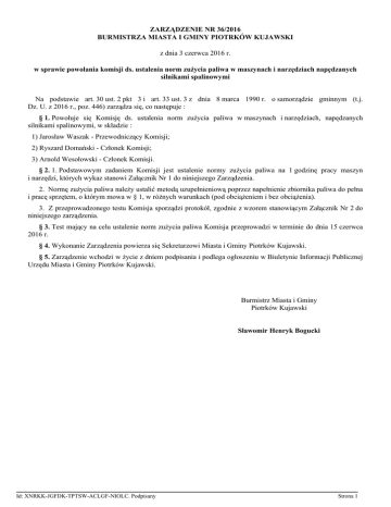 ZARZĄDZENIE NR 36/2016 BURMISTRZA MIASTA I GMINY PIOTRKÓW KUJAWSKI z dnia 3 czerwca 2016 r. w sprawie powołania komisji ds. ustalenia norm zużycia paliwa w maszynach i narzędziach napędzanych silnikami spalinowymi Na podstawie art. 30 ust. 2 pkt 3 i art. 33 ust. 3 z dnia 8 marca 1990 r. o samorządzie gminnym (t.j. Dz. U. z 2016 r., poz. 446) zarządza się, co następuje : § 1. Powołuje się Komisję ds. ustalenia norm zużycia paliwa w maszynach i narzędziach, napędzanych silnikami spalinowymi, w składzie : 1) Jarosław Waszak - Przewodniczący Komisji; 2) Ryszard Domański - Członek Komisji; 3) Arnold Wesołowski - Członek Komisji. § 2. 1. Podstawowym zadaniem Komisji jest ustalenie normy zużycia paliwa na 1 godzinę pracy maszyn i narzędzi, których wykaz stanowi Załącznik Nr 1 do niniejszego Zarządzenia. 2. Normę zużycia paliwa należy ustalić metodą uzupełnieniową poprzez napełnienie zbiornika paliwa do pełna i pracę sprzętem, o którym mowa w § 1, w różnych warunkach (pod obciążeniem i bez obciążenia). 3. Z przeprowadzonego testu Komisja sporządzi protokół, zgodnie z wzorem stanowiącym Załącznik Nr 2 do niniejszego zarządzenia. § 3. Test mający na celu ustalenie norm zużycia paliwa Komisja przeprowadzi w terminie do dnia 15 czerwca 2016 r. § 4. Wykonanie Zarządzenia powierza się Sekretarzowi Miasta i Gminy Piotrków Kujawski. § 5. Zarządzenie wchodzi w życie z dniem podpisania i podlega ogłoszeniu w Biuletynie Informacji Publicznej Urzędu Miasta i Gminy Piotrków Kujawski. Burmistrz Miasta i Gminy Piotrków Kujawski Sławomir Henryk Bogucki Id: XNRKK-JGFDK-TPTSW-ACLGF-NIOLC. Podpisany Strona 1 Załącznik Nr 1 do Zarządzenia Nr 36/2016 Burmistrza Miasta i Gminy Piotrków Kujawski z dnia 3 czerwca 2016 r. Wykaz maszyn i narzędzi, napędzanych silnikami spalinowymi Lp. Nazwa urządzenia Typ / Model 1. Kosa spalinowa Ms 230 2. Kosa spalinowa Fs 360 3. Kosa spalinowa Fs 460 4. Kosiarka do trawy „Agroma” 5. Kosiarka do trawy Alko 523 VS 6. Kosiarka do trawy Alko Power Line 5200BR Performance 7. Kosiarka spalinowa Dekatch GT 300 8. Kosa spalinowa 9. Kosiarka do trawy 10. Kosiarka samobieżna Id: XNRKK-JGFDK-TPTSW-ACLGF-NIOLC. Podpisany Stihl FS 260 C Faworyt CJ 20G4N1B675DL WOLF GARTEN EXPERT 105.220H Strona 1 Załącznik Nr 2 do Zarządzenia Nr 36/2016 Burmistrza Miasta i Gminy Piotrków Kujawski z dnia 3 czerwca 2016 r. Protokół Sporządzony w dniu ………………………….na okoliczność ustalenia normy zużycia paliwa Komisja w składzie : 1. Jarosław Waszak – Przewodniczący Komisji 2. Ryszard Domański – Członek Komisji 3. Arnold Wesołowski – Członek Komisji dokonała ustalenia zużycia paliwa w przeliczeniu na 1 godzinę pracy n/w sprzętu silnikowego ………………………………………………………………………………………………….. Dla ustalenia zużycia paliwa pozwolił test przeprowadzony w dniu ………………………….. Przed rozpoczęciem testu zbiornik paliwa zatankowano do pełna. Test trwał od godz. …………………. do godz. ……………………. Na koniec testu zbiornik paliwa zatankowano do pełna, tj. ……………….. Stwierdzono, iż zużycie paliwa w przeliczeniu na 1 godzinę pracy sprzętu w zmiennych warunkach wyniosło : ………….. Podpisy członków Komisji 1. …………………………………. 2. …………………………………. 3. …………………………………. Zatwierdzam normę zużycia paliwa wg ustaleń komisji ……………………………………… (data i podpis) Id: XNRKK-JGFDK-TPTSW-ACLGF-NIOLC. Podpisany Strona 1