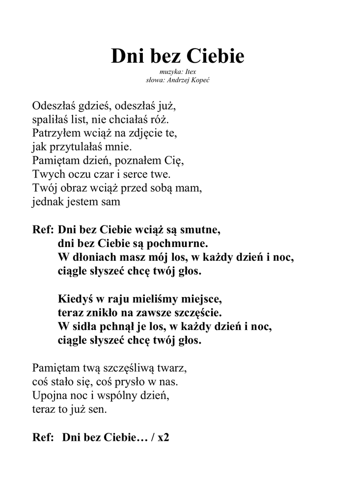 Dni bez Ciebie muzyka: Itex słowa: Andrzej Kopeć Odeszłaś gdzieś, odeszłaś już, spaliłaś list, nie chciałaś róż. Patrzyłem wciąż na zdjęcie te, jak przytulałaś mnie. Pamiętam dzień, poznałem Cię, Twych oczu czar i serce twe. Twój obraz wciąż przed sobą mam, jednak jestem sam Ref: Dni bez Ciebie wciąż są smutne, dni bez Ciebie są pochmurne. W dłoniach masz mój los, w każdy dzień i noc, ciągle słyszeć chcę twój głos. Kiedyś w raju mieliśmy miejsce, teraz znikło na zawsze szczęście. W sidła pchnął je los, w każdy dzień i noc, ciągle słyszeć chcę twój głos. Pamiętam twą szczęśliwą twarz, coś stało się, coś prysło w nas. Upojna noc i wspólny dzień, teraz to już sen. Ref: Dni bez Ciebie… / x2
