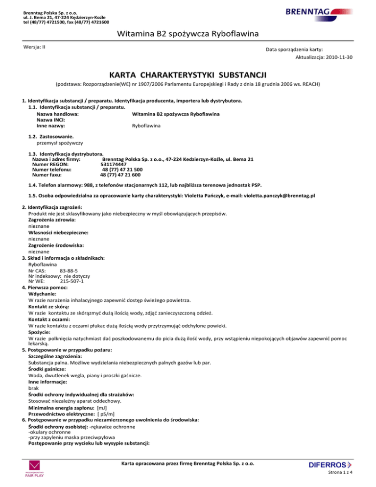 Brenntag Polska Sp. z o.o. ul. J. Bema 21, 47-224 Kędzierzyn-Koźle tel (48/77) 4721500, fax (48/77) 4721600 Witamina B2 spożywcza Ryboflawina Wersja: II Data sporządzenia karty: __________ Aktualizacja: 2010-11-30 KARTA CHARAKTERYSTYKI SUBSTANCJI (podstawa: Rozporządzenie(WE) nr 1907/2006 Parlamentu Europejskiegi i Rady z dnia 18 grudnia 2006 ws. REACH) 1. Identyfikacja substancji / preparatu. Identyfikacja producenta, importera lub dystrybutora. 1.1. Identyfikacja substancji / preparatu. Nazwa handlowa: Witamina B2 spożywcza Ryboflawina Nazwa INCI: Inne nazwy: Ryboflawina 1.2. Zastosowanie. przemysł spożywczy 1.3. Identyfikacja dystrybutora. Nazwa i adres firmy: Brenntag Polska Sp. z o.o., 47-224 Kedzierzyn-Koźle, ul. Bema 21 Numer REGON: 531174447 Numer telefonu: 48 (77) 47 21 500 Numer faxu: 48 (77) 47 21 600 1.4. Telefon alarmowy: 988, z telefonów stacjonarnych 112, lub najbliższa terenowa jednostak PSP. 1.5. Osoba odpowiedzialna za opracowanie karty charakterystyki: Violetta Pańczyk, e-mail: [email protected] 2. Identyfikacja zagrożeń: Produkt nie jest sklasyfikowany jako niebezpieczny w myśl obowiązujących przepisów. Zagrożenia zdrowia: nieznane Własności niebezpieczne: nieznane Zagrożenie środowiska: nieznane 3. Skład i informacja o składnikach: Ryboflawina Nr CAS: 83-88-5 Nr indeksowy: nie dotyczy Nr WE: 215-507-1 4. Pierwsza pomoc: Wdychanie: W razie narażenia inhalacyjnego zapewnić dostęp świeżego powietrza. Kontakt ze skórą: W razie kontaktu ze skórązmyć dużą ilością wody, zdjąć zanieczyszczoną odzież. Kontakt z oczami: W razie kontaktu z oczami płukac dużą ilością wody przytrzymująć odchylone powieki. Spożycie: W razie polknięcia natychmiast dać poszkodowanemu do picia dużą ilość wody, przy wstąpieniu niepokojących objawów zapewnić pomoc lekarską. 5. Postępowanie w przypadku pożaru: Szczególne zagrożenia: Substancja palna. Możliwe wydzielania niebezpiecznych palnych gazów lub par. Środki gaśnicze: Woda, dwutlenek wegla, piany i proszki gaśnicze. Inne informacje: brak Środki ochrony indywidualnej dla strażaków: Stosować niezależny aparat oddechowy. Minimalna energia zapłonu: [mJ] Przewodnictwo elektryczne: [ pS/m] 6. Postępowanie w przypadku niezamierzonego uwolnienia do środowiska: Środki ochrony osobistej: -rękawice ochronne -okulary ochronne -przy zapyleniu maska przeciwpyłowa Postępowanie przy wycieku lub wysypie substancji: Karta opracowana przez firmę Brenntag Polska Sp. z o.o. Strona 1 z 4 Brenntag Polska Sp. z o.o. ul. J. Bema 21, 47-224 Kędzierzyn-Koźle tel (48/77) 4721500, fax (48/77) 4721600 Witamina B2 spożywcza Ryboflawina Unikać wzniecania pyłu, nie wdychać pyłu. Rozsypany produkt zebrać na sucho, przekazać do usunięcia. 7. Postępowanie z substancją / preparatem i magazynowanie: Magazynowanie: Przechowywać w szczelnie zamkniętych opakowaniach w suchym miejscu. Chronić przed światłem. Postępowanie z substancją lub preparatem: Unikać wzniecania pyłu. 8. Kontrola narażenia i środki ochrony indywidualnej: Stosowane środki ochrony osobistej powinny spełniać wymogi Rozporządzenia Ministra Gospodarki z dnia 21 grudnia 2005 r. w sprawie zasadniczych wymagań dla środków ochrony indywidualnej (Dz.U. Nr 259, poz. 2173). Ochrona dróg oddechowych: przy zapyleniu - maska przeciwpyłowa Ochrona oczu: okulary lub gogle ochronne Ochrona rąk: rękawice ochronne np z kauczuku nitrylowego Techniczne środki ochronne: wetylacja pomieszczeń Inne wyposażenie ochronne: odzież ochronna Kontrola zagrożenia: NDS, NDSCh - nie ustalono (wg Rozporządzenia MPiPS z dn. 29 listopada 2002 ; Dz.U. Nr 217, poz. 1833 z późniejszymi zmianami) Zalecenia dotyczące procedury monitoringu zawartości składników niebezpiecznych w powietrzu – metodyka pomiarów: -Rozporządzenie Ministra Zdrowia z dnia 20 kwietnia 2005 r. w sprawie badań i pomiarów czynników szkodliwych dla zdrowia w środowisku pracy (Dz.U. Nr 73, poz.645) -PN-89/Z-01001/06. Ochrona czystości powietrza. Nazwy, określenia i jednostki. Terminologia dotycząca badań jakości powietrza na stanowiskach pracy. -PN Z-04008-7:2002. Ochrona czystości powietrza. Pobieranie próbek. Zasady pobierania próbek powietrza w środowisku pracy i interpretacja wyników. -PN-EN-689: 2002. Powietrze na stanowiskach pracy – wytyczne oceny narażenia inhalacyjnego na czynniki chemiczne przez porównanie z wartościami dopuszczalnymi i strategia pomiarowa. Uwaga: Gdy stężenie substancji jest ustalone i znane, doboru środków ochrony indywidualnej należy dokonywać z uwzględnieniem stężenia substancji występującego na danym stanowisku pracy, czasu ekspozycji oraz czynności wykonywanych przez pracownika. W sytuacji awaryjnej, jeżeli stężenie substancji na stanowisku pracy nie jest znane, stosować środki ochrony indywidualnej o najwyższej zalecanej klasie ochrony. Pracodawca jest obowiązany zapewnić, aby stosowane środki ochrony indywidualnej oraz odzież i obuwie robocze posiadały właściwości ochronne i użytkowe oraz zapewnić odpowiednie ich pranie, konserwacje, naprawę i odkażanie. Zalecane badania wstępne i okresowe pracowników należy przeprowadzać zgodnie z Rozporządzeniem Ministra Zdrowia i Opieki Społecznej z dnia 30 maja 1996 r. w sprawie przeprowadzania badań lekarskich pracowników, zakresu profilaktycznej opieki zdrowotnej nad pracownikami oraz orzeczeń lekarskich wydanych do celów przewidzianych w Kodeksie Pracy (Dz.U. Nr 69/1996r. poz. 332, ze zmianami Dz.U. Nr 37/2001r. poz. 451) 9. Właściwości fizyczne i chemiczne: Ogólne właściwości: -Ciało stałe, krystaliczny proszek -barwy żółtopomarańczowej Temperatura zapłonu, [°C] brak danych Temperatura samozapłonu, [°C] nie dotyczy Górna granica wybuchowości, [% V/V] Dolna granica wybuchowości, [% V/V] nie dotyczy Masa cząsteczkowa 376,37 Temperatura topnienia, [°C] ok 280 (rozkład) Rozpuszczalność w wodzie 0,065 g/