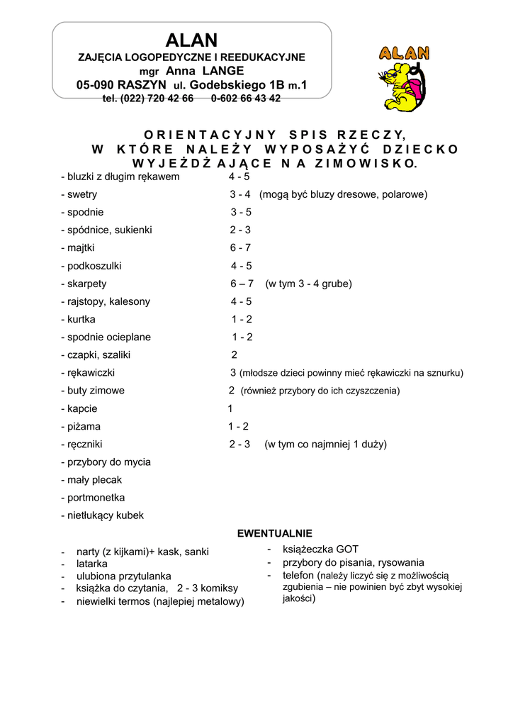 ALAN ZAJĘCIA LOGOPEDYCZNE I REEDUKACYJNE mgr Anna LANGE 05-090 RASZYN ul. Godebskiego 1B m.1 tel. (022) 720 42 66 0-602 66 43 42 W O R I E N T A C Y J N Y S P I S R Z E C Z Y, KTÓRE NALEŻY WYPOSAŻYĆ DZIECKO W Y J E Ż D Ż A J Ą C E N A Z I M O W I S K O. - bluzki z długim rękawem 4-5 - swetry 3 - 4 (mogą być bluzy dresowe, polarowe) - spodnie 3-5 - spódnice, sukienki 2-3 - majtki 6-7 - podkoszulki 4-5 - skarpety 6–7 - rajstopy, kalesony 4-5 - kurtka 1-2 - spodnie ocieplane 1-2 - czapki, szaliki 2 - rękawiczki 3 (młodsze dzieci powinny mieć rękawiczki na sznurku) - buty zimowe 2 (również przybory do ich czyszczenia) - kapcie 1 - piżama 1-2 - ręczniki 2-3 (w tym 3 - 4 grube) (w tym co najmniej 1 duży) - przybory do mycia - mały plecak - portmonetka - nietłukący kubek EWENTUALNIE - narty (z kijkami)+ kask, sanki latarka ulubiona przytulanka książka do czytania, 2 - 3 komiksy niewielki termos (najlepiej metalowy) - książeczka GOT przybory do pisania, rysowania telefon (należy liczyć się z możliwością zgubienia – nie powinien być zbyt wysokiej jakości) Kieszonkowe należy dać dziecku w podpisanych kopertach - na każdy tydzień jedna. Proponuję, by kieszonkowe wahało się w granicach 50-60 zł tygodniowo. Zbyt wysokie kieszonkowe powoduje, że dzieci kupują frytki, hamburgery itp. oraz dużo słodyczy i wtedy nie zjadają posiłków. Starsze dzieci, zwłaszcza chłopcy, nieraz przeznaczają nadwyżki pieniędzy na nielegalnie kupowane piwo i papierosy. Nie należy dawać dziecku, ani pozwalać na zabieranie noży, ostro zakończonych nożyczek, petard i innych niebezpiecznych przedmiotów. Proszę też, by dzieci nie zabierały bardzo cennych gier elektronicznych, drogich zabawek i innych kosztownych przedmiotów, które łatwo mogą zostać zgubione lub ulec uszkodzeniu. Nie jest dobrze dawać dzieciom zbyt dużo rzeczy, ponieważ utrudnia im to utrzymanie porządku. Dotyczy to zarówno ubrań, jak też zabawek, sprzętu grającego itp. Autokar zostanie podstawiony w dniu rozpoczęcia turnusu: o godz. 8.00 w Warszawie przy Al. Krakowskiej 102/114 (parking przy markecie OBI) (odjazd nie później niż o 8.30) - o godz. 8.35 w Raszynie przy ul. Godebskiego 1 (odjazd nie później niż o 8.50). Rodziny dojeżdżające we własnym zakresie mogą zgłaszać się w ośrodku od godz. 14. Autokar dojedzie na miejsce około godz. 16. Pierwszy planowany posiłek to obiadokolacja o godz. 18. Całość opłaty należy wnieść oraz odesłać „Kartę kolonijną” nie później niż 14 dni przed rozpoczęciem turnusu. Konto, na które należy dokonać wpłaty: "ALAN" - Anna Lange ul. Godebskiego 1 B m.1 05-090 Raszyn 71 1050 1025 1000 0092 0474 1061 W przypadku rezygnacji z wyjazdu później niż 14 dni przed rozpoczęciem turnusu nie podlega zwrotowi 10 % ceny. Życzę miłego pobytu Anna Lange