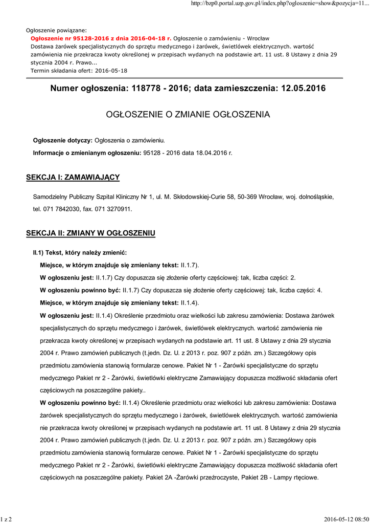 1z2 http://bzp0.portal.uzp.gov.pl/index.php?ogloszenie=show&pozycja=11... Ogłoszenie powiązane: Ogłoszenie nr 95128-2016 z dnia 2016-04-18 r. Ogłoszenie o zamówieniu - Wrocław Dostawa żarówek specjalistycznych do sprzętu medycznego i żarówek, świetlówek elektrycznych. wartość zamówienia nie przekracza kwoty określonej w przepisach wydanych na podstawie art. 11 ust. 8 Ustawy z dnia 29 stycznia 2004 r. Prawo... Termin składania ofert: 2016-05-18 Numer ogłoszenia: 118778 - 2016; data zamieszczenia: 12.05.2016 OGŁOSZENIE O ZMIANIE OGŁOSZENIA Ogłoszenie dotyczy: Ogłoszenia o zamówieniu. Informacje o zmienianym ogłoszeniu: 95128 - 2016 data 18.04.2016 r. SEKCJA I: ZAMAWIAJĄCY Samodzielny Publiczny Szpital Kliniczny Nr 1, ul. M. Skłodowskiej-Curie 58, 50-369 Wrocław, woj. dolnośląskie, tel. 071 7842030, fax. 071 3270911. SEKCJA II: ZMIANY W OGŁOSZENIU II.1) Tekst, który należy zmienić: Miejsce, w którym znajduje się zmieniany tekst: II.1.7). W ogłoszeniu jest: II.1.7) Czy dopuszcza się złożenie oferty częściowej: tak, liczba części: 2. W ogłoszeniu powinno być: II.1.7) Czy dopuszcza się złożenie oferty częściowej: tak, liczba części: 4. Miejsce, w którym znajduje się zmieniany tekst: II.1.4). W ogłoszeniu jest: II.1.4) Określenie przedmiotu oraz wielkości lub zakresu zamówienia: Dostawa żarówek specjalistycznych do sprzętu medycznego i żarówek, świetlówek elektrycznych. wartość zamówienia nie przekracza kwoty określonej w przepisach wydanych na podstawie art. 11 ust. 8 Ustawy z dnia 29 stycznia 2004 r. Prawo zamówień publicznych (t.jedn. Dz. U. z 2013 r. poz. 907 z późn. zm.) Szczegółowy opis przedmiotu zamówienia stanowią formularze cenowe. Pakiet Nr 1 - Żarówki specjalistyczne do sprzętu medycznego Pakiet nr 2 - Żarówki, świetlówki elektryczne Zamawiający dopuszcza możliwość składania ofert częściowych na poszczególne pakiety.. W ogłoszeniu powinno być: II.1.4) Określenie przedmiotu oraz wielkości lub zakresu zamówienia: Dostawa żarówek specjalistycznych do sprzętu medycznego i żarówek, świetlówek elektrycznych. wartość zamówienia nie przekracza kwoty określonej w przepisach wydanych na podstawie art. 11 ust. 8 Ustawy z dnia 29 stycznia 2004 r. Prawo zamówień publicznych (t.jedn. Dz. U. z 2013 r. poz. 907 z późn. zm.) Szczegółowy opis przedmiotu zamówienia stanowią formularze cenowe. Pakiet Nr 1 - Żarówki specjalistyczne do sprzętu medycznego Pakiet nr 2 - Żarówki, świetlówki elektryczne Zamawiający dopuszcza możliwość składania ofert częściowych na poszczególne pakiety. Pakiet 2A -Żarówki przeźroczyste, Pakiet 2B - Lampy rtęciowe. 2016-05-12 08:50 2z2 http://bzp0.portal.uzp.gov.pl/index.php?ogloszenie=show&pozycja=11... 2016-05-12 08:50