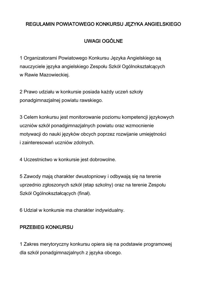 REGULAMIN POWIATOWEGO KONKURSU JĘZYKA ANGIELSKIEGO UWAGI OGÓLNE 1 Organizatorami Powiatowego Konkursu Języka Angielskiego są nauczyciele języka angielskiego Zespołu Szkół Ogólnokształcących w Rawie Mazowieckiej. 2 Prawo udziału w konkursie posiada każdy uczeń szkoły ponadgimnazjalnej powiatu rawskiego. 3 Celem konkursu jest monitorowanie poziomu kompetencji językowych uczniów szkół ponadgimnazjalnych powiatu oraz wzmocnienie motywacji do nauki języków obcych poprzez rozwijanie umiejętności i zainteresowań uczniów zdolnych. 4 Uczestnictwo w konkursie jest dobrowolne. 5 Zawody mają charakter dwustopniowy i odbywają się na terenie uprzednio zgłoszonych szkół (etap szkolny) oraz na terenie Zespołu Szkół Ogólnokształcących (finał). 6 Udział w konkursie ma charakter indywidualny. PRZEBIEG KONKURSU 1 Zakres merytoryczny konkursu opiera się na podstawie programowej dla szkół ponadgimnazjalnych z języka obcego. 2 Pierwsza część konkursu (etap szkolny) składa się z testu leksykalno – gramatycznego (60 pkt). Test rozwiązywany jest w szkołach macierzystych uczniów i przeprowadzany przez nauczycieli koordynatorów konkursu wyznaczanych przez dyrektorów szkół. 3 Koordynator powiatowego konkursu języka angielskiego odpowiedzialny jest za zapoznanie się i innych zainteresowanych nauczycieli z regulaminem konkursu i terminowe przeprowadzenie I etapu w swojej szkole. 4 Na rozwiązanie testu na poziomie szkoły przeznacza się 60 minut. Po zakończeniu tego etapu nauczyciele zobowiązani są do terminowego sprawdzenia i odesłania najlepszych prac. Przesłanie prac o których mowa nie oznacza zakwalifikowania uczniów do finału. 5 Najwyższe wyniki w danym roku szkolnym są podstawą do zakwalifikowania uczniów do finału. 6 Finał konkursu składa się wypowiedzi ustnej (20 pkt. ) Wypowiedź ustna trwa 10 min. Uczniowie losują i omawiają jeden z podanch poniżej tematów . Po zakończeniu wypowiedzi nauczyciele zadają uczniowi pytania dotyczące wypowiedzi. 7 Kryteria oceniania odpowiedzi ustnej : treść wypowiedzi 6 pkt, znajomość środków językowych 6 pkt, płynność wypowiedzi 3 pkt i rozmowa z nauczycielami wchodzącymi w skład jury 5 pkt . 8 W skład jury wchodzą nauczyciele z wszystkich szkół ponadgimnazjalnych, których uczniowie biorą udzial w konkursie. 9 Organizatorzy konkursu zastrzegają sobie prawo do dokonywania zmian w terminarzu konkursu. UPRAWNIENIA 1 Wszyscy uczniowie biorący udział w finale otrzymują pamiatkowe dyplomy. 2 Laureaci otrzymują nagrody rzeczowe ufundowane przez Starostwo Powiatowe w Rawie Mazowieckiej. TEMATY WYPOWIEDZI USTNEJ 1 What invention do you think has been the most important for people? 2 What can we do to protect the Earth? 3 What are the dangers connected with using the Internet? 4 Why do people want to work abroad? 5 What places in the English speaking countries would you recommend visiting and why?